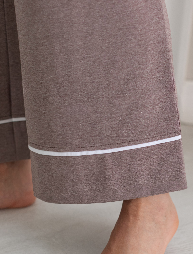 Укороченные брюки актуального темно-кофейного цвета из мягкого эластичного хлопка подарят вам комфорт в любое время дня. Прямой крой обеспечивает свободу движений и удобство при носке. Материал приятен на ощупь, хорошо пропускает воздух и позволяет коже дышать, делая эти брюки идеальным выбором для повседневной носки. Широкие брюки прекрасно подойдут на женщин с фигурой плюс сайз, на высокий рост и на девушек низкого роста, создут гармоничный образ без стеснения движений. Представлены большие размеры. Контрастный кант по низу добавляет стильный акцент и возможность сочетать с белыми футболками нашего бренда. Эти брючки идеально подойдут тем, кто ищет стильное решение с учетом комфорта и удобства, в них вы будете женственны и утонченны даже в домашней обстановке.
