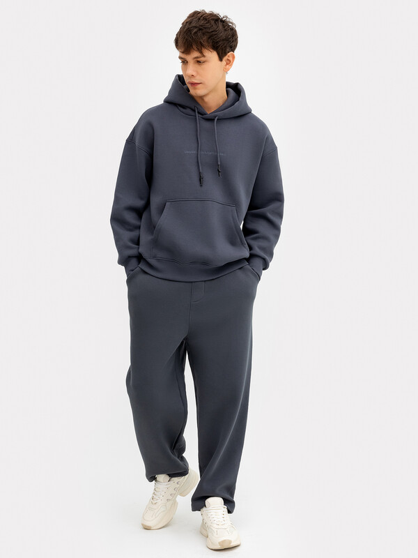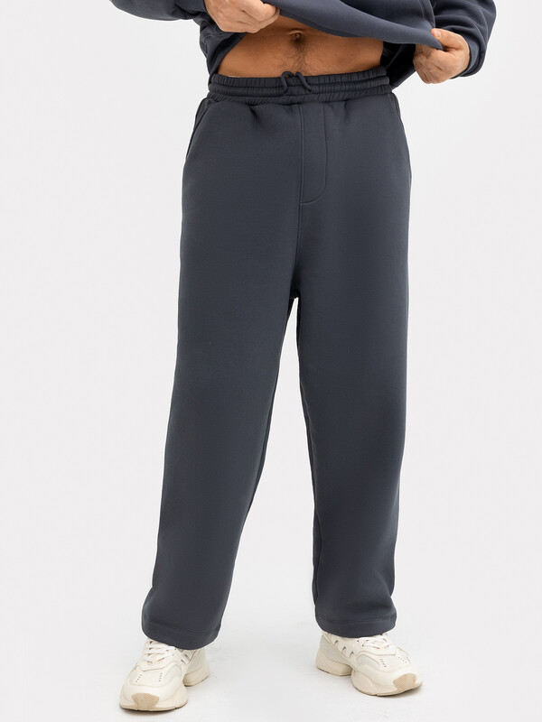 Стильные брюки мужские изготовлены из футера с подчесом. Модель прямого свободного (оверсайз) силуэта. Сидение спущено. Пояс отрезной с эластичной тесьмой внутри. С внешней стороны пояса есть петли и втянут шнур. В боковых швах обработаны карманы. Изделие без боковых швов с фигурными вертикальными рельефами. На правой задней половинке - накладной карман. Удобные и комфортные в носке, подойдут для спорта, активного отдыха, прогулок. Отлично сядут на любую мужскую фигуру. Рекомендуем!