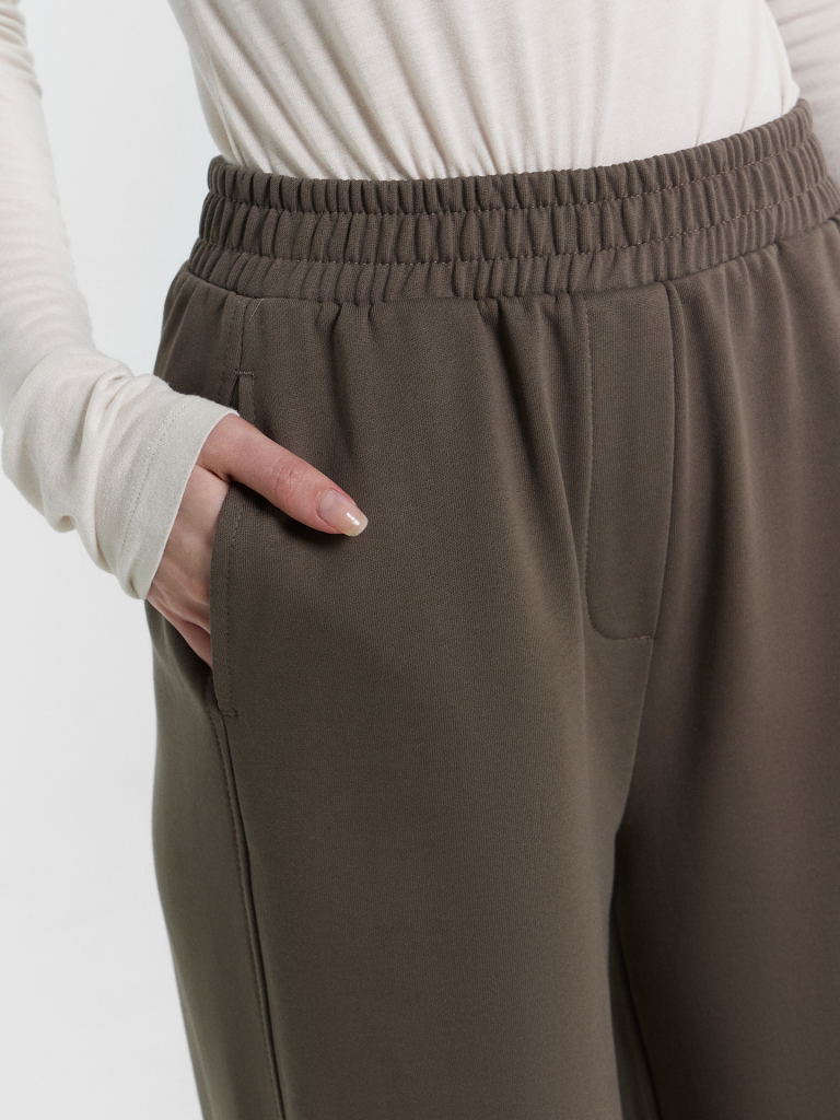 Женские брюки свободного силуэта, выполненные из футера, обеспечат вам комфорт и стиль в любое время года. Эластичный пояс гарантирует удобную посадку, а боковые карманы добавляют практичности. Нижняя часть модели оснащена кулиской, что позволяет регулировать объем брючин по вашему желанию. Эти брюки станут отличным дополнением к вашему повседневному гардеробу, создавая уютные и модные образы.