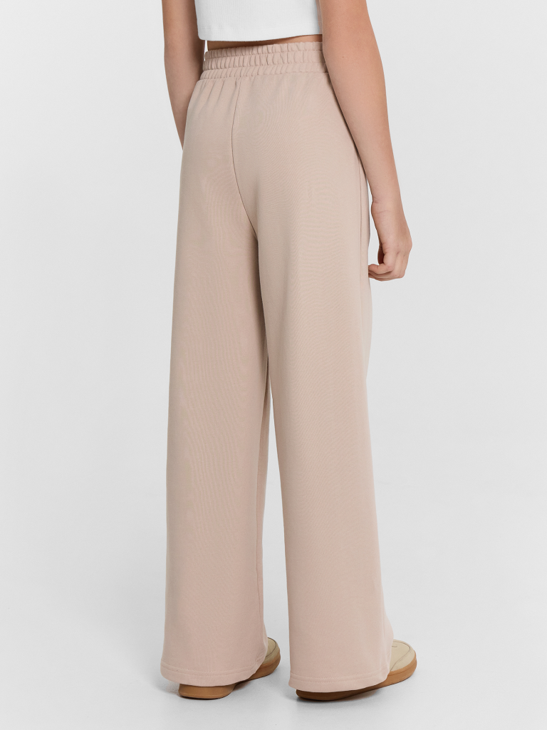 Брюки для девочек свободного силуэта. Пояс отрезной из основного полотна с эластичной тесьмой внутри 50RV. По поясу проложены отделочные строчки. Низ брюк обработан швом в подгибку.