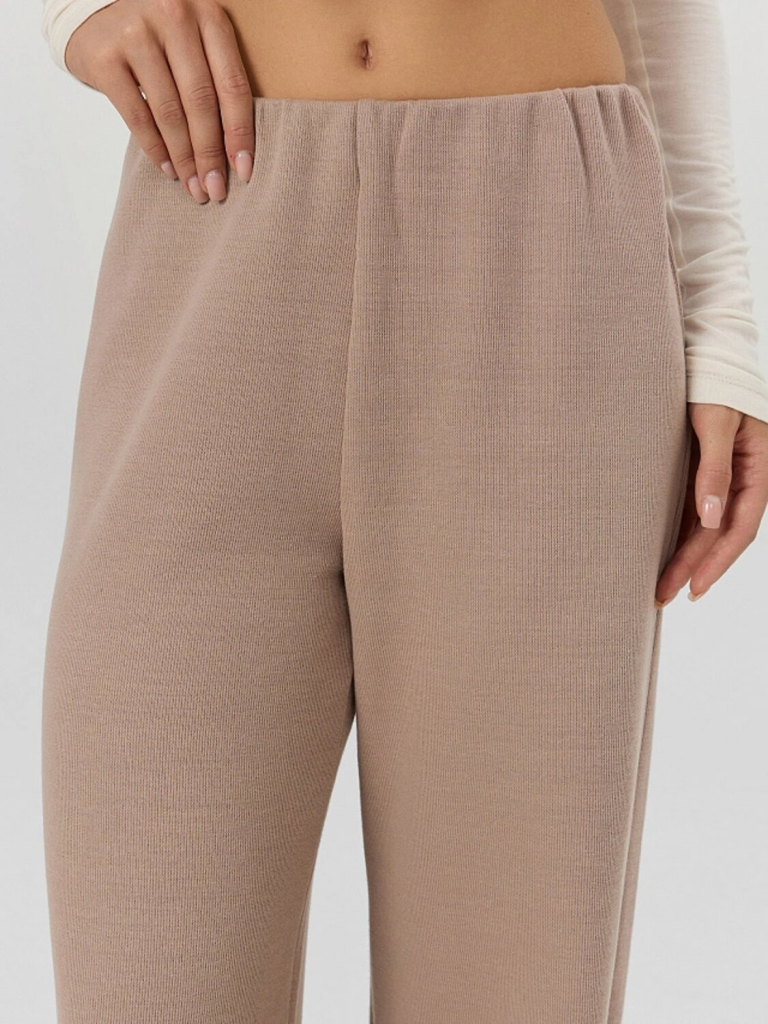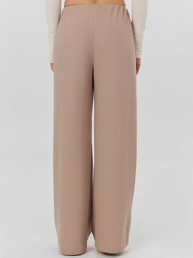Брюки с посадкой на талии свободного силуэта. Пояс цельнокроеный с резиной внутри 40RV подвернутый внутрь. Низ изделия обработан швом в подгибку.