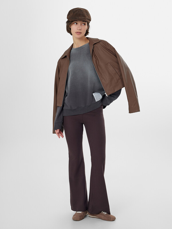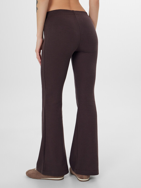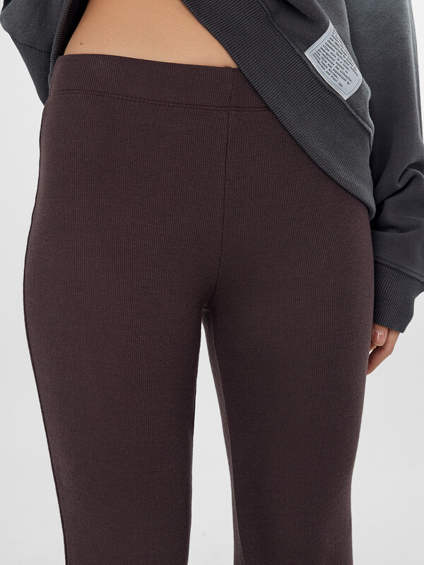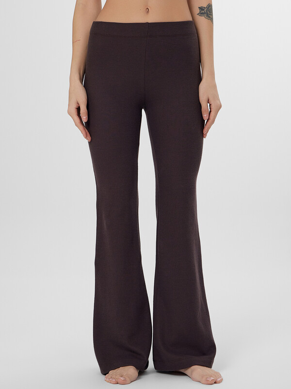 Коричневые домашние брюки для женщин из мягкого трикотажа идеально садятся по фигуре. Удобный пояс со вставкой внутри мягко фиксирует талию, не создавая дискомфорта. Брюки плотно прилегают в области бедер и плавно расширяются от колена вниз, обеспечивая полную свободу движений. Сбалансированный состав из хлопка и полиэстера сочетает лучшие свойства материалов: натуральные волокна обеспечивают воздухообмен и гигроскопичность, даря приятную прохладу в теплое время и согревая в прохладную погоду, а полиэстер укрепляет структуру ткани, предотвращая растягивание и деформацию после стирок.