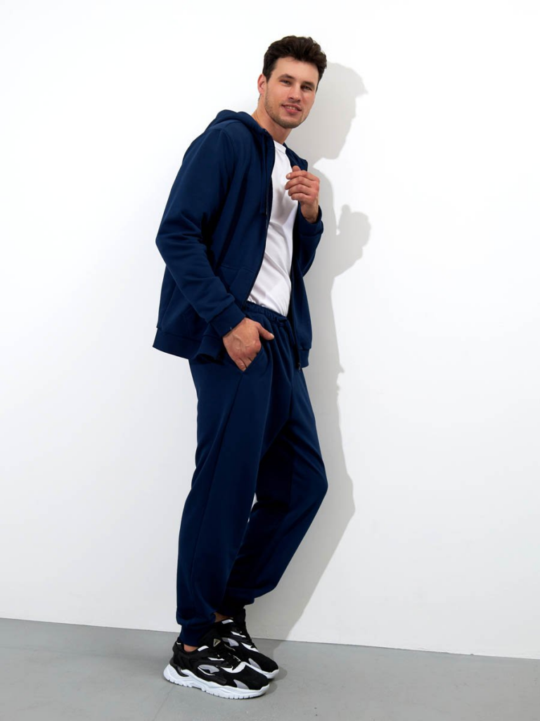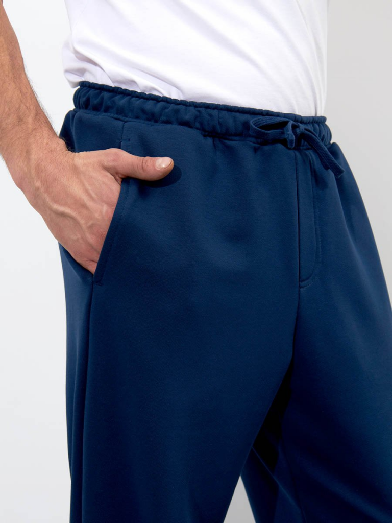 Трикотажные мужские брюки из хлопка с добавлением полиэстера, мягкие и приятные на ощупь, не сковывают движения, обеспечивая максимальный комфорт. На передних половинках вместительные карманы. По низу брюки собраны мягкой трикотажной резинкой. Пояс на резинке. Дополнительно в поясе имеется шнур.
