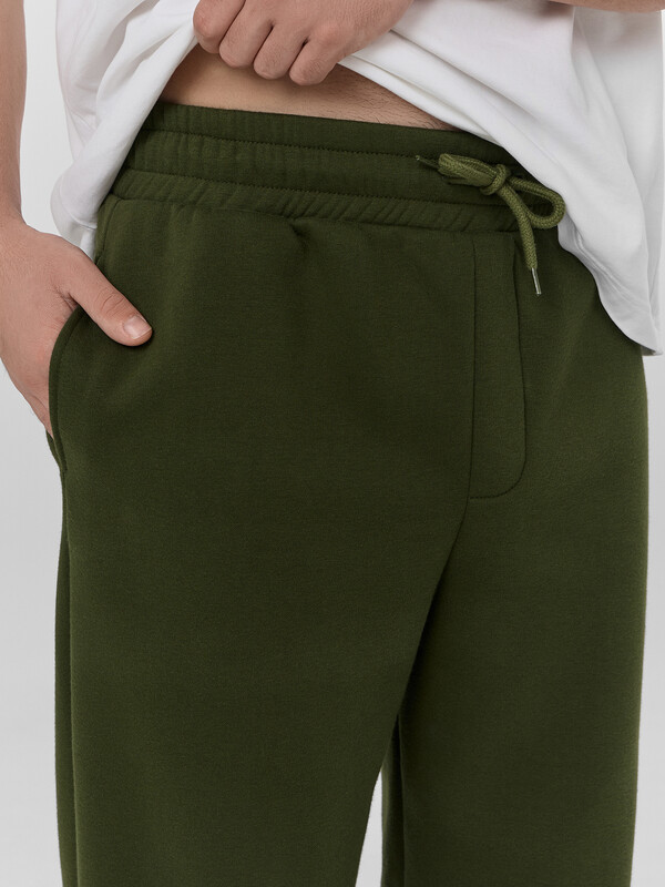 Зеленые мужские брюки прямого кроя — универсальная модель, которая особенно актуальна в осенне-зимний сезон. Свободный силуэт и эластичный пояс на кулиске обеспечивают комфортную посадку, которая легко регулируется под вашу фигуру. Брюки выполнены из мягкого футера с начесом, который эффективно сохраняет тепло в холодную погоду, оставаясь воздухопроницаемым.