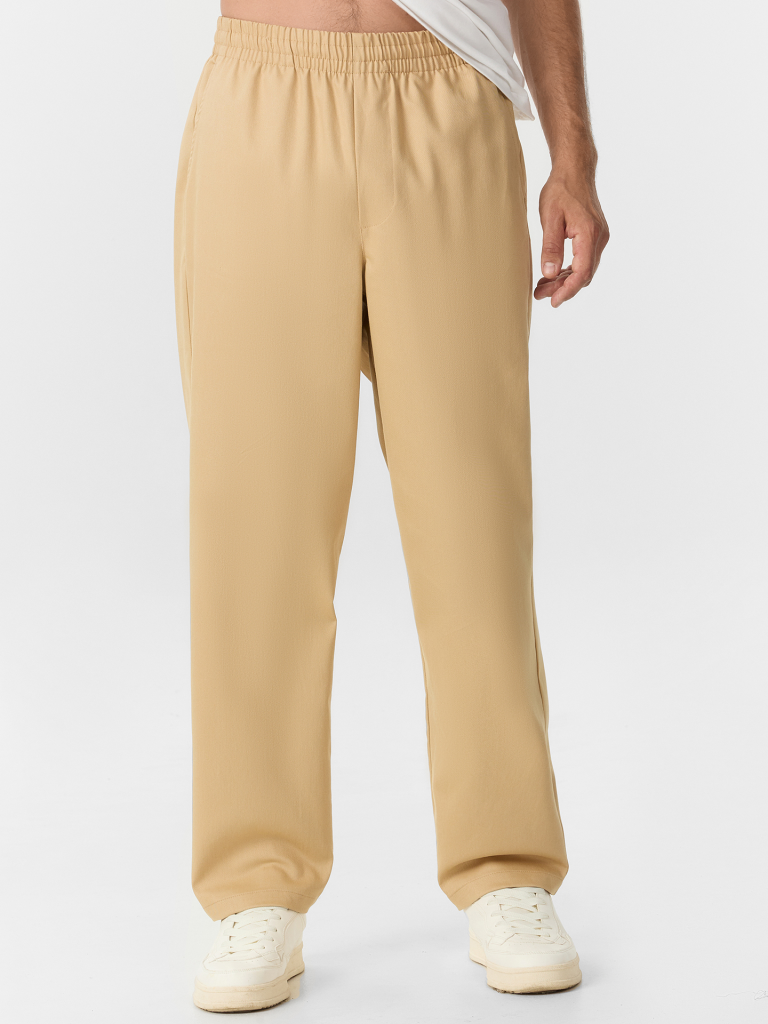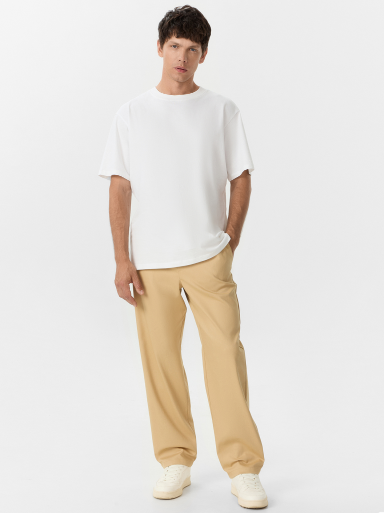 Мужские брюки прямого кроя со средней посадкой — это универсальная модель, сочетающая в себе комфорт, практичность и современный стиль. Эластичный пояс обеспечивает удобную посадку без давления, а имитация гульфика на передней части добавляет визуальную структуру и завершенность образу. Боковые карманы делают модель функциональной, позволяя удобно разместить необходимые мелочи. Нижние срезы аккуратно обработаны швом вподгибку, что подчеркивает качество пошива и сохраняет форму изделия при носке и стирке. Смесовый эластичный хлопок в составе ткани обеспечивает мягкость, воздухопроницаемость и легкую растяжимость, благодаря чему брюки комфортны в течение всего дня и не сковывают движений.