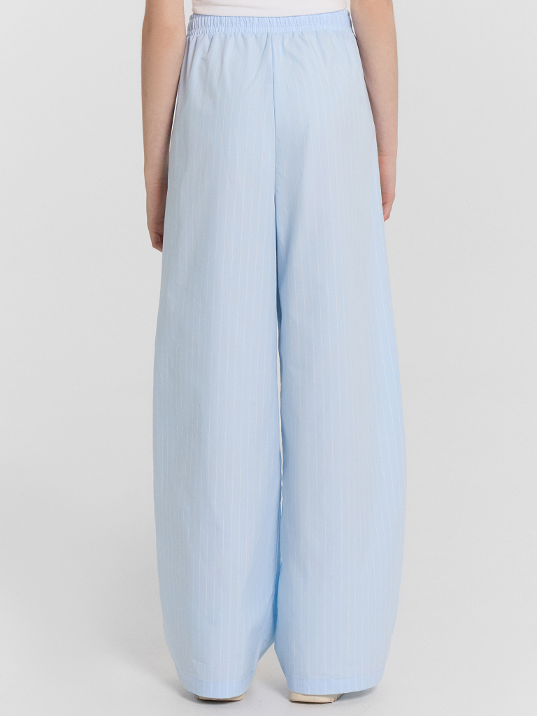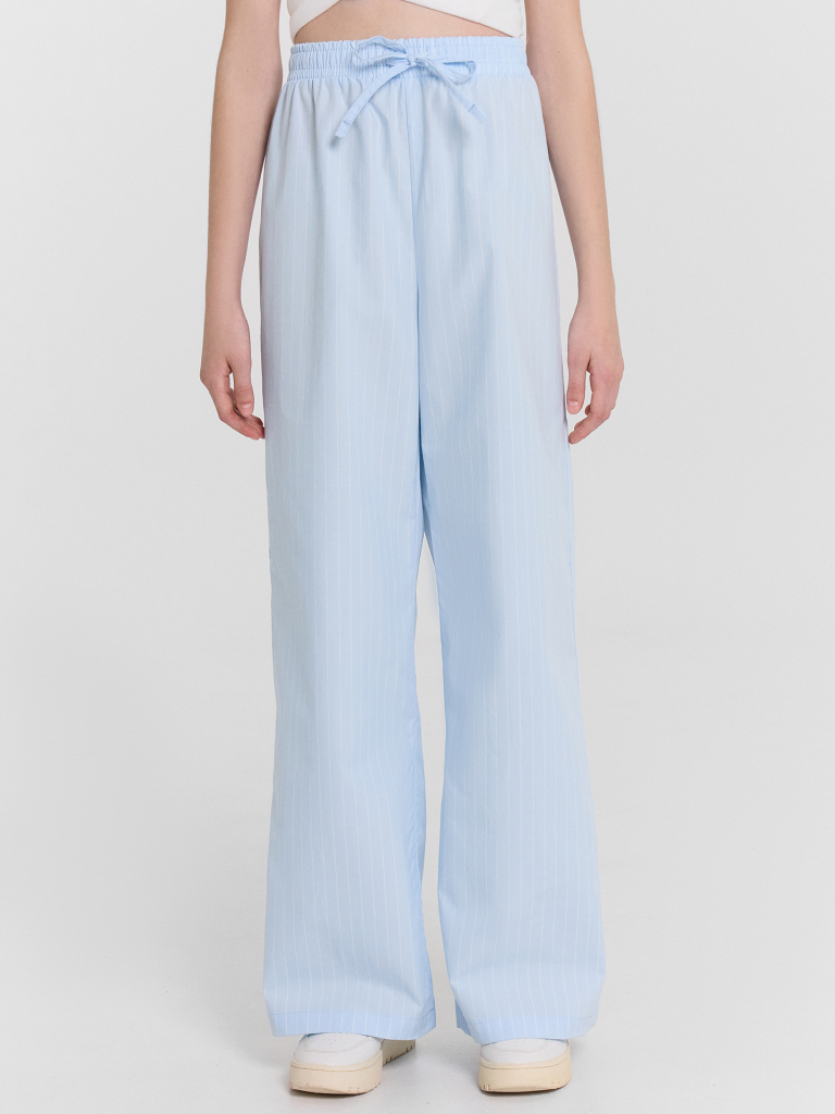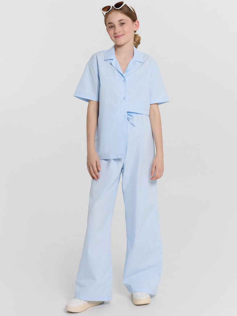 Брюки прямого силуэта. Посадка на талии. Пояс отрезной по переду гладкий, задняя деталь пояса с резиной внутри 40RV. По переду изделия карманы с отрезным бочком. Низ изделия обработан швом в подгибку.