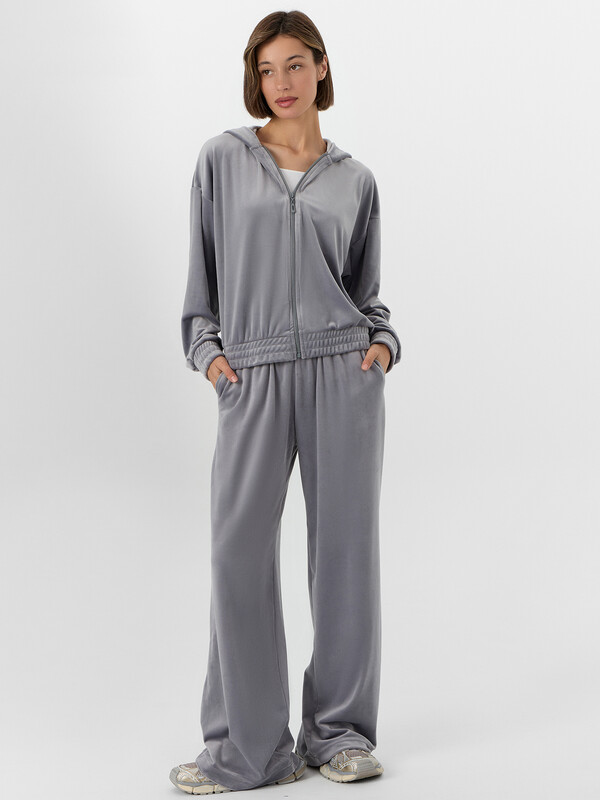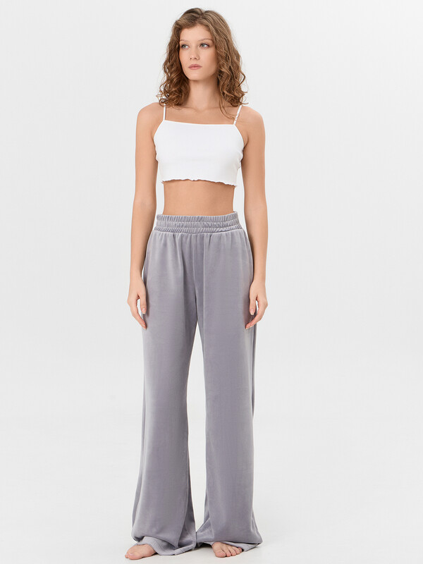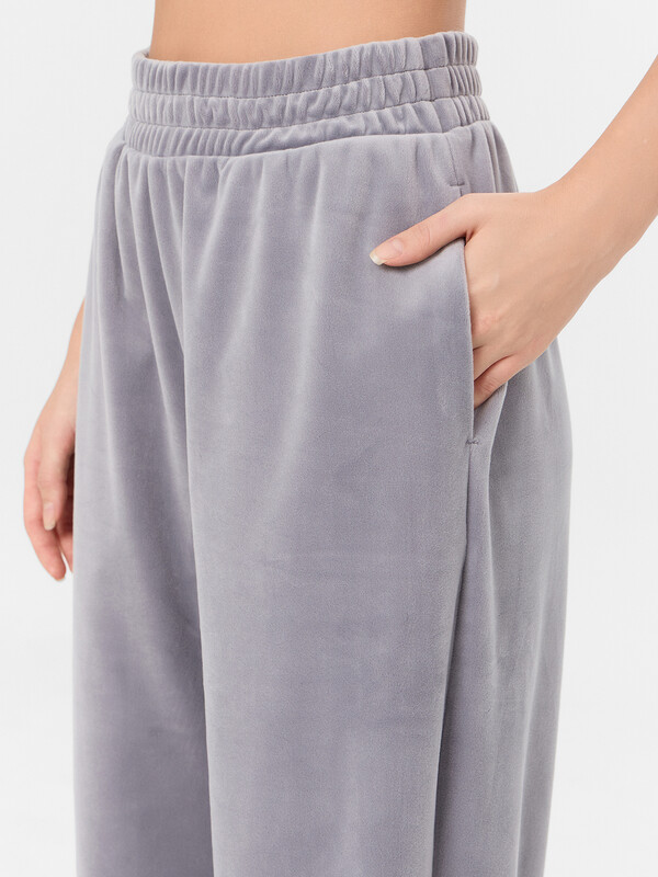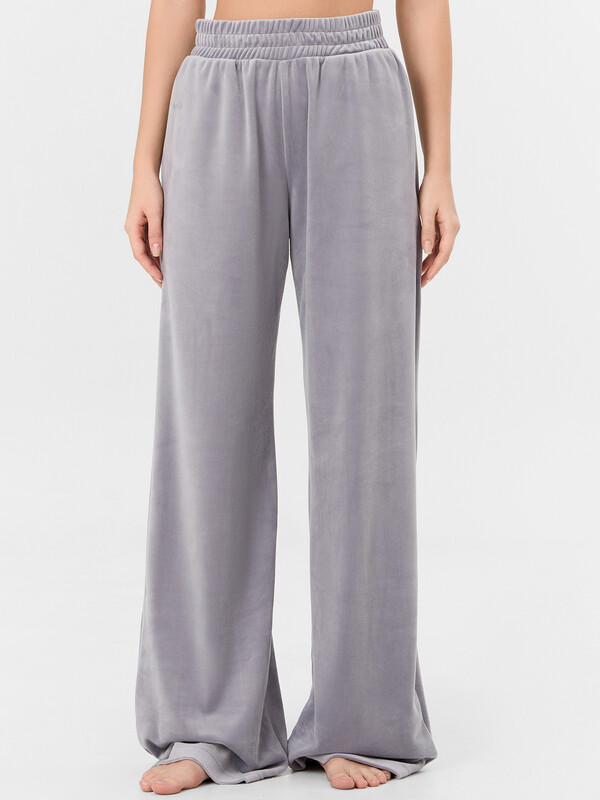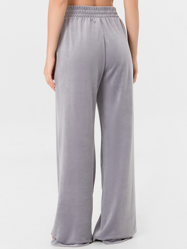 Серые велюровые брюки станут любимым предметом для комфортного отдыха дома в прохладное время года. Модель свободного кроя с высокой посадкой на талии создает элегантный силуэт и обеспечивает комфорт в течение всего дня.