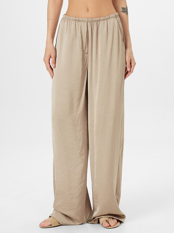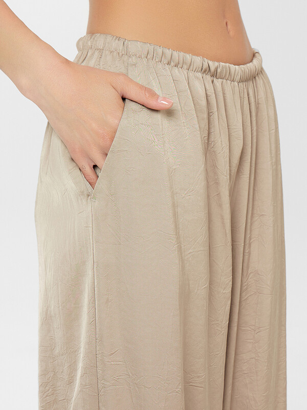 Женские прямые свободные брюки со средней посадкой – отличный выбор для стильного и комфортного образа. Эластичный пояс обеспечивает удобную посадку, а боковые карманы добавляют практичности. Нижние срезы аккуратно обработаны швом вподгибку, что придаёт брюкам завершённый и аккуратный вид. Эта модель выполнена из нежного струящегося материала с добавлением вискозы, которая не только приятно ощущается на коже, но и красиво подчеркивает изящные линии фигуры. Вискоза добавляет брюкам легкость и воздушность, делая их идеальными для теплой погоды.