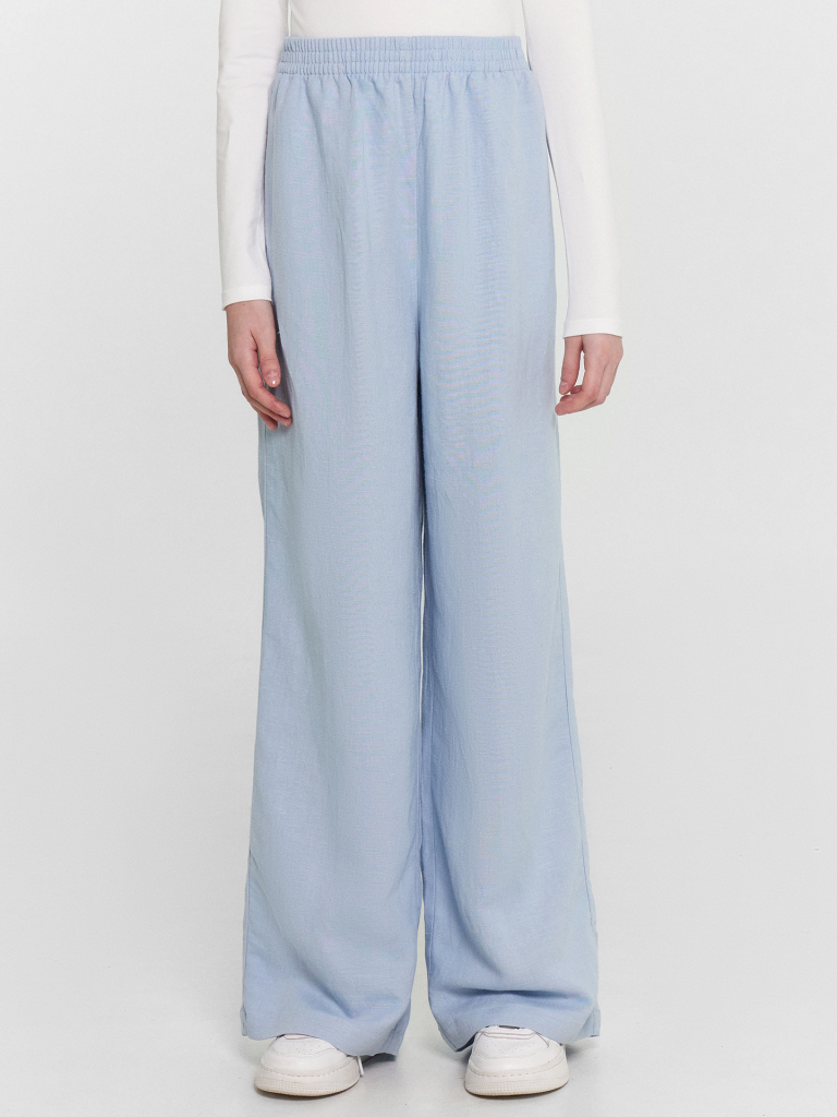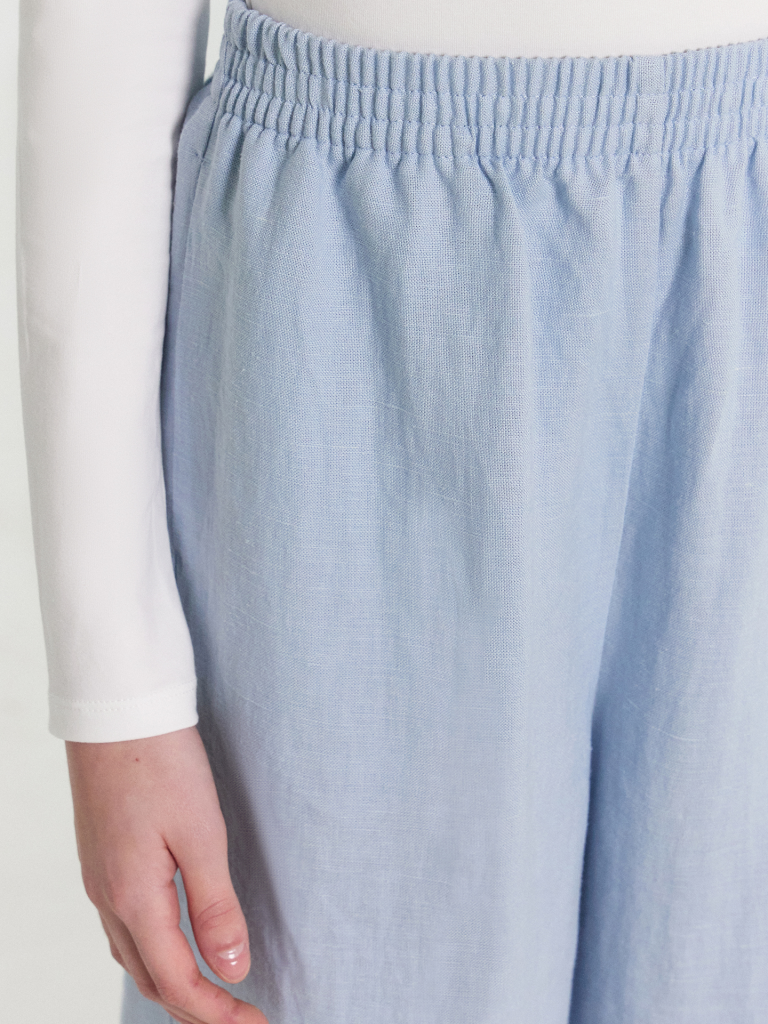 Брюки для девочек широкие. Посадка высокая. Пояс цельнокроеный из основного полотна, застрочен с эластичной тесьмой RV40 внутри, по поясу проложены отделочные строчки. В боковых швах обработаны карманы. Низ брюк обработан швом в подгибку.