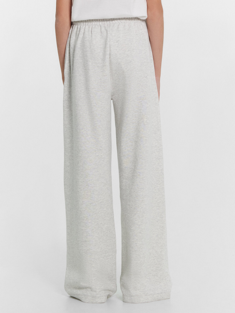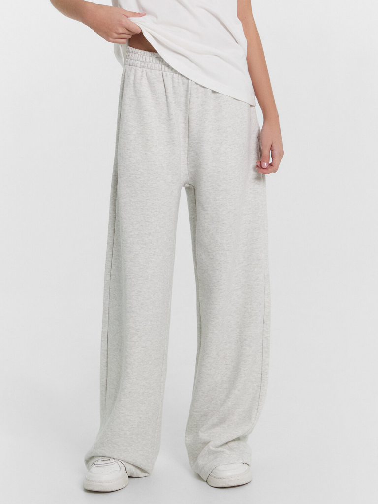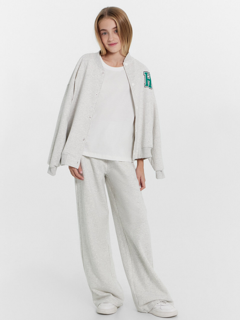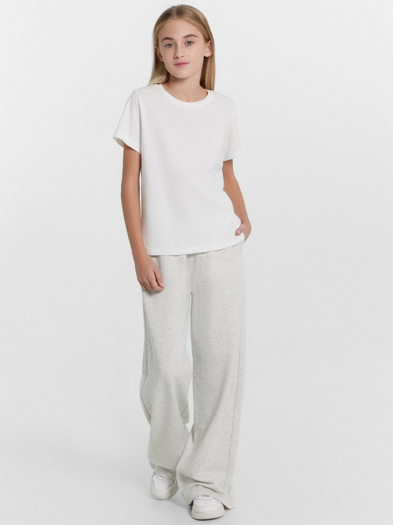 Брюки для девочек, прямого силуэта. Пояс цельнокроеный с втачной эластичной тесьмой RV40. Пояс прострочен двумя отделочными строчками. По переду обработаны карманы в швах. Низ брюк обработан швом в подгибку на двухигольной плоскошовной машине.
