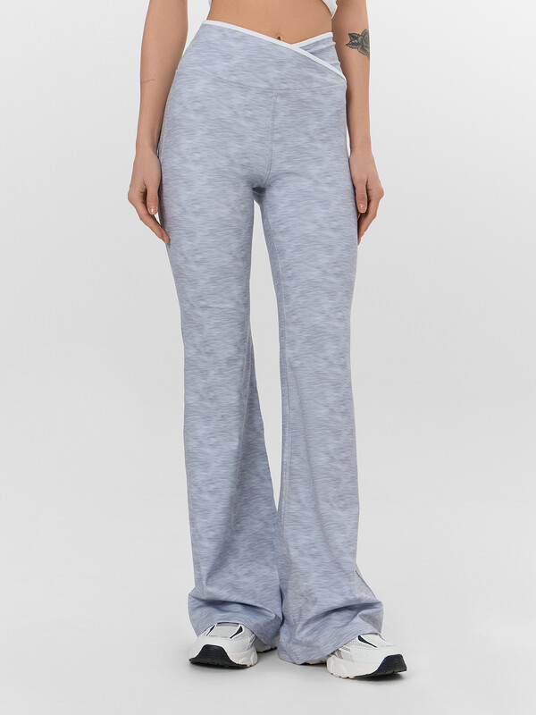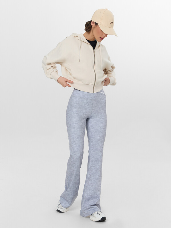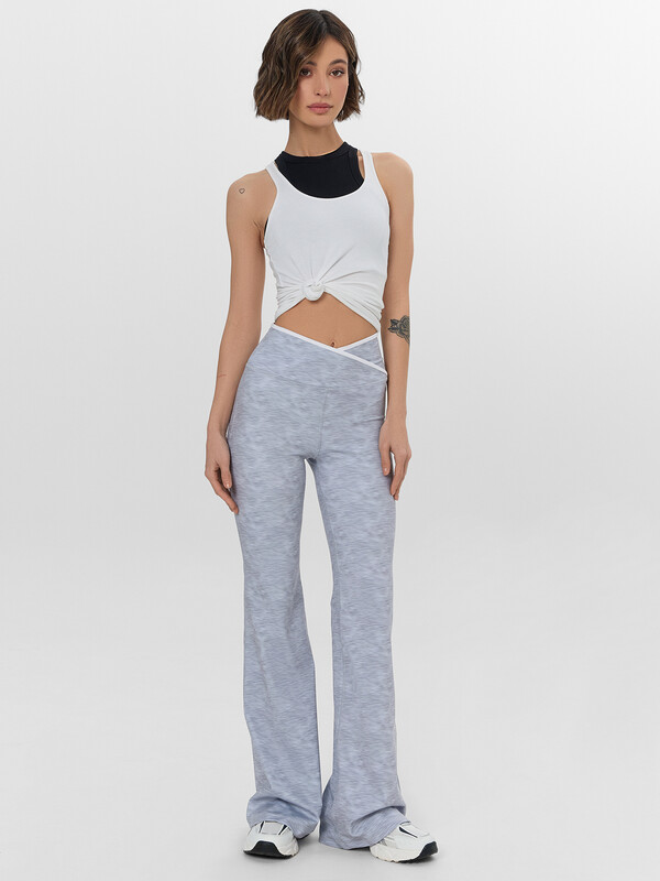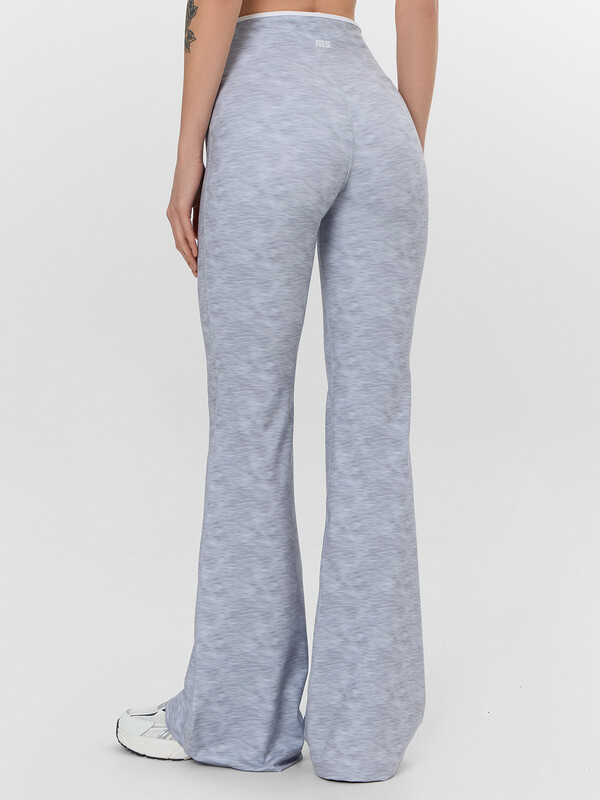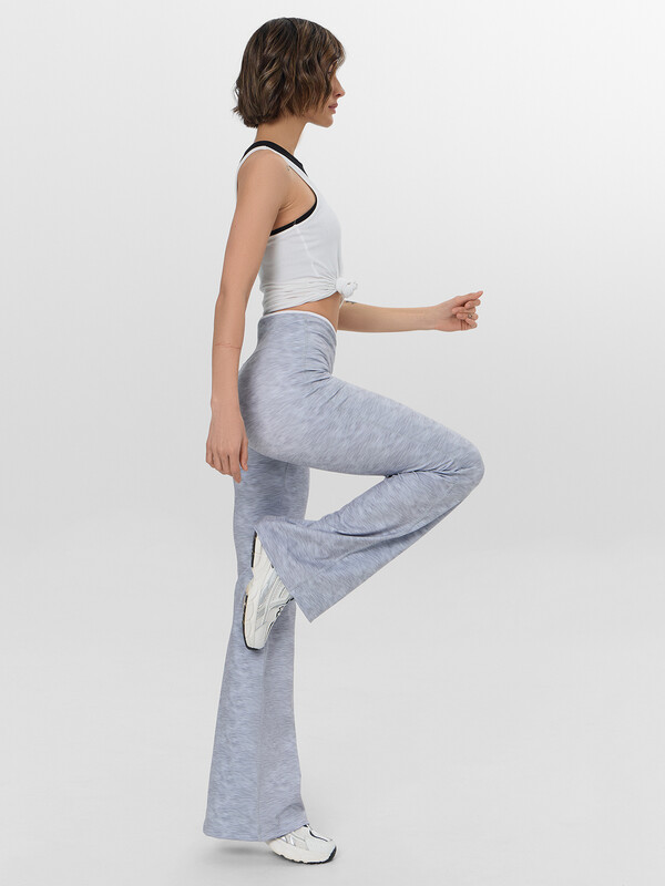 Серые спортивные брюки с эффектным клешем сочетают в себе функциональность и стильный дизайн. Модель плотно облегает бедра до колен и плавно расширяется книзу, обеспечивая полную свободу движений Высокая линия талии с фигурным поясом подчеркивает женственные пропорции, сохраняя спортивный характер модели.