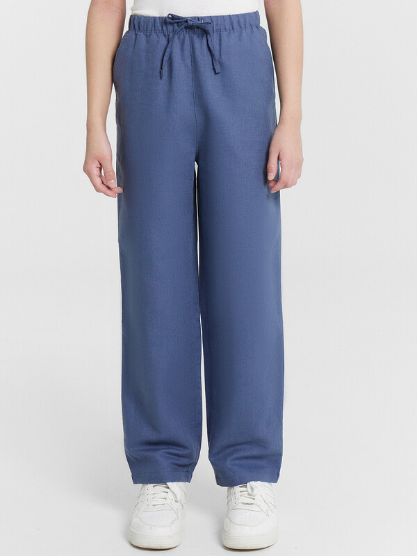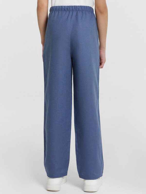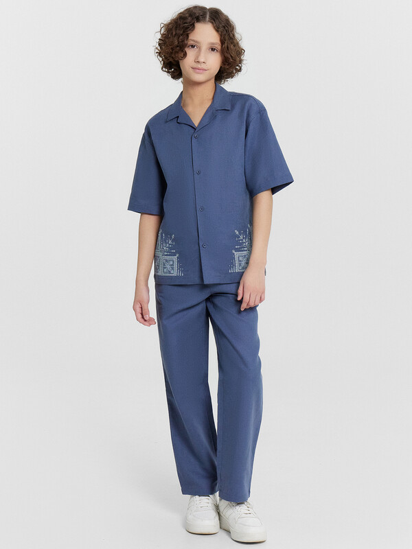 Брюки для мальчиков из ткани. Брюки длинные с классической линией талии. Силуэт прямой, брюки заужены немного к низу. Пояс цельнокроеный. Верхний срез брюк