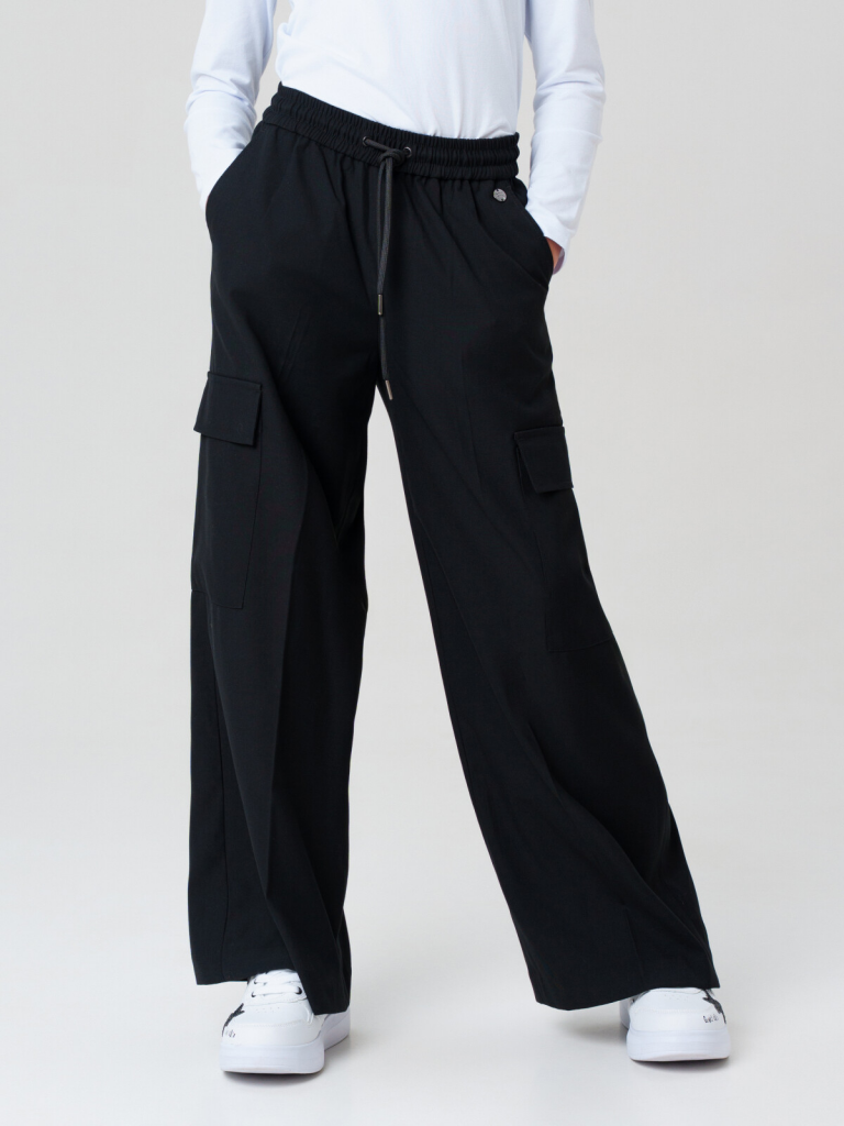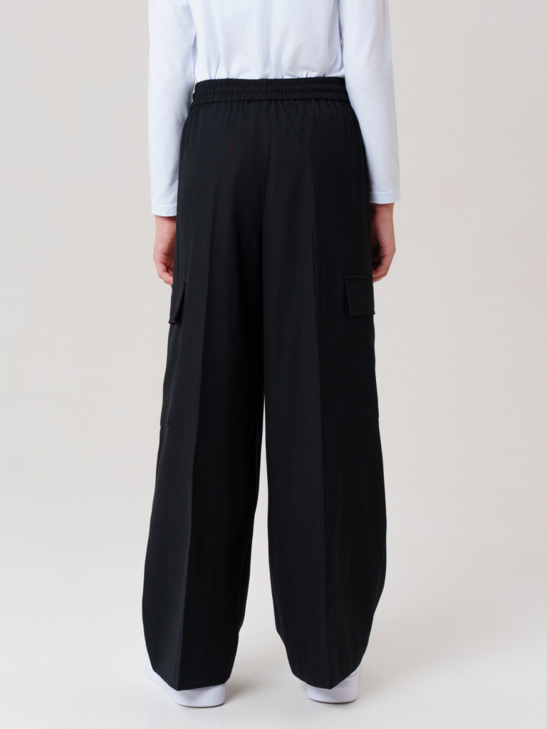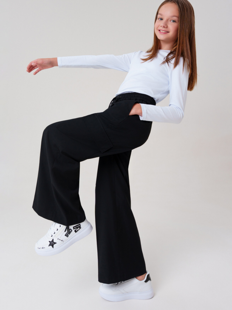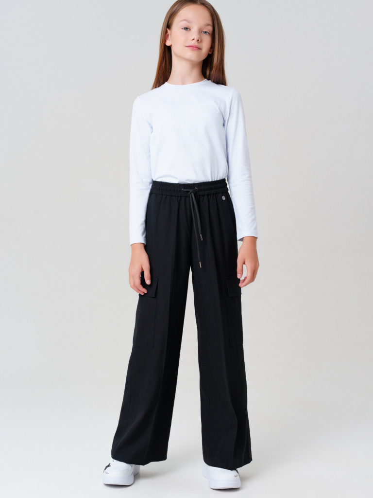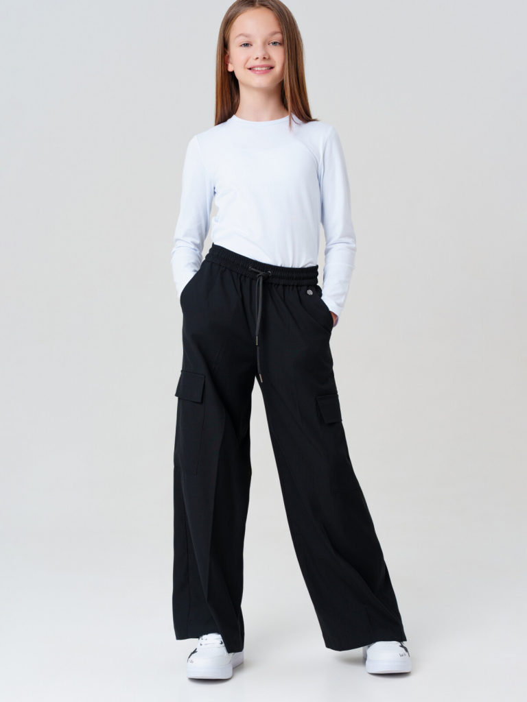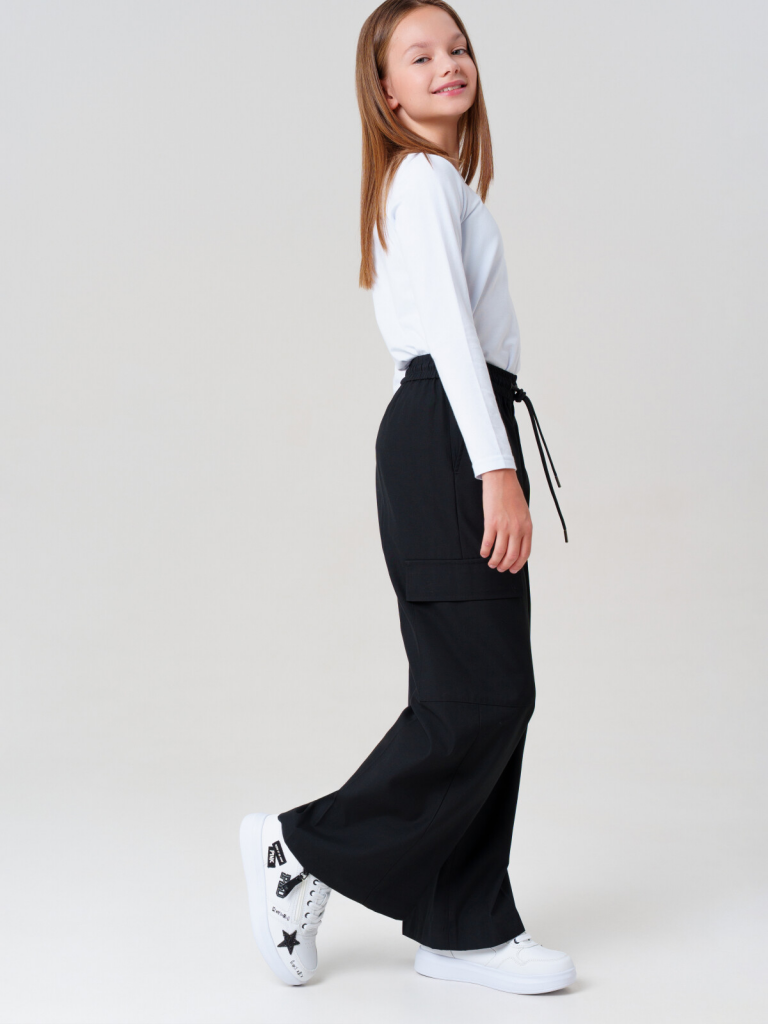 Классические черные школьные текстильные брюки палаццо для девочки.Идеальные брюки для школы, сочетающие комфорт и аккуратный внешний вид. Модель с посадкой Wide leg — это широкие брюки с расслабленной посадкой, максимальной длиной и акцентом на талии. Обеспечивает свободу движений, а резинка со шнурком позволяет легко регулировать посадку по фигуре.Особенности: + 4 кармана - два передних кармана и 2 накладных карго для мелочей. + На резинке со шнурком - удобная посадка без дискомфорта. + Классический крой - подходит для школьной формы и повседневной носки. Эти брюки для девочки-школьницы выполнены из качественного материала, устойчивого к износу. Практичный вариант в школу и на каждый день - стильно, удобно и функционально! Для девочек и подростков, которые ценят комфорт и опрятный вид.