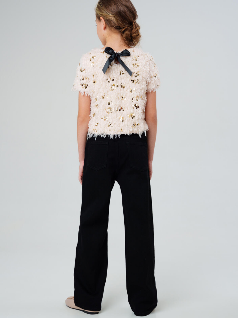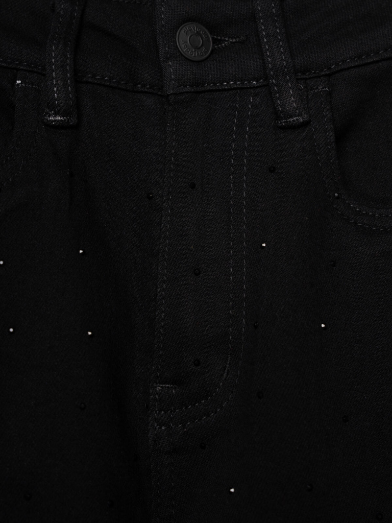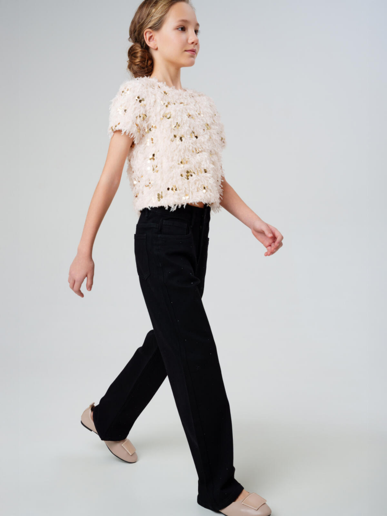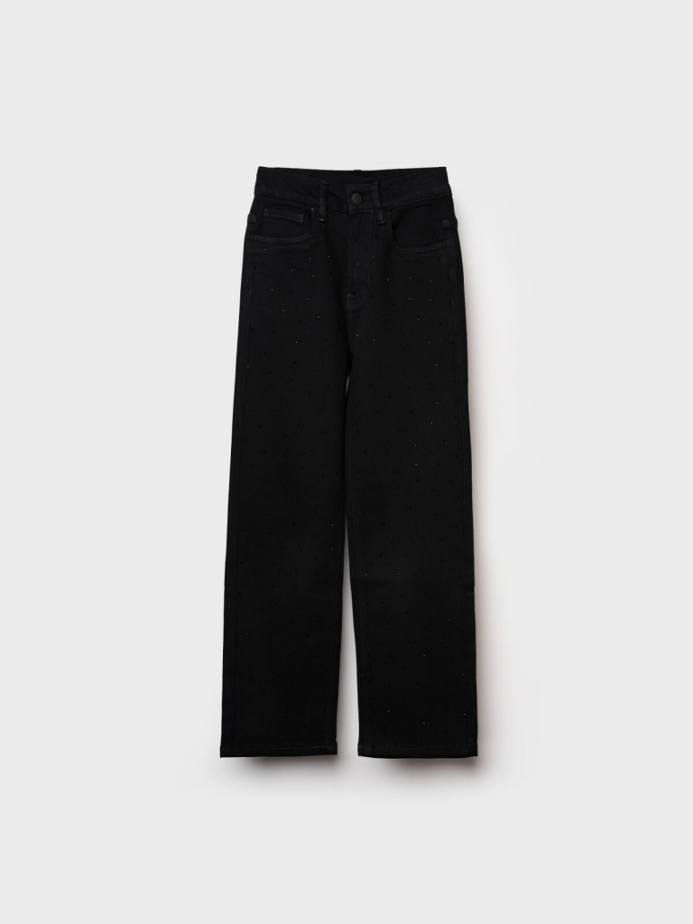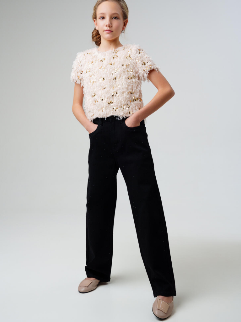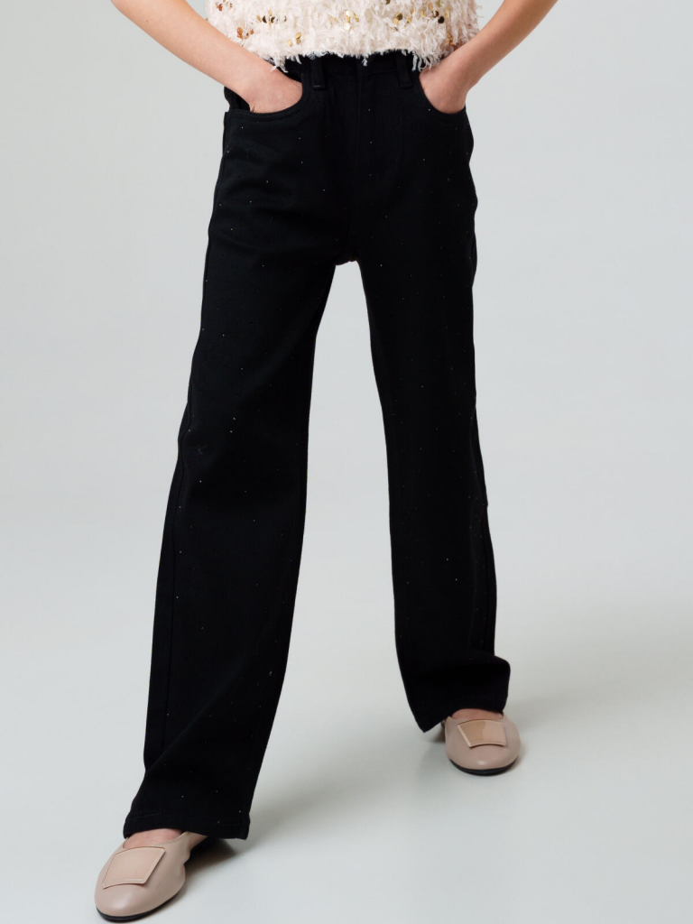 Джинсы прямые черные со стразами для девочки подростка от PlayToday — тёплая, стильная и комфортная модель, которая станет идеальным выбором для холодного времени года.Преимущества модели:+ застежка на молнию и болт — удобно регулировать посадку+ декор из черных страз — сделает ваш образ стильным и ярким+ свободный крой с высокой посадкой — максимально комфортно и удобно+ пять функциональных карманов+ комфортная посадка за счет внутренней утяжкиДжинсы выполнены из черного денима средней плотности. Модель отлично держит тепло, остаётся комфортной и приятной к телу даже в прохладную погоду. Прочный материал устойчив к износу и долго сохраняет опрятный внешний вид.Джинсы не сползают и не сковывают движений — идеально для активных девочек.Удобные карманы позволяют брать с собой необходимые мелочи.Эти джинсы отлично сочетаются с худи, свитшотами, футболками и зимней верхней одеждой. Идеальны для школы, прогулок и повседневных активностей.Материал сохраняет форму и цвет даже после многократных стирок.Подходят для девочек от 8 лет.