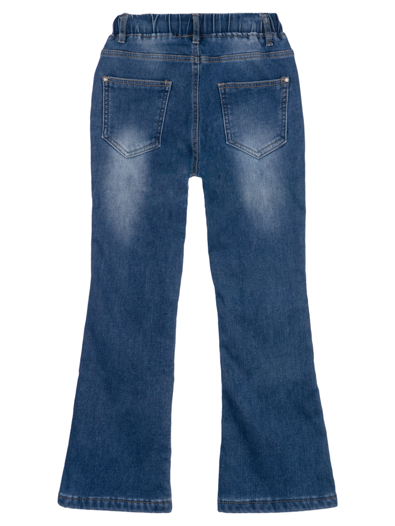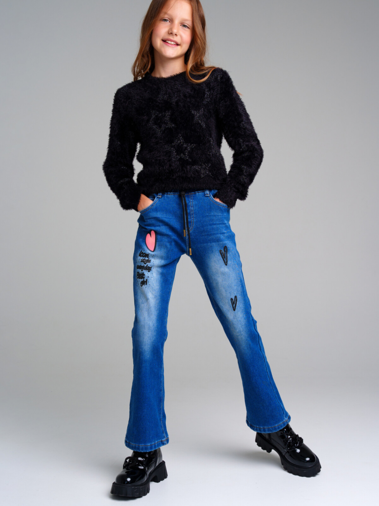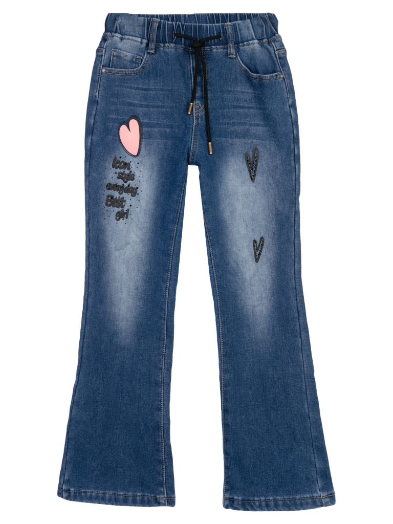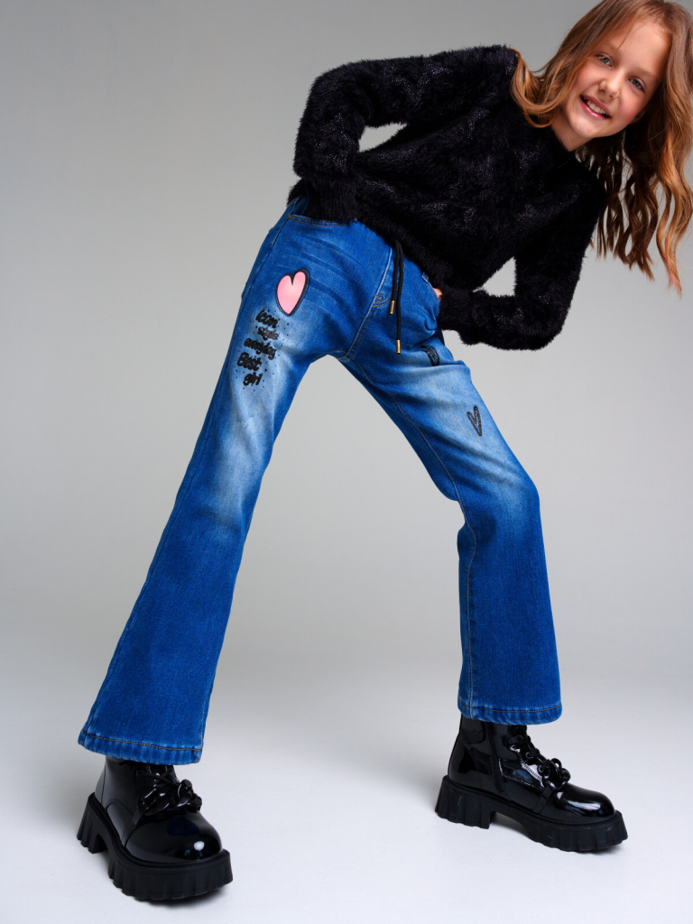 Джинсы, утепленные флисом. Модель свободного кроя с широкими штанинами. Эластичный пояс со шнурком.