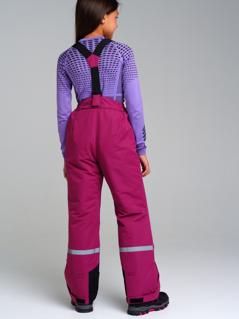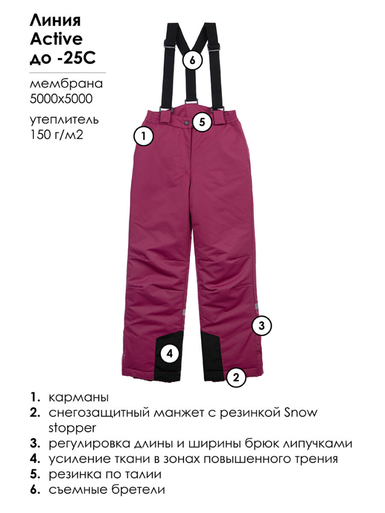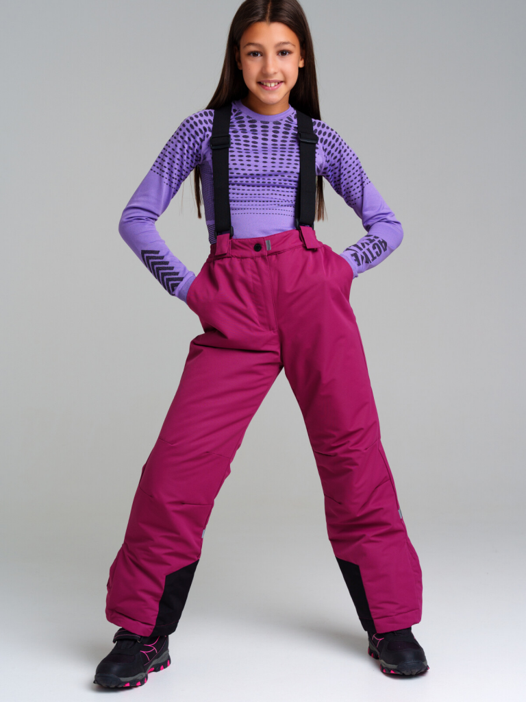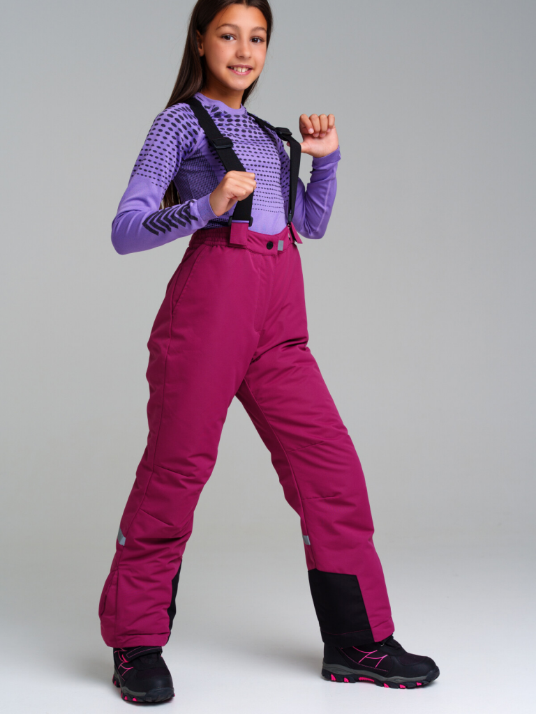 Зимние брюки для девочки подростка. Особенности модели: Линия Active, Температурный режим до -25С, мембрана 5000х5000,Утеплитель 150 г/м,карманы,снегозащитный манжет на брюках с резинкой Snow stopper,регулировка длины брюк,регулировка ширины брюк липучкой,усиление по внутреннему шву,Резинка по талии,съемные бретели, Утепленные горнолыжные брюки - идеальный выбор для активного отдыха на свежем воздухе в зимний период. Инновационный утеплитель и флисовая подкладка сохраняют тепло морозную погоду.Мембранный материал делает этот яркий и модный комбинезон непромокаемым: мембрана не пропускает влагу снаружи, но выводит её изнутри, что крайне важно во время подвижных игр и занятий спортом. Легкие, теплые и удобные брюки идеально подходят для спорта, лыж, сноуборда и игр на свежем воздухе в холодный период года: зима, поздняя осень и ранняя весна. *Пожалуйста, обратите внимание, что указанный температурный режим является приблизительным и зависит от многих факторов, таких как возраст, физическое состояние, уровень активности ребенка и количество слоев одежды. Время, проведенное на открытом воздухе, и погодные условия, такие как холодный ветер, могут повлиять на тепловые характеристики изделия. Убедитесь, что защищены от холода голова, руки и ноги.