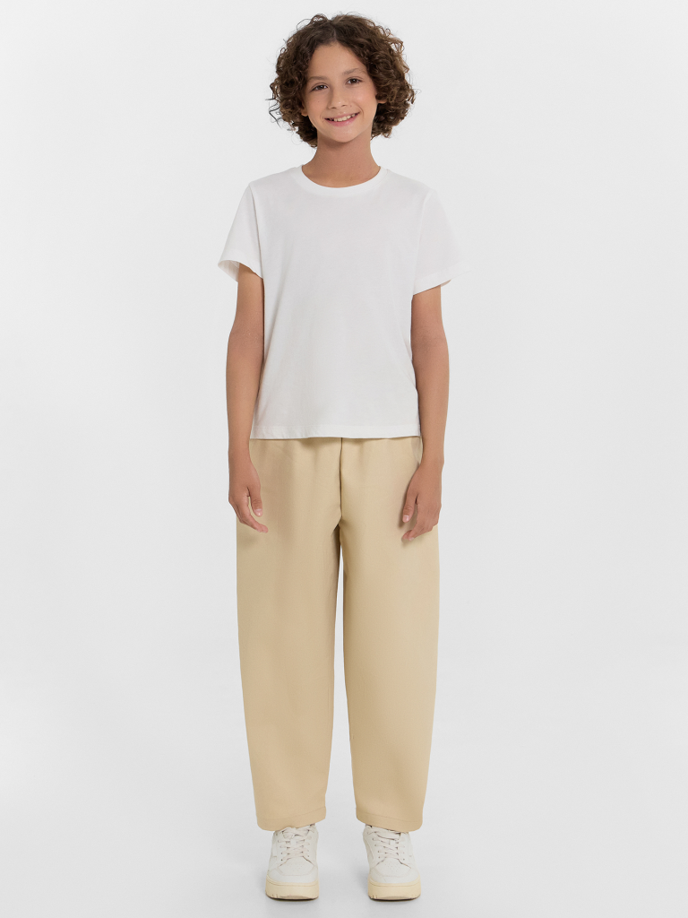 Брюки для мальчиков прямого свободного кроя — это удобная и универсальная модель, подходящая как разнообразных образов. Слегка зауженные к низу штанины придают силуэту аккуратность и современный вид, не ограничивая свободу движений. Эластичный пояс обеспечивает комфортную посадку и легко адаптируется под особенности фигуры ребенка. Боковые карманы с подкладкой из основного полотна практичны и удобны для хранения мелочей, а накладной карман на задней детали добавляет функциональности и завершенности образу. Низ брюк аккуратно обработан швом в подгибку, что подчеркивает качество исполнения и сохраняет форму изделия. Смесовый хлопок в составе ткани делает брюки мягкими, прочными и устойчивыми к износу, обеспечивая комфорт в течение всего дня.