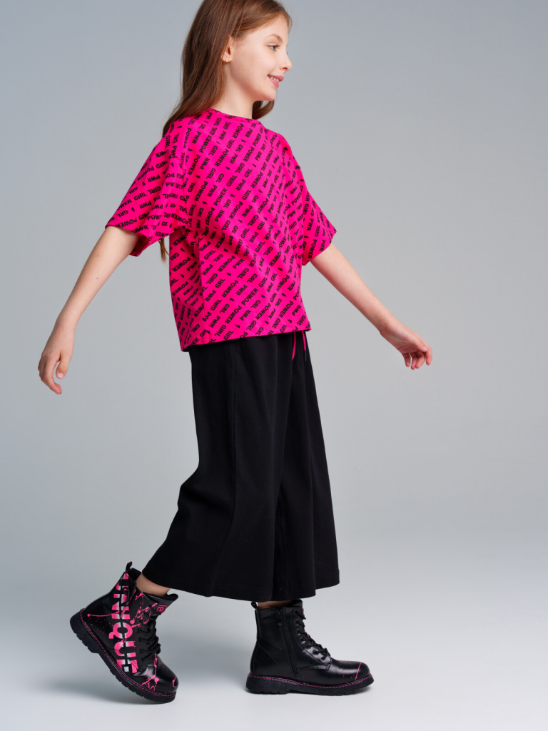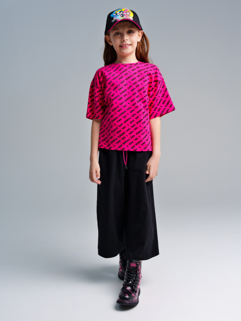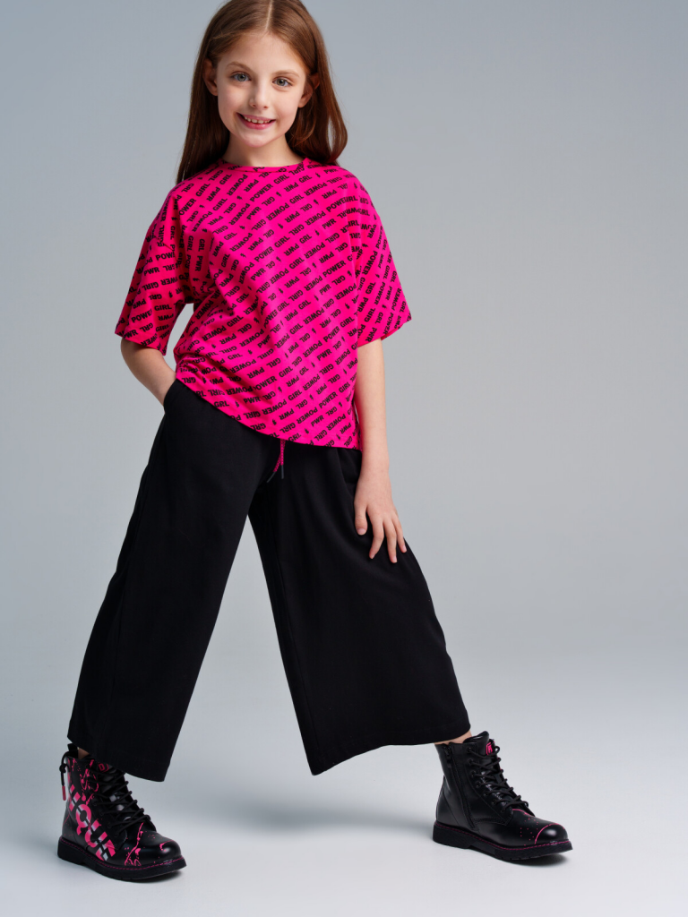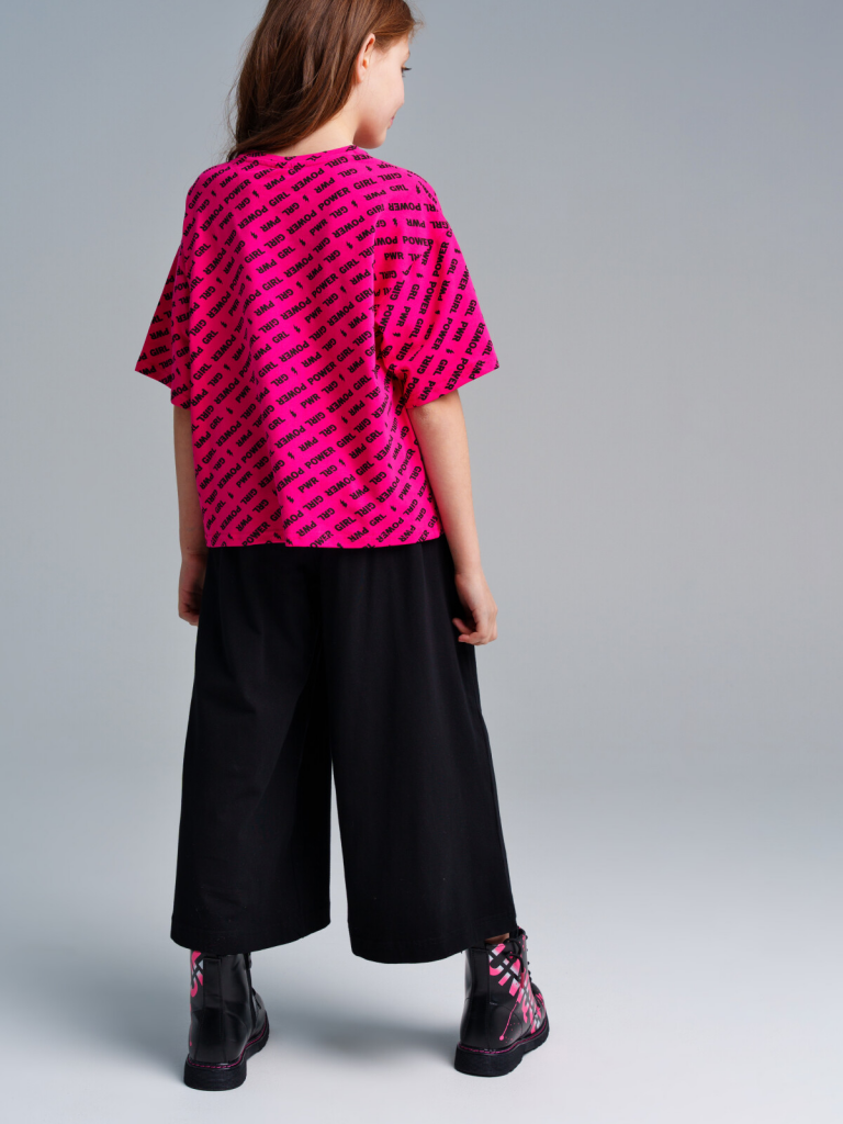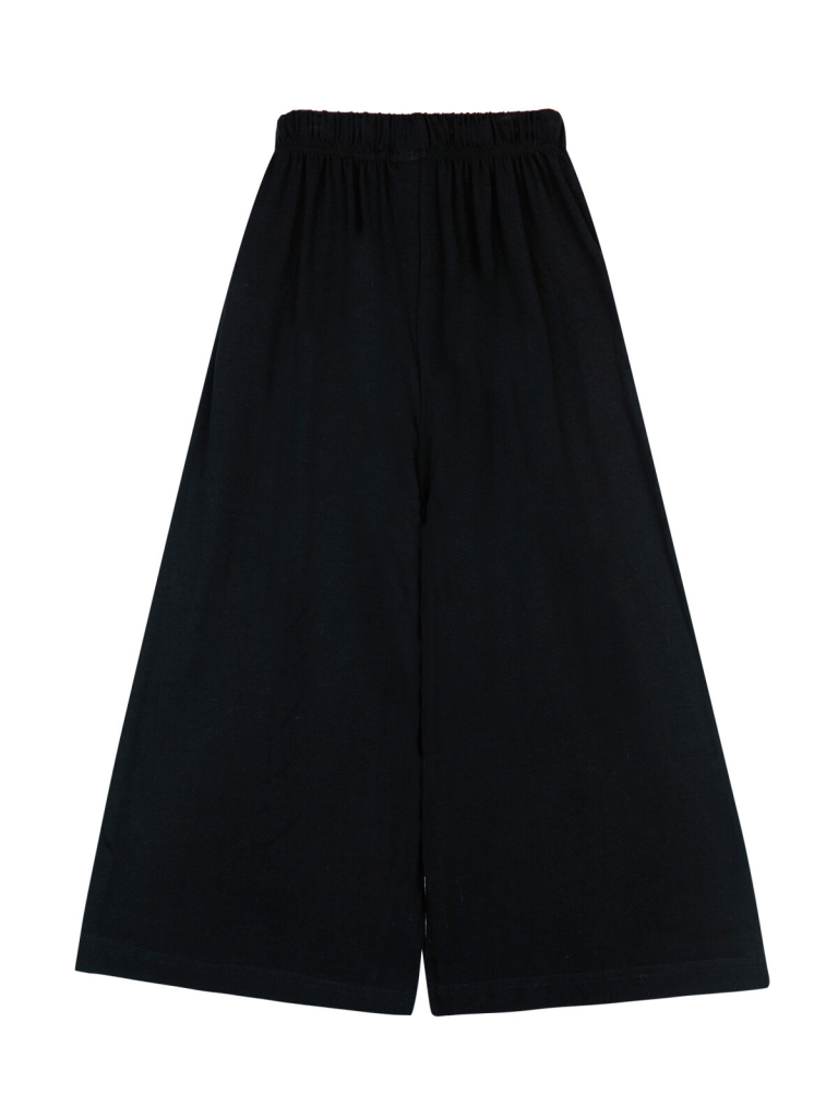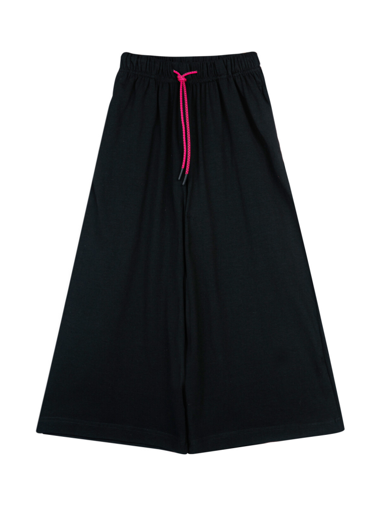 Кюлоты из качественного и приятного на ощупь трикотажа джерси. Высокое содержание хлопка 95%. Благодаря наличию эластана в составе ткани изделие проще в уходе и держит форму. Эластичный пояс со шнуром.