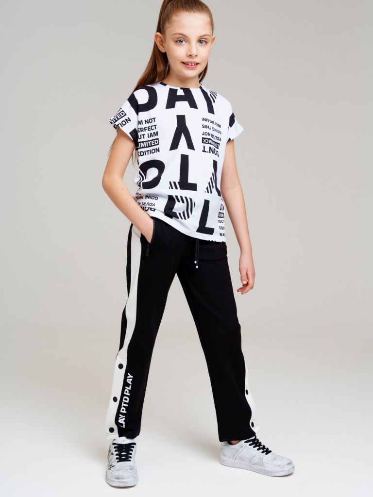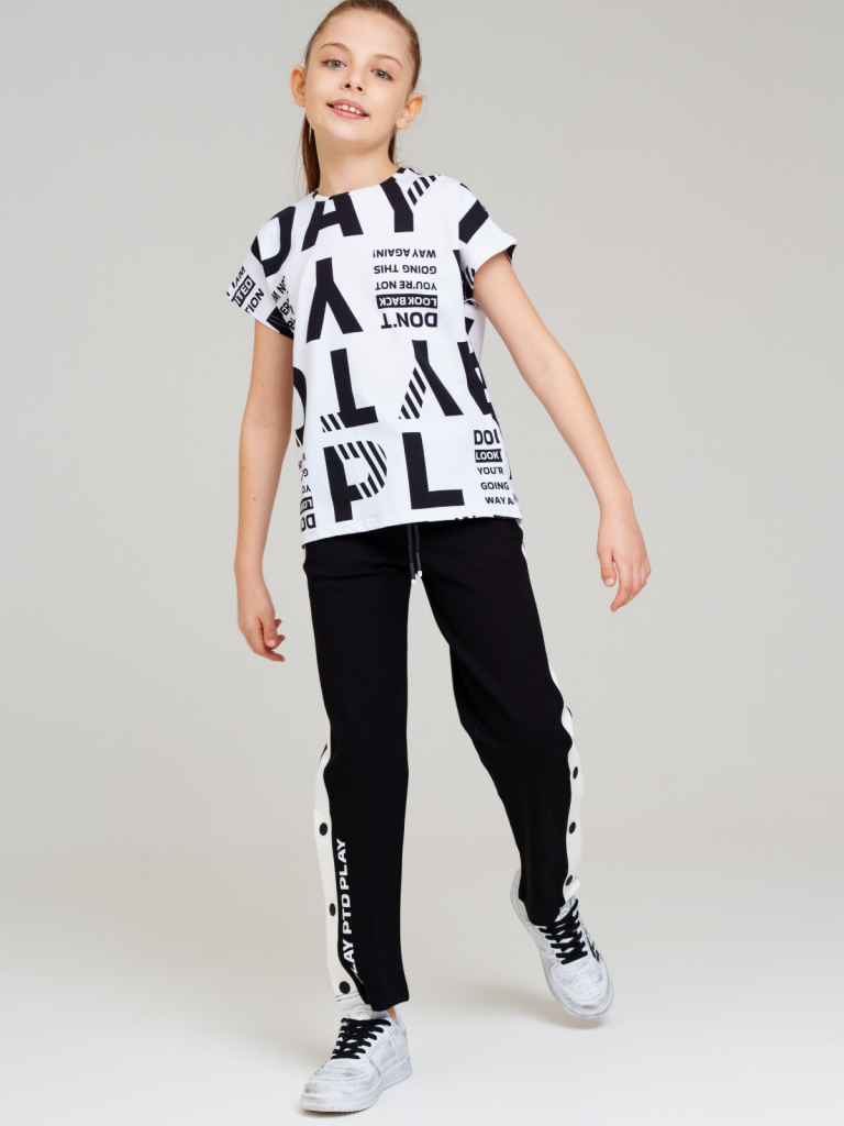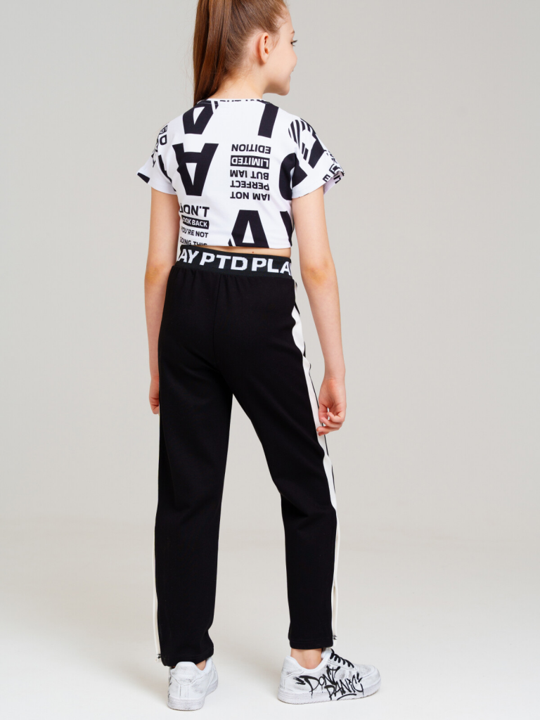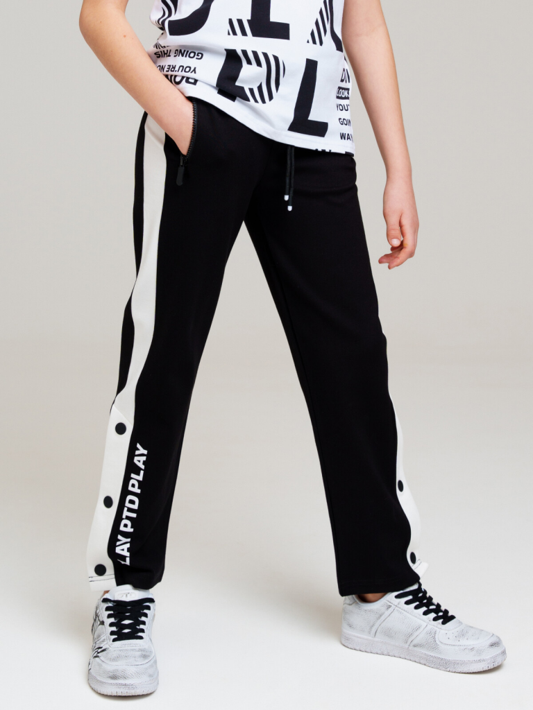 Брюки для девочки подростка. Штаны на резинке со шнурком. Функциональные карманы на молнии. Кнопки по низу лампас для регулировки ширины брюк. Модель выполнена из качественного и приятного на ощупь трикотажа.