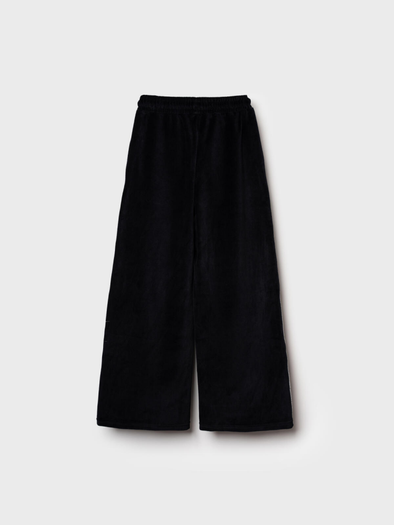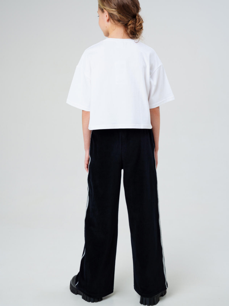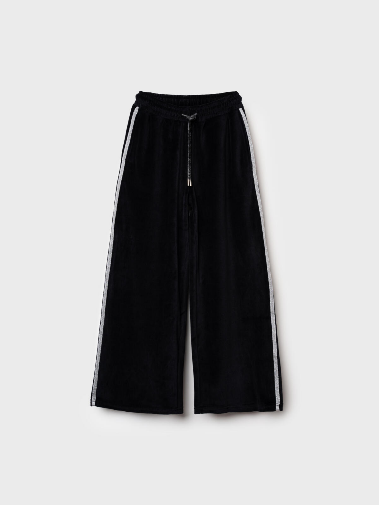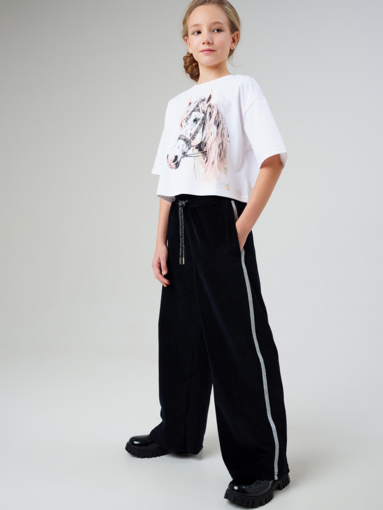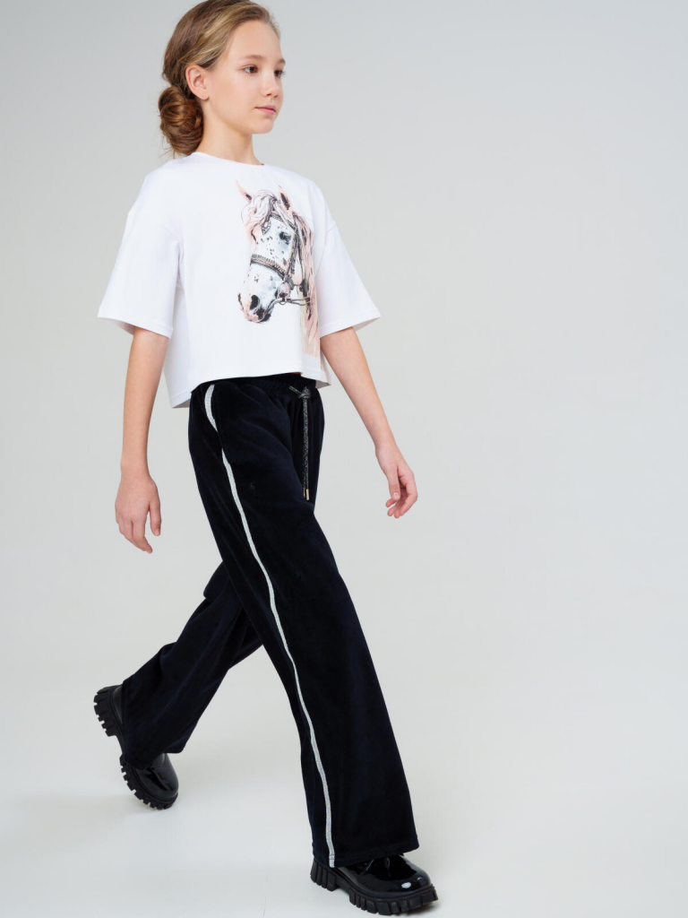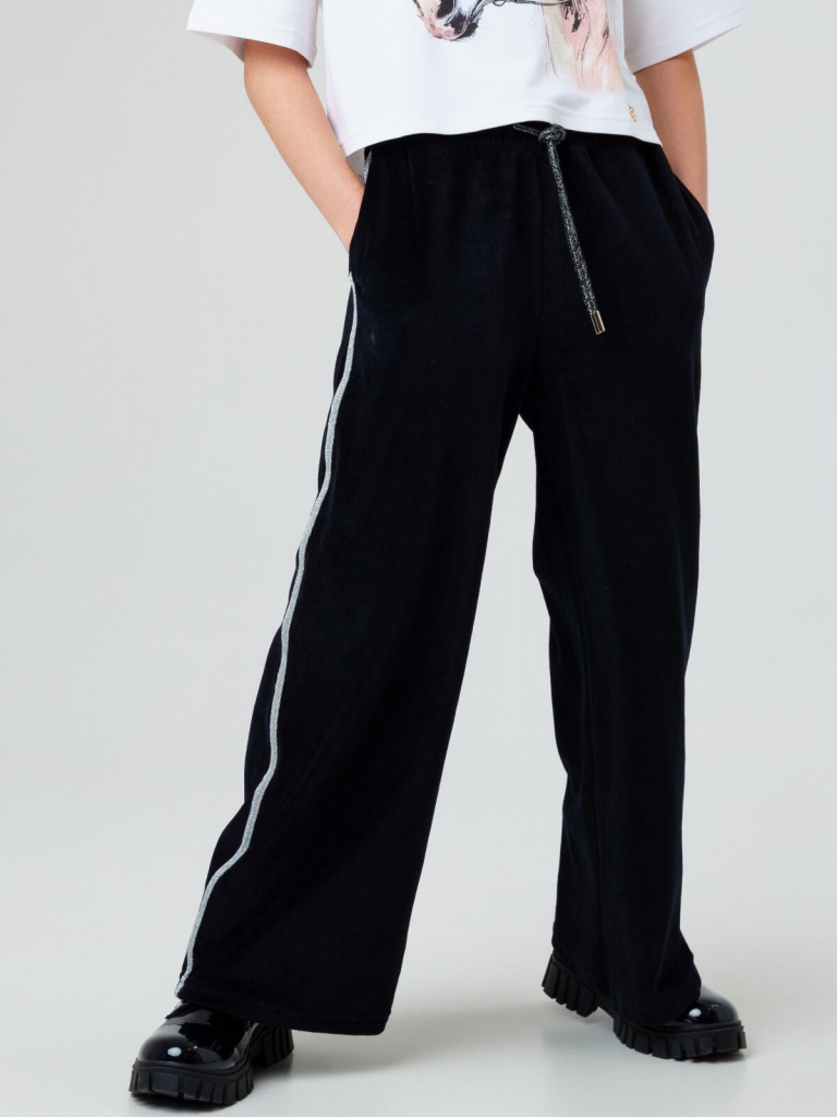 Брюки велюровые палаццо на резинке для девочки подростка от бренда PlayToday.Преимущества модели:+ брюки для девочки подростка — базовый элемент зимнего гардероба+ брюки на резинке со шнурком — регулируемая посадка, комфорт при движении+ два кармана по бокам — удобно для мелочей+ яркие лампасы+ размеры от 128 до 170 см — подойдут для девочек разного возраста+ тёплые трикотажные брюки — для школы, прогулок и отдыхаМодель выполнена из мягкого, плотного велюра — ткань приятная к телу, отлично сохраняет тепло и позволяет коже дышать. Удобный крой, резинка на талии со шнурками и боковые карманы делают эти брюки максимально практичными и комфортными.Когда и как носить:Идеальны для прохладной погоды. Носите в школу, на прогулку, в поездку или в качестве удобной одежды для дома. Отлично сочетаются с худи, лонгсливами и футболками. Лёгкие и тёплые — оптимальный выбор на каждый день.Советы по стилю:Комбинируйте с худи, утеплёнными свитшотами и кроссовками от PlayToday — получится стильный повседневный образ. Для домашнего уюта добавьте мягкий лонгслив. А для активного отдыха или прогулки — спортивную куртку или жилет. Универсальный крой вписывается в любой гардероб девочки-подростка. Подходит для девочек от 8 до 16 лет.