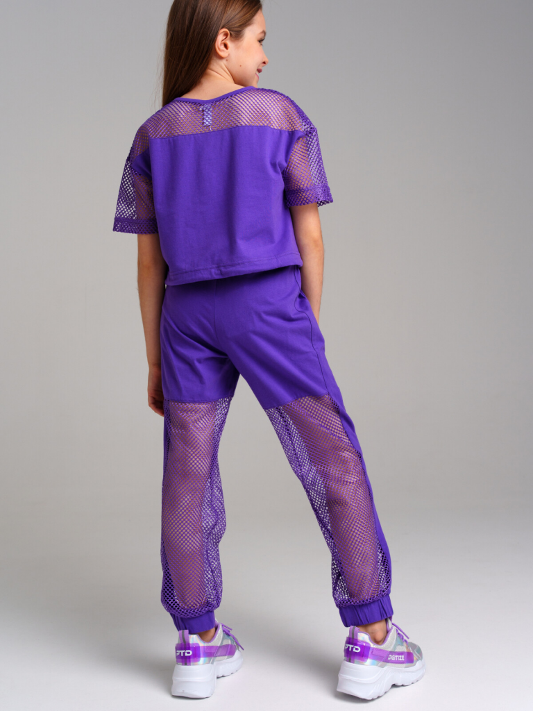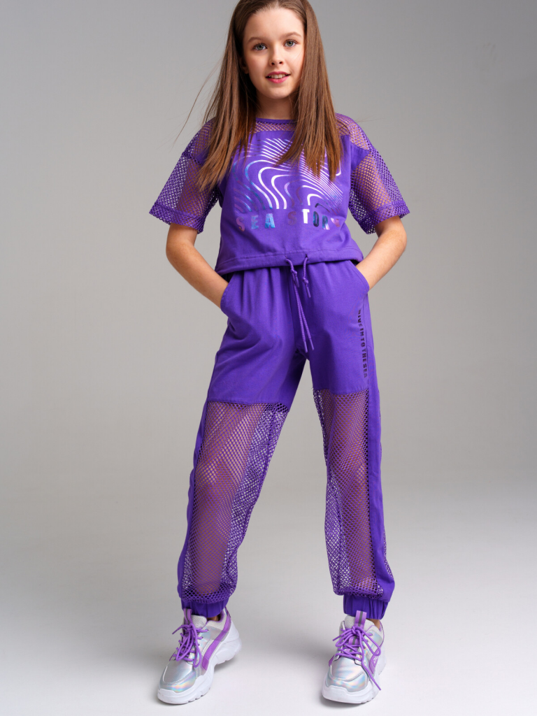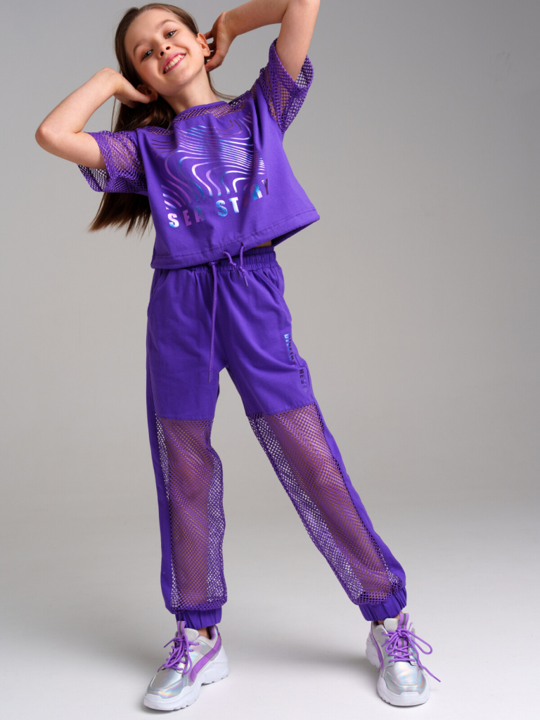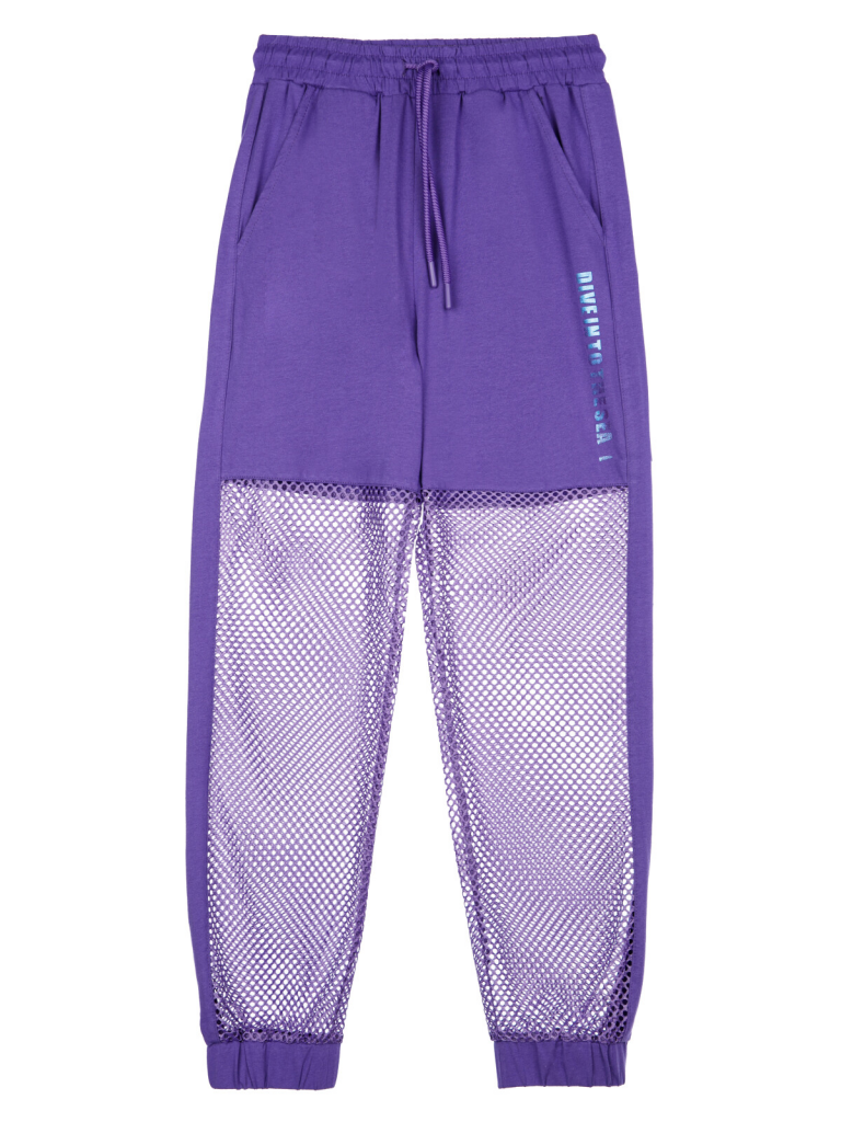 Брюки из трикотажа и сетки. Эластичный пояс со шнурком. Боковые карманы. По низу штанин внутренняя резинка.