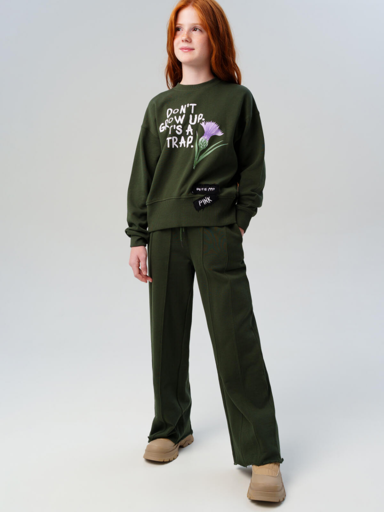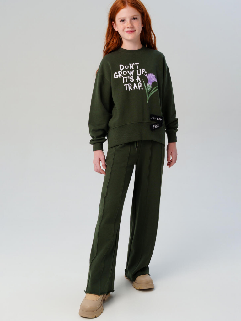 Трикотажные брюки палаццо на резинке для девочки подростка от PlayToday.Преимущества модели:+ Трикотажные штаны для девочек подростков — базовый элемент гардероба+ Брюки на резинке со шнурком — комфортная посадка, легко регулируются+ 2 боковых кармана — практично и удобно+ Брюки для школы, прогулок, спорта и отдыха+ Мягкий и приятный к телу материал — комфорт на целый день+ Свободный крой — не стесняет движений, отлично подходит для активных девочек+ Размеры от 146 до 176 см — для подростков разного роста+ Лаконичный дизайн — легко комбинируется с худи, футболками, джемперамиУниверсальные брюки на каждый день для подростков. Изготовлены из мягкого дышащего трикотажа, отлично сидят по фигуре, не сковывают движения и легко сочетаются с верхом.Когда и как носить:Подходят для повседневной носки — в школу, на прогулку, тренировку, в поездку или на отдых. Универсальная модель для демисезона и прохладного лета.Советы по стилю:Носите с толстовками, лонгсливами, футболками, бомберами или джинсовками. Добавьте кроссовки и рюкзак — получится удобный и стильный городской образ в стиле стритвир или спорт-шик. Отличный выбор для модной девочки-подростка! Подходит для девочек от 11 до 17 лет.