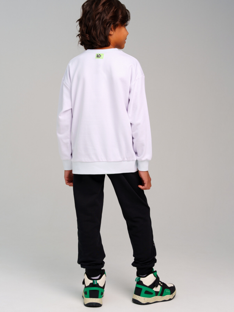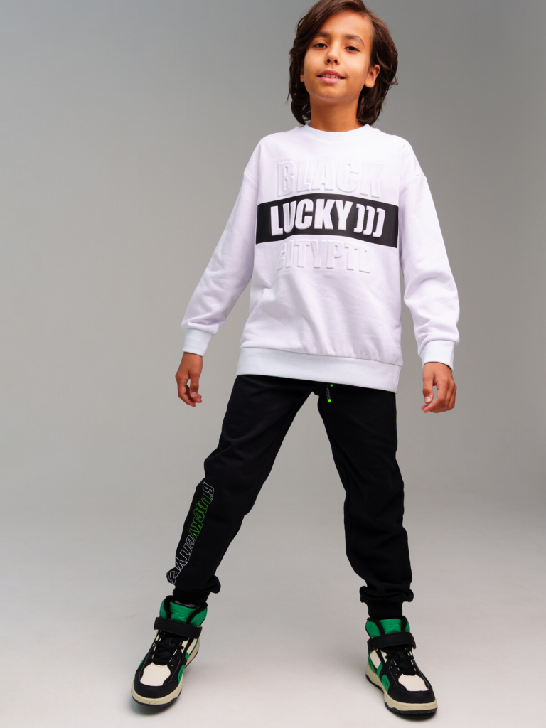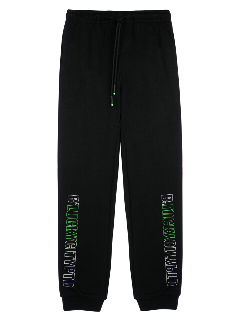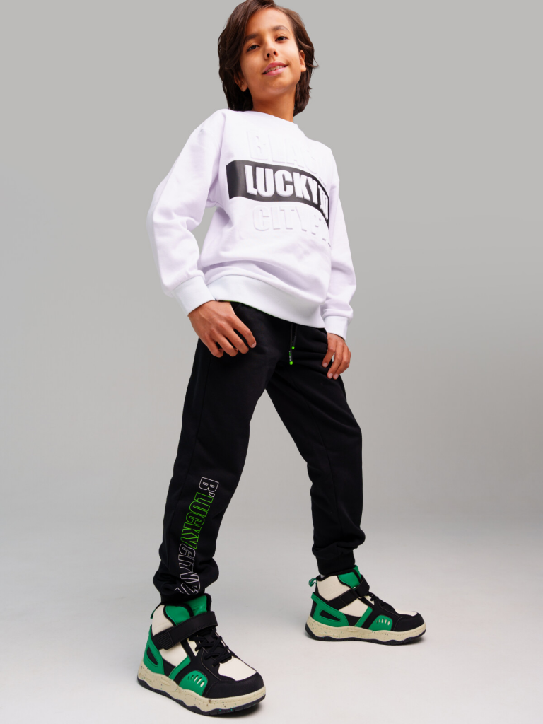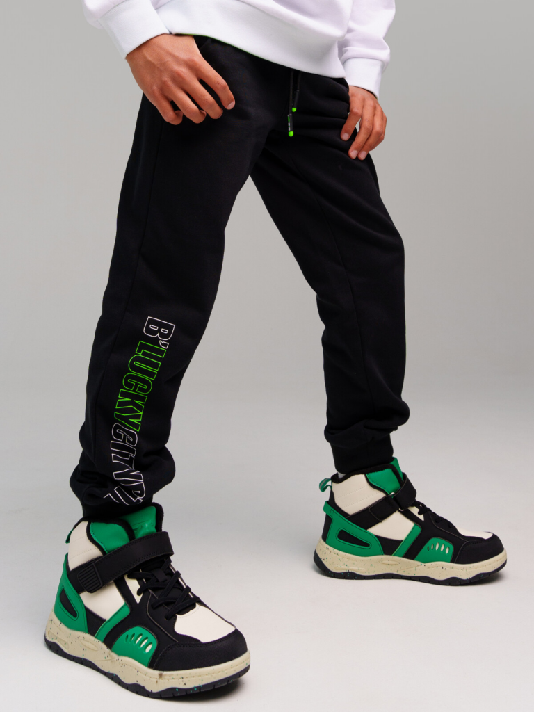 Брюки из футера без начеса для мальчика подростка. Модные штаны на резинке со шнурком. Высокое содержание хлопка. Удобные боковые карманы. Модель из капсульной коллекции B’LUCKY CITY. Соберите полный образ в едином стиле! Модель выполнена из качественного и приятного на ощупь трикотажа.