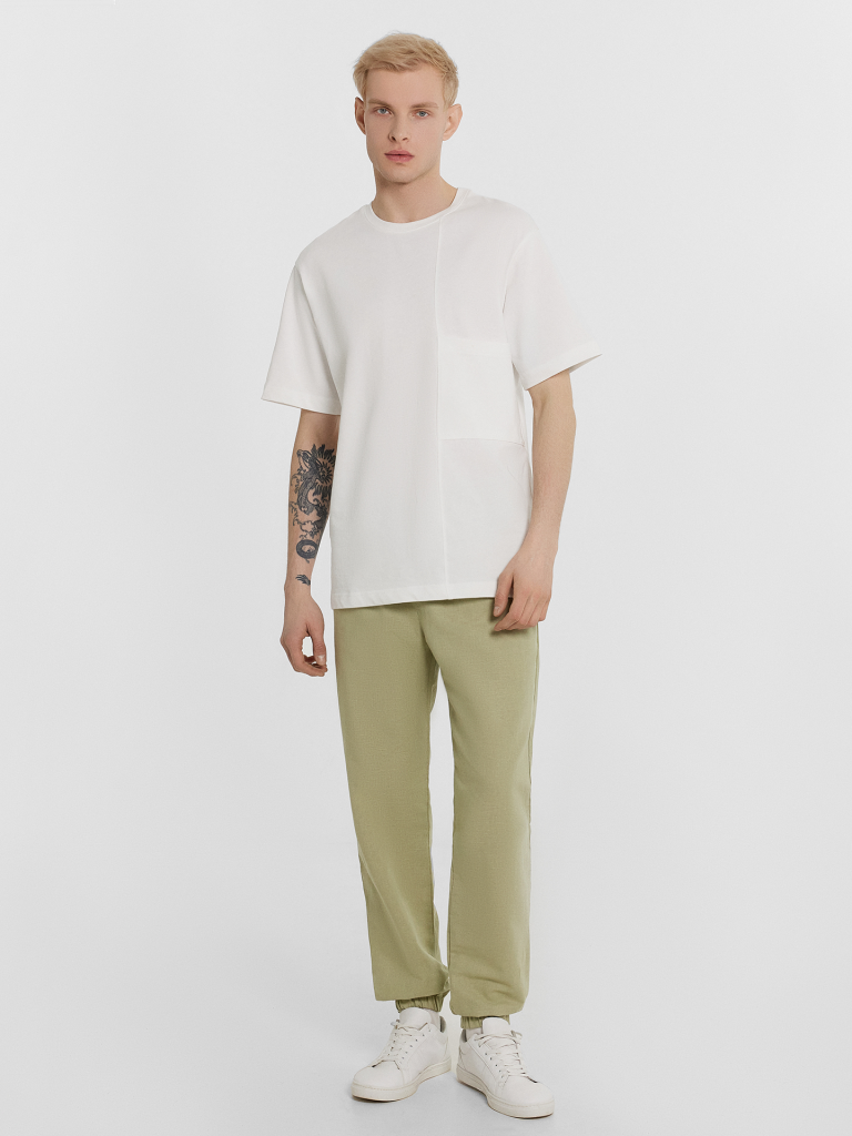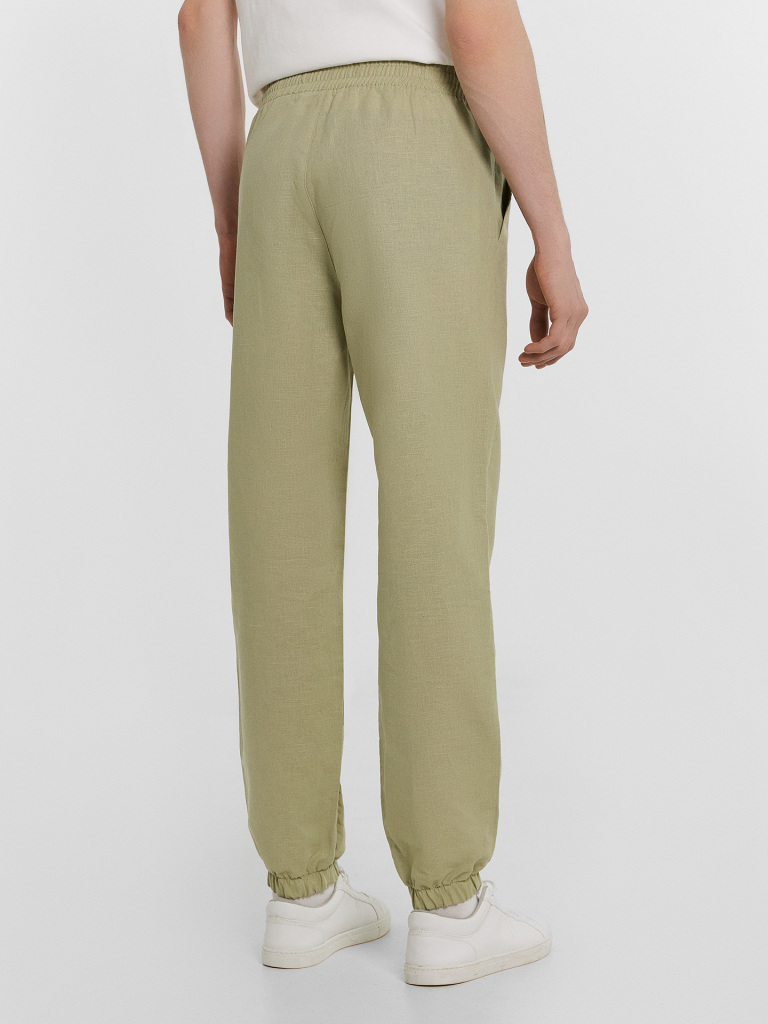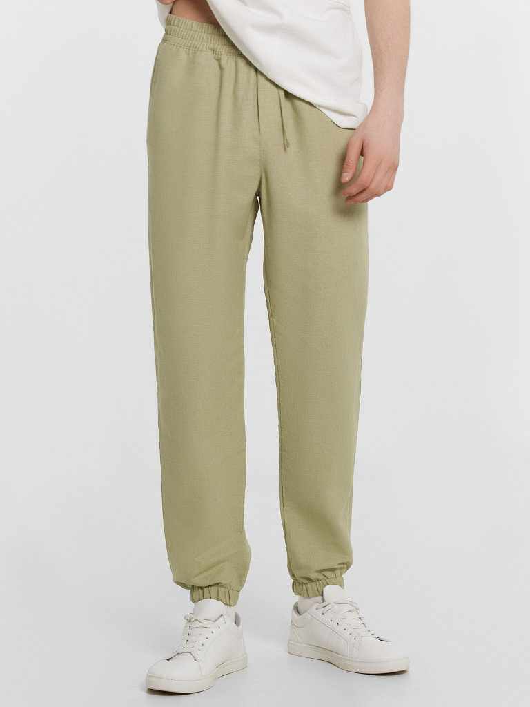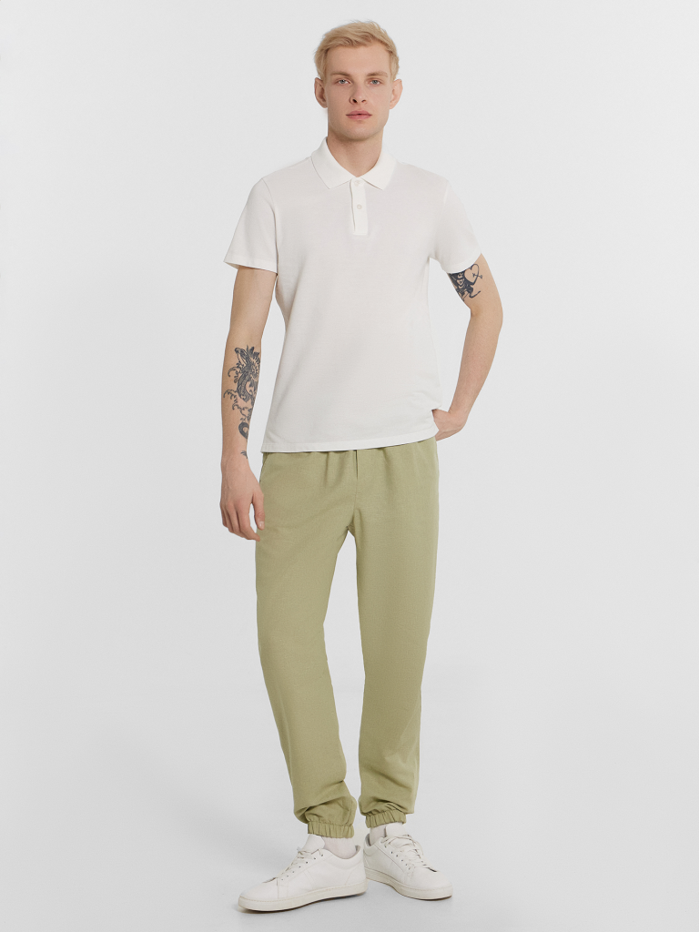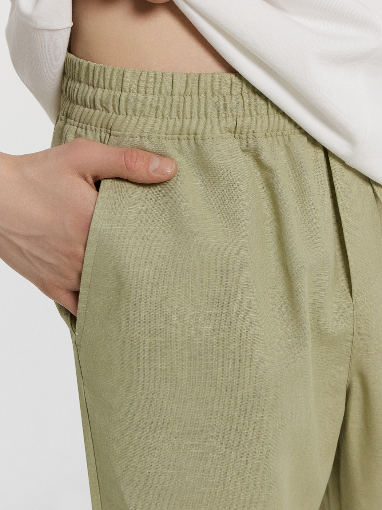 Текстильные брюки классической длины из натурального хлопка и льна. Силуэт свободный, немного зауженный к низу. Пояс с эластичной тесьмой внутри и регулировочным шнуром. Есть карманы-хулиганы. По низу штанин – эластичная тесьма. Гульфик не функциональный, имитация. Стильные брюки!