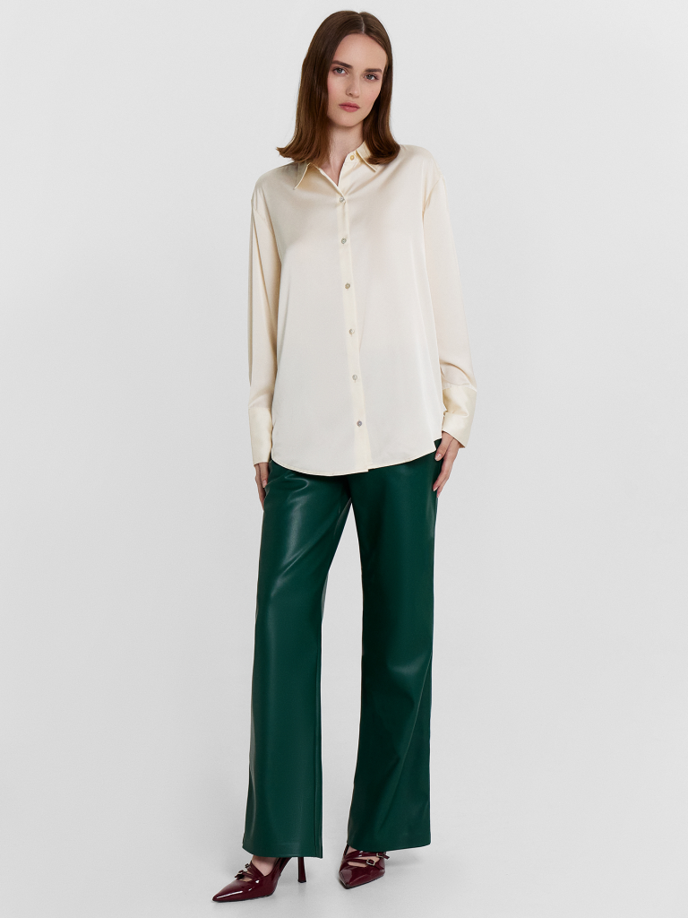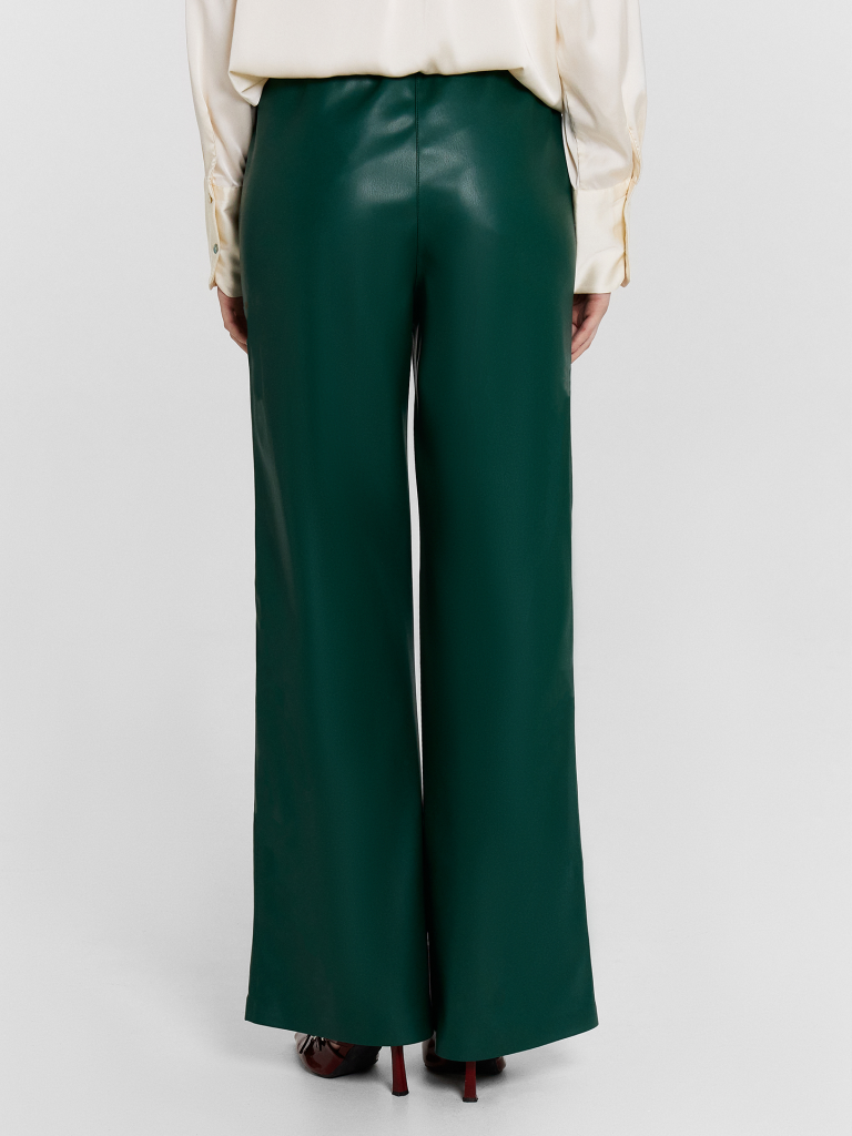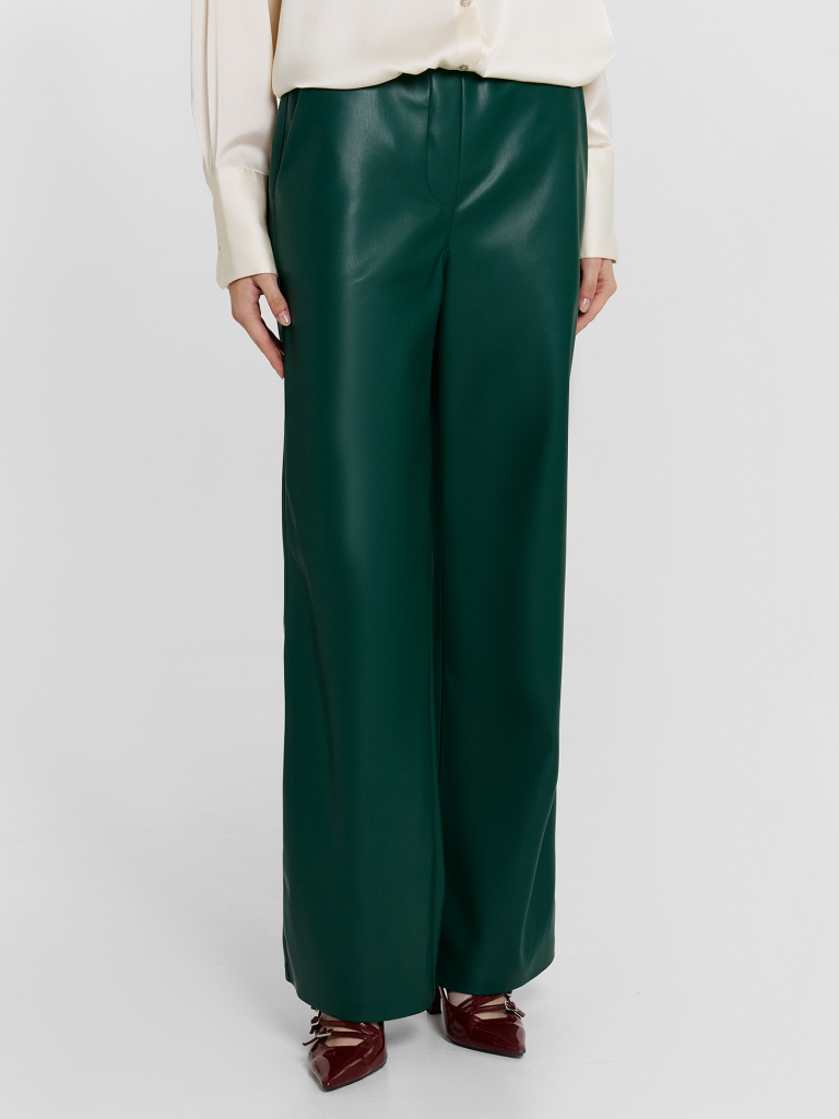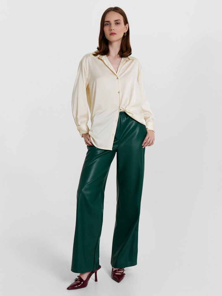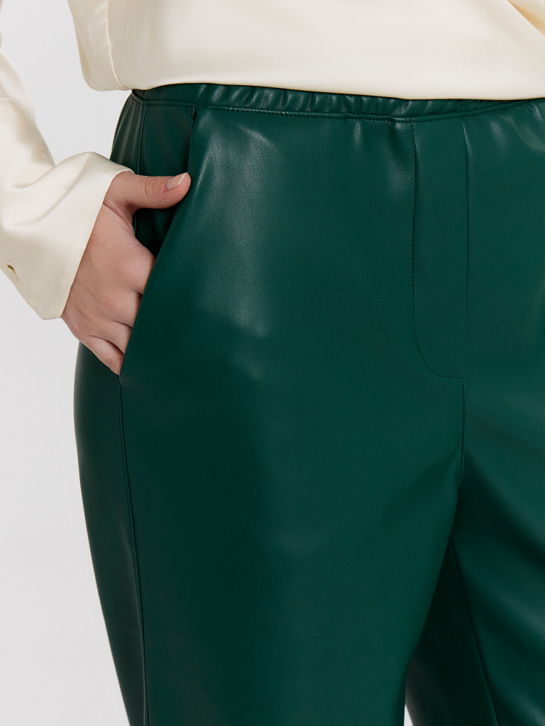 Эти женские брюки «под кожу» — смелый выбор для стильного образа! Свободный силуэт обеспечивает удобную посадку и комфорт в движении, а эластичная тесьма внутри пояса гарантирует идеальную фиксацию без ощущения стеснения. Функциональные боковые карманы-хулиганы добавляют практичности, а подкладка из подкладочной ткани делает их ещё более удобными. Декоративная строчка на правой передней половинке имитирует гульфик, придавая модели стильный акцент. Подклеенные нижние срезы обеспечивают аккуратность и долговечность изделия. Эти брюки станут идеальной базой для эффектных образов — сочетайте их с кроп-топами, пиджаками или объемными свитерами для выразительного и современного стиля.