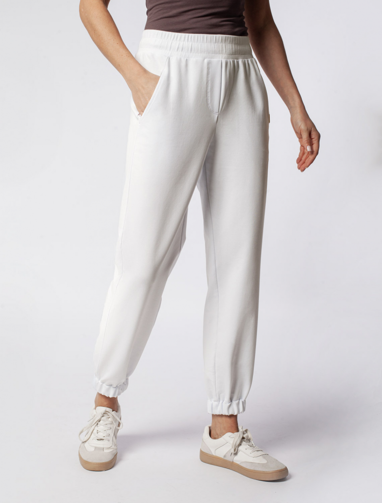 Брюки выполнены из эластичного футера двухнитки. Изделие дополнено боковыми карманами с фирменным логотипом бренда. Пояс на резинке регулируется потайным хлопковым шнурком. Эластан в составе гарантирует комфорт и формоустойчивость. Модель сочетается в костюме с свитшотом D49.072 и паркой D49.076
