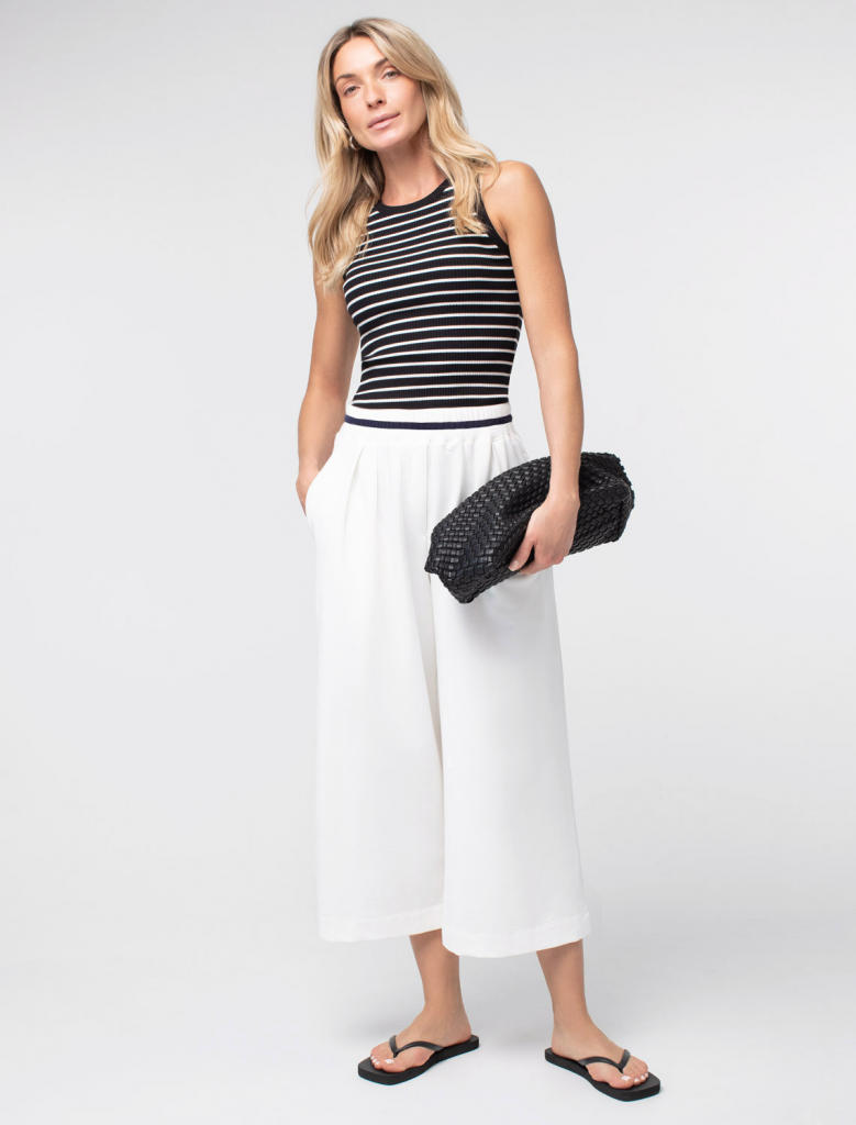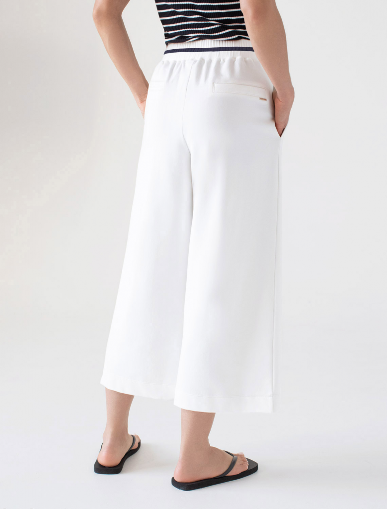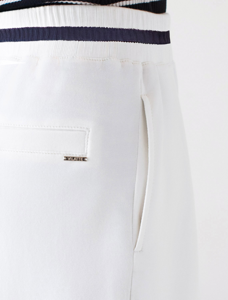 Свободные брюки прямого силуэта выполнены из эластичного футера двухнитки. Длина изделия до щиколотки. В боковых швах расположены карманы. Внутренняя часть кармана из тонкого хлопка в тон полотна. Модель дополнена эластичным поясом, с контрастной полосой и золотистым логотипом бренда. Сочетается в костюме с джемпером D49.083 и D49.086