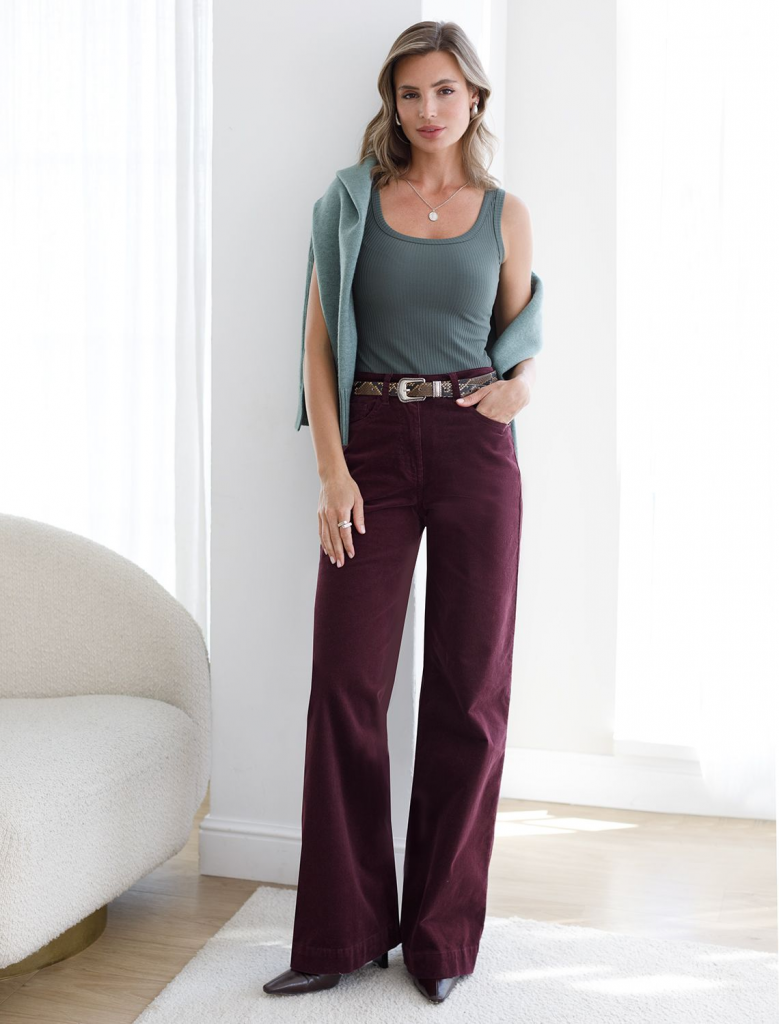 Брюки свободного кроя «трубы» выполнены из мягкого хлопкового микро-вельвета с добавлением эластана. Изделие комфортно садится по фигуре и не сковывает движения. Модель с пятью карманами, как у джинсов дополнена высококачественной фурнитурой с фирменным логотипом бренда. Идеально впишутся в повседневный образ, со свитером крупной вязки, курткой-косухой, ботинками на грубой подошве, челси и казаками.