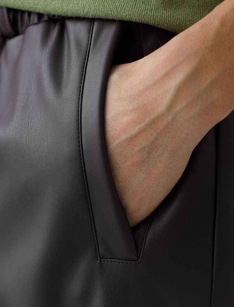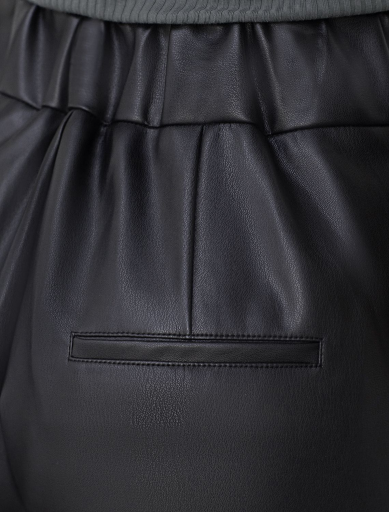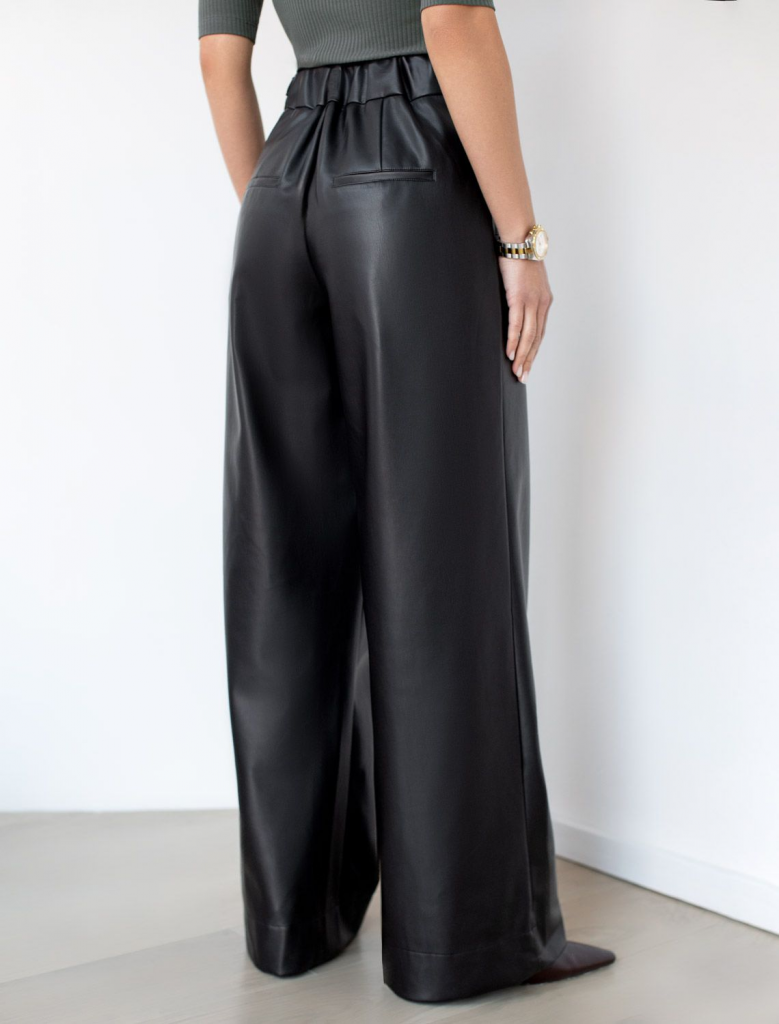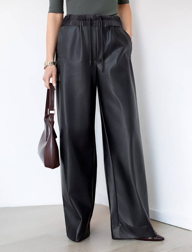 Трендовая модель для смелых fashion-образов. Эти брюки из качественной искусственной кожи создают бунтарский урбанистический лук. Модель с высокой посадкой на поясе и равномерно широким клешёным силуэтом от бедра до низа визуально вытягивает фигуру. Мягкая подкладка пояса обеспечивает комфорт, не сдавливая талию. Универсальный черный цвет легко комбинируется с объемными худи, кроп-топами или лаконичными рубашками. Идеальны для создания образов в стиле гранж, streetwear или modern rock-chic.