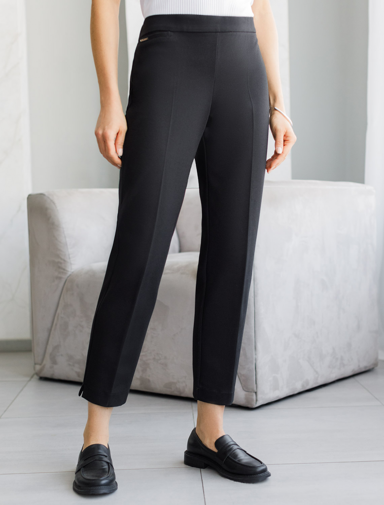 Брюки-дудочки выполнены из джерси. Модель дополнена резинкой сзади, одним вместительным карманом спереди и небольшими боковыми разрезами. Заутюженные стрелки и посадка на талии визуально вытягивают силуэт. Изделие хорошо держит форму, отлично тянется и почти не мнется во время использования. Идеальный вариант в офис или в повседневный классический стиль.