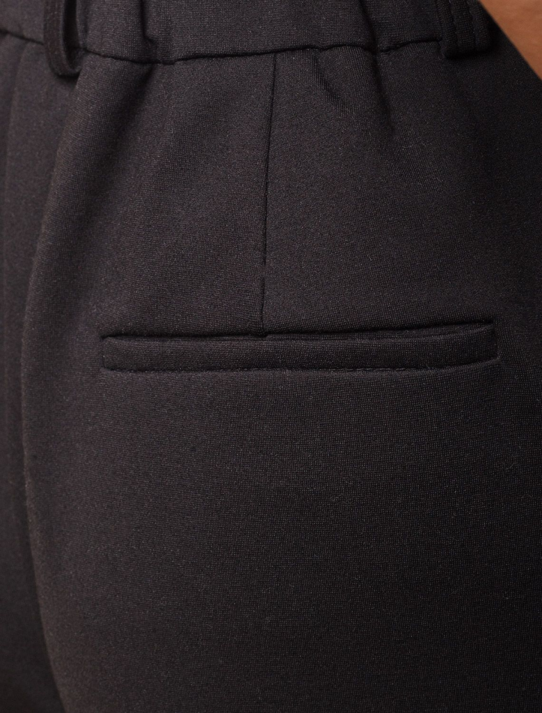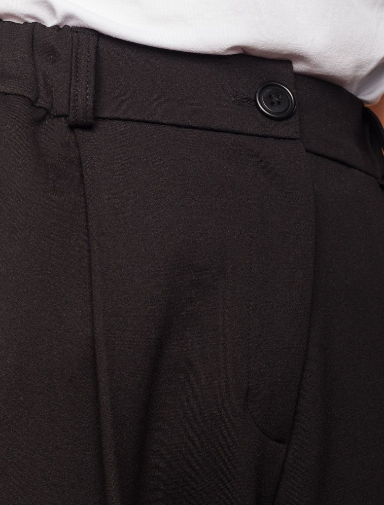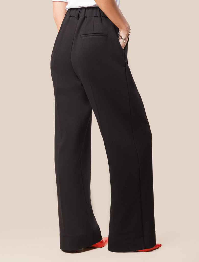 Брюки-палаццо выполнены из костюмной ткани. Свободная модель дополнена карманами и поясом на резинке сзади. Посадка на талии и заутюженные стрелки визуально удлиняют ноги и вытягивают силуэт. Идеальный вариант для офисного дресс кода или в повседневный классический стиль.