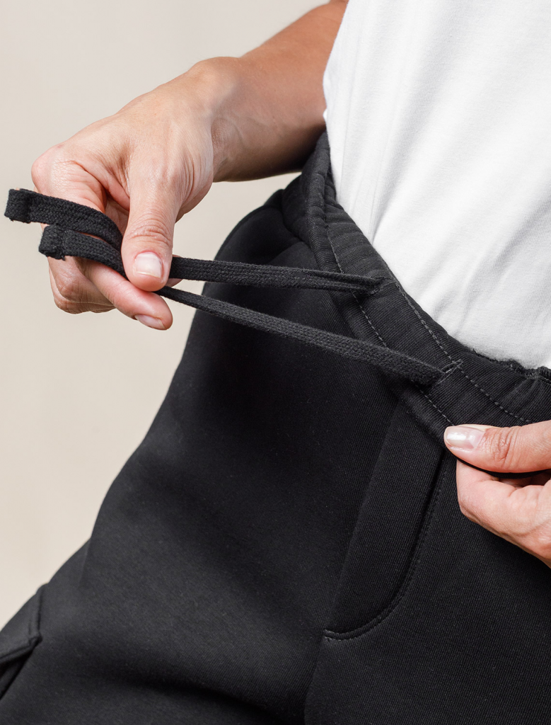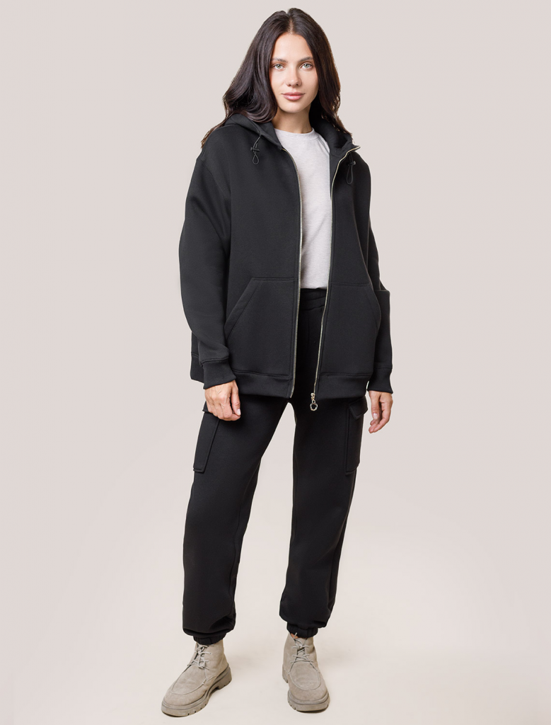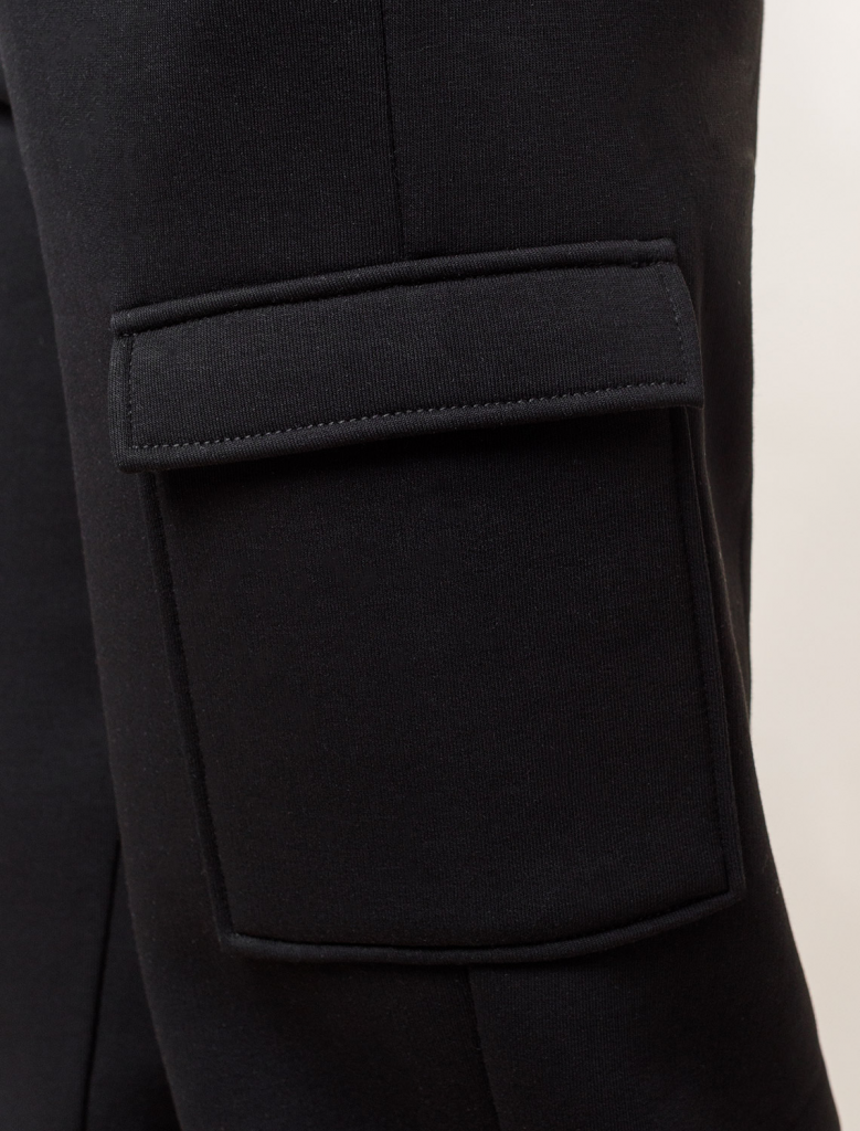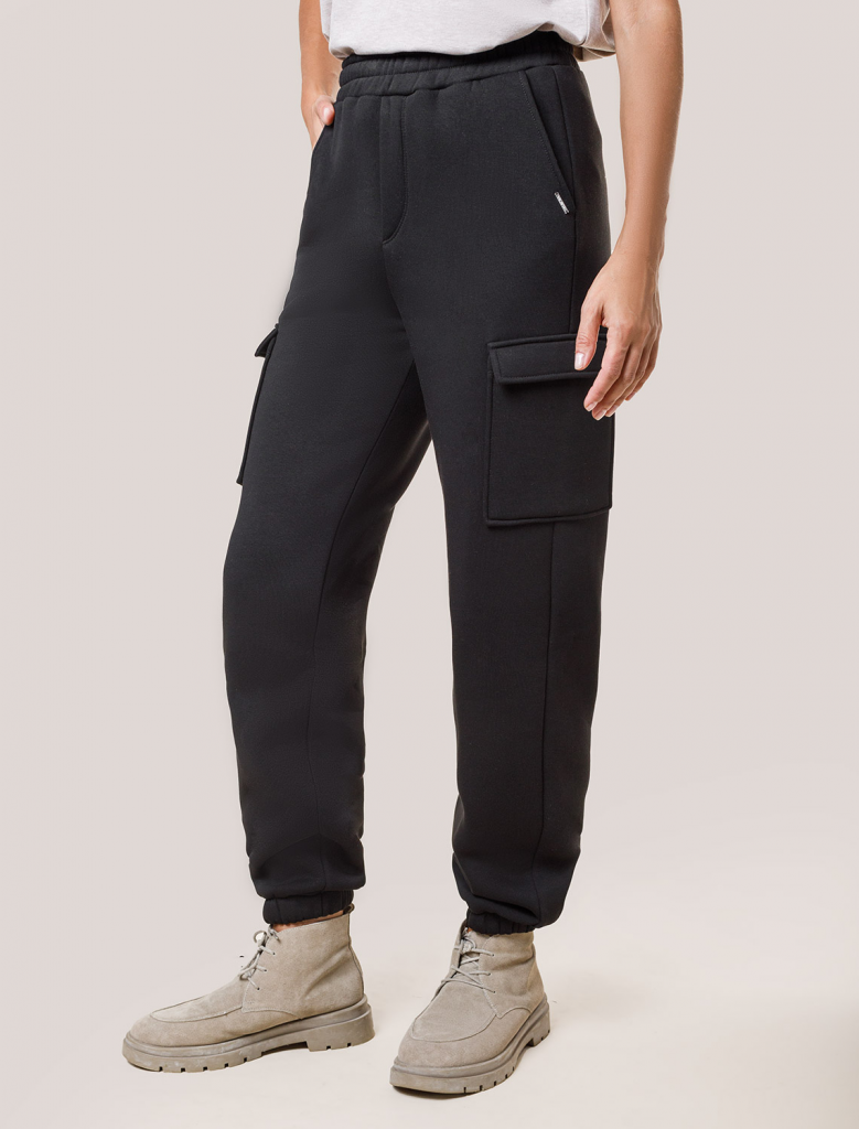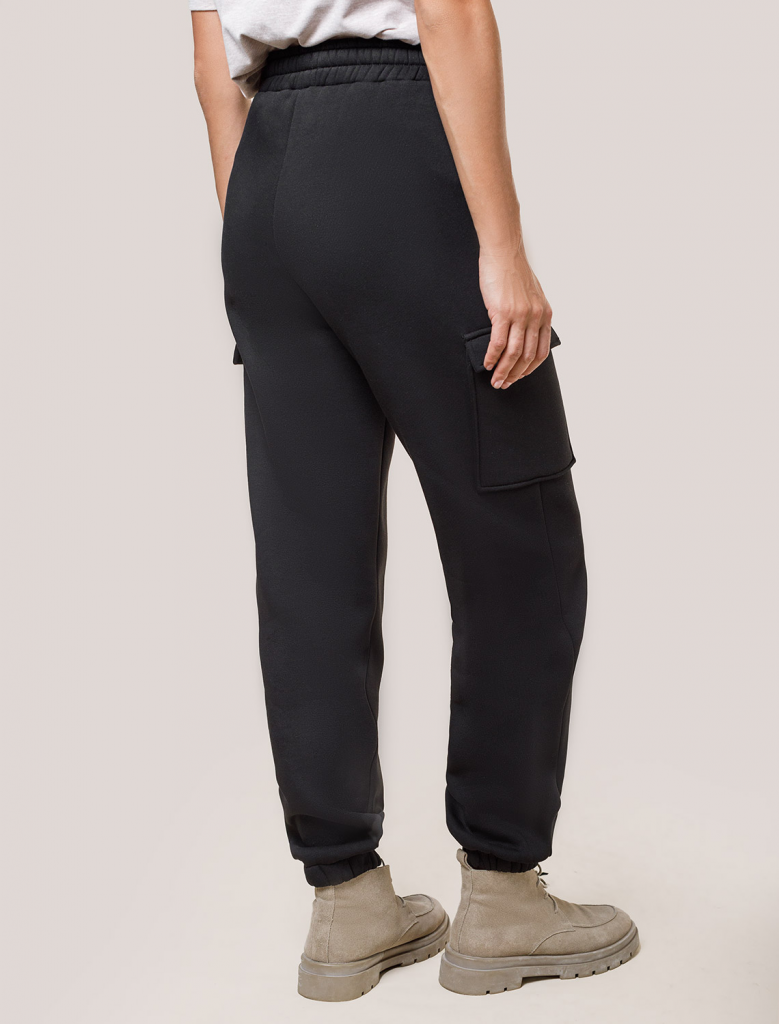 Практичные и комфортные свободные джоггеры черного цвета отлично подойдут для активного отдыха и повседневных прогулок. Теплые джоггеры выполнены из футера трехнитки с мягким начесом, обеспечивающего тепло и уют в прохладную погоду. Эластичная резинка на поясе гарантирует удобную посадку и свободу движений, а зауженные штанины создают современный стильный силуэт. Подойдут женщинам на любую фигуру, на объемные и женственные формы или на худеньких девушек, а так же на высокий или низкий рост, благодаря универсальной длине. Натуральный материал отличается высокой износостойкостью, поэтому штаны сохранят презентабельный вид даже после долгого периода активной носки. Эти функциональные брюки незаменимы для путешествий и спортивных занятий на улице. По бокам расположены большие карго карманы с клапаном, которые позволяют удобно хранить мелкие вещи под рукой. Спортивный стиль сочетается с элементами милитари, что делает трендовые брюки актуальными для современных тенденций.Универсальные джоггеры станут надежн