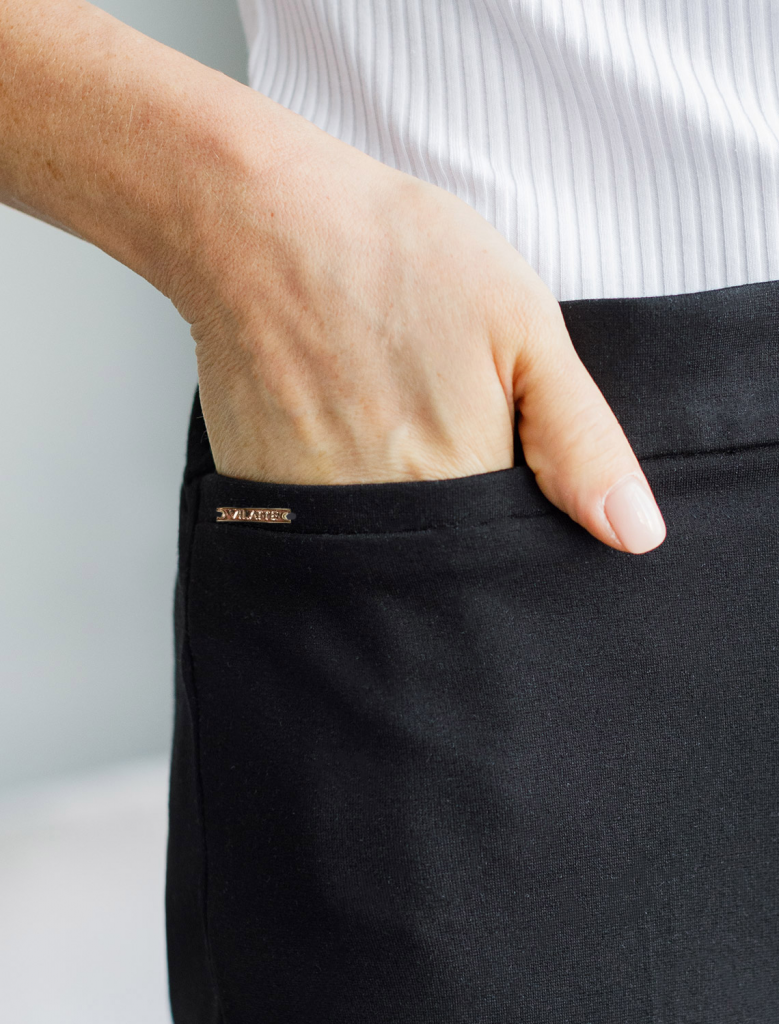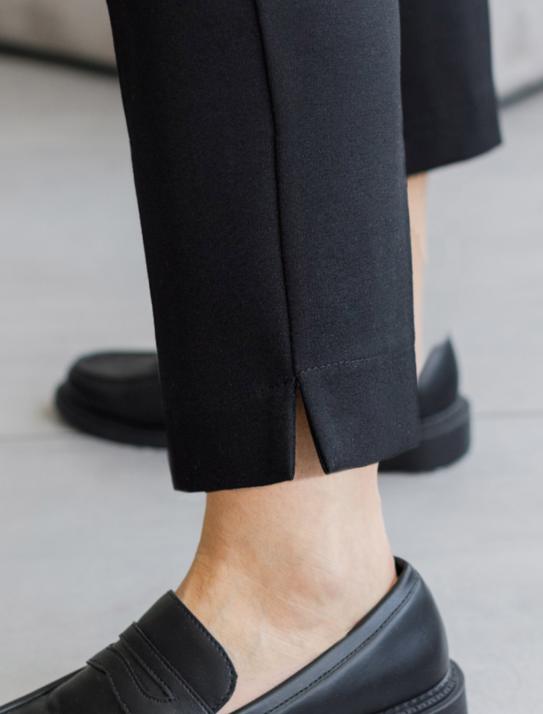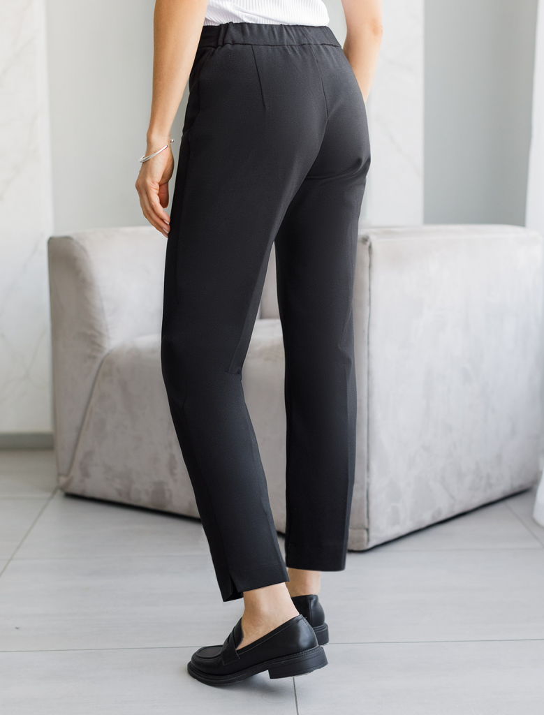 Брюки-дудочки выполнены из джерси. Модель дополнена резинкой сзади, одним вместительным карманом спереди и небольшими боковыми разрезами. Заутюженные стрелки и посадка на талии визуально вытягивают силуэт. Изделие хорошо держит форму, отлично тянется и почти не мнется во время использования. Идеальный вариант в офис или в повседневный классический стиль.