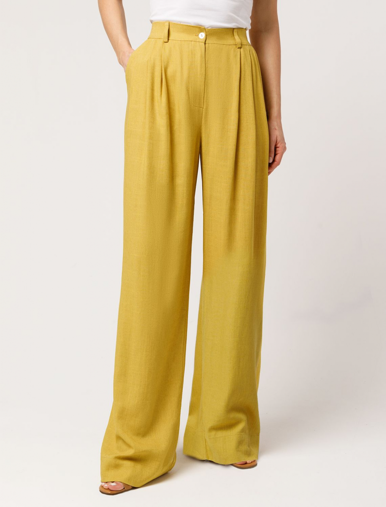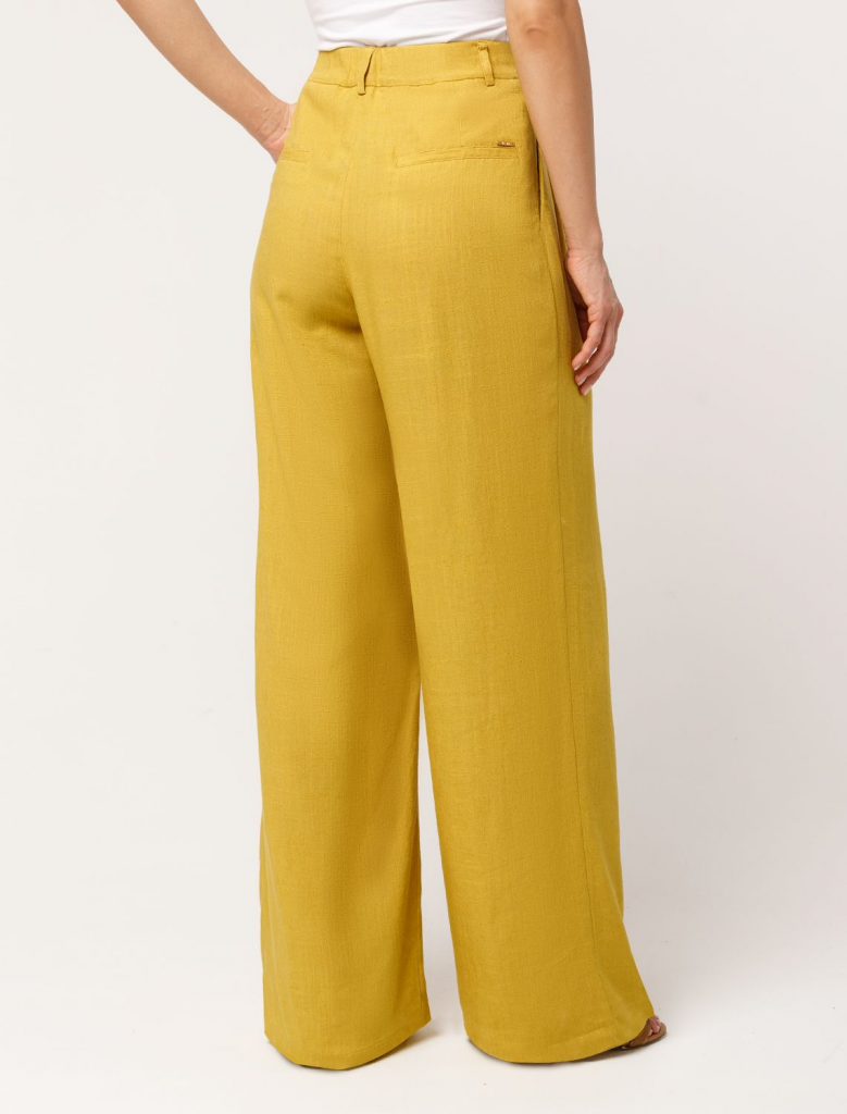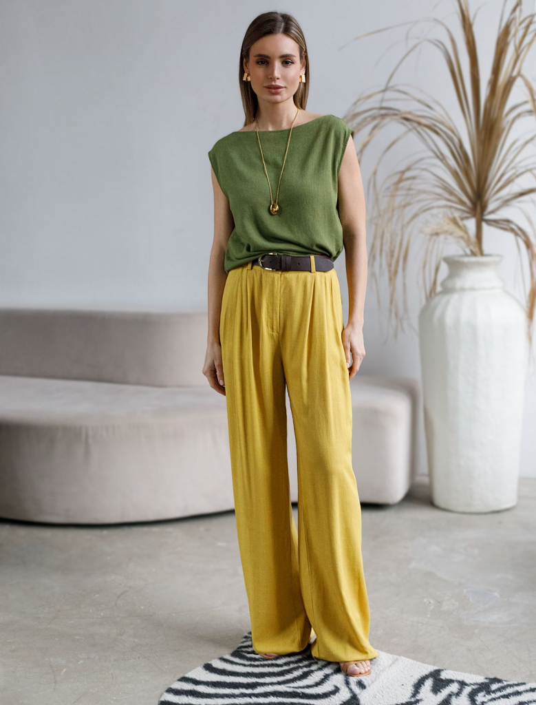 Брюки-палаццо выполнены изо льна с вискозой. Свободная модель с посадкой на талии визуально вытягивает силуэт и создает роскошный образ. Ткань изящно драпируется, струится по ногам, почти не мнется и сохраняет форму в течении долгого времени. Подходит для любой фигуры и скрывает недостатки. Сочетается в костюме с топом D23.060 и блузками D29.237, D29.244