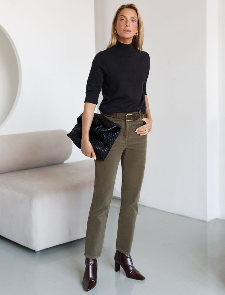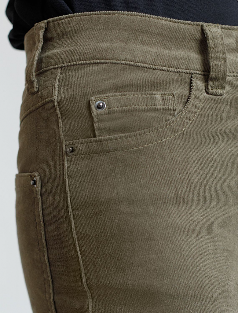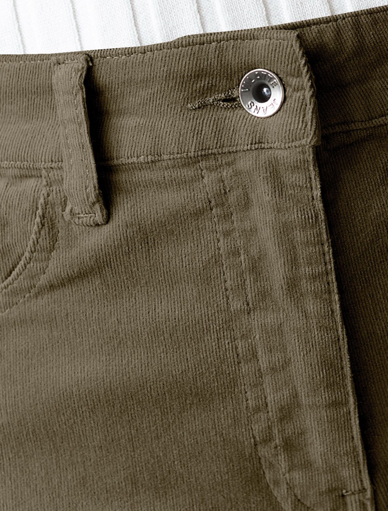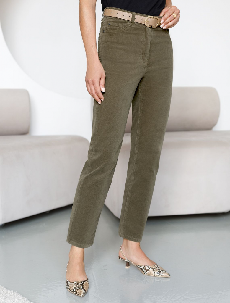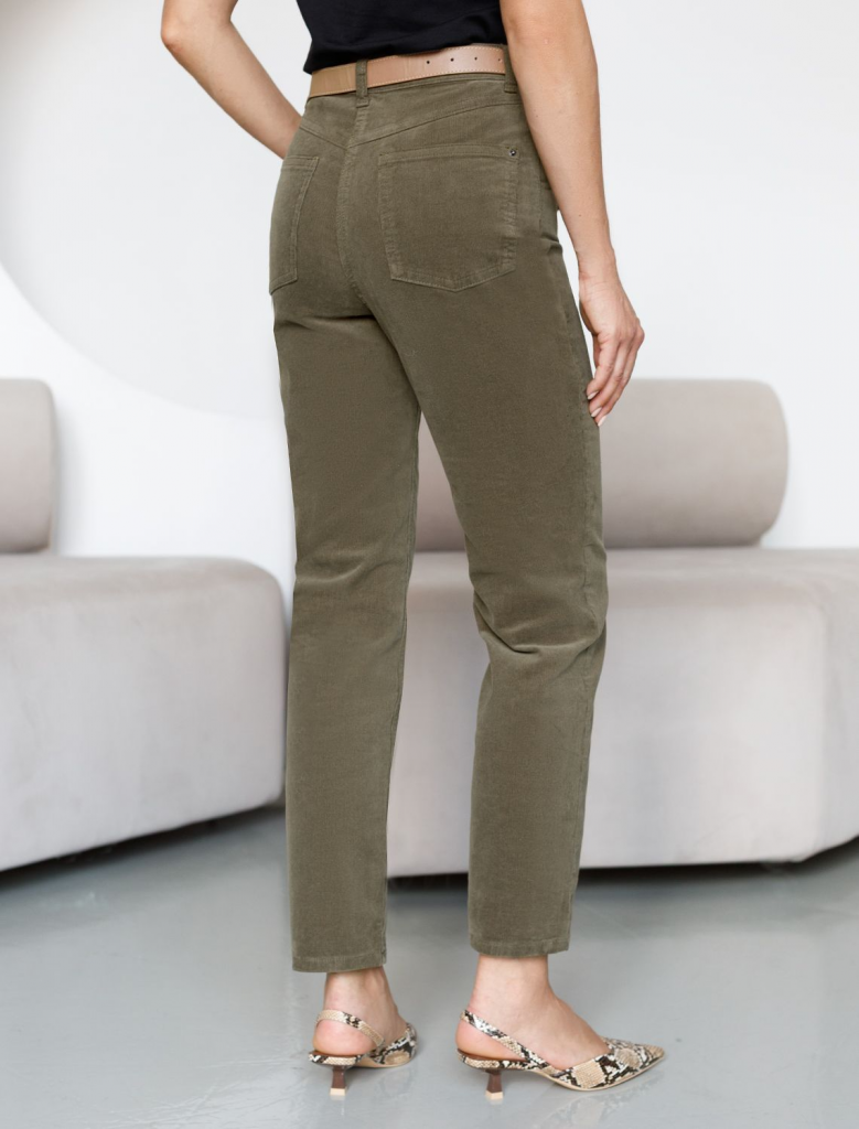 Брюки выполнены из мягкого хлопкового микро-вельвета с добавлением эластана. Изделие комфортно садится по фигуре и не сковывает движения. Модель с пятью карманами, как у джинсов-скинни дополнена высококачественной фурнитурой с фирменным логотипом бренда. Хорошо комбинируется с вязаным трикотажем, блузками и денимом. Как альтернатива брюкам, в нестрогий офисный дресс-код.