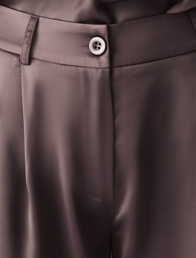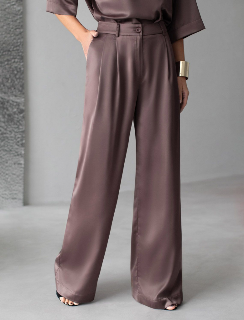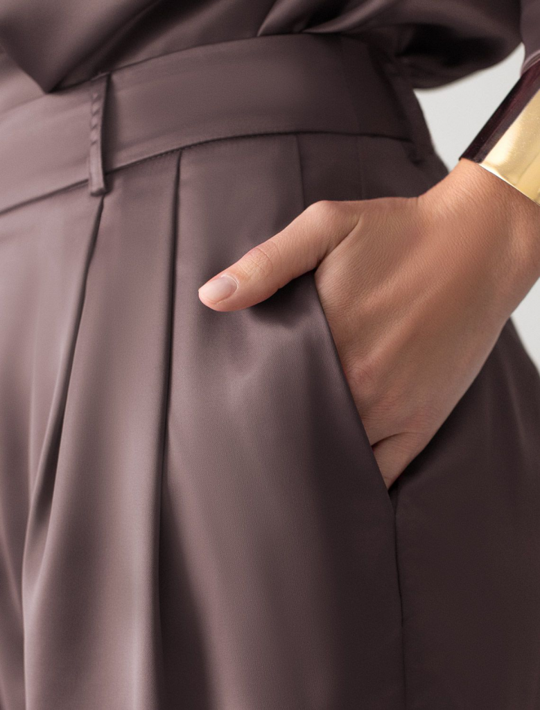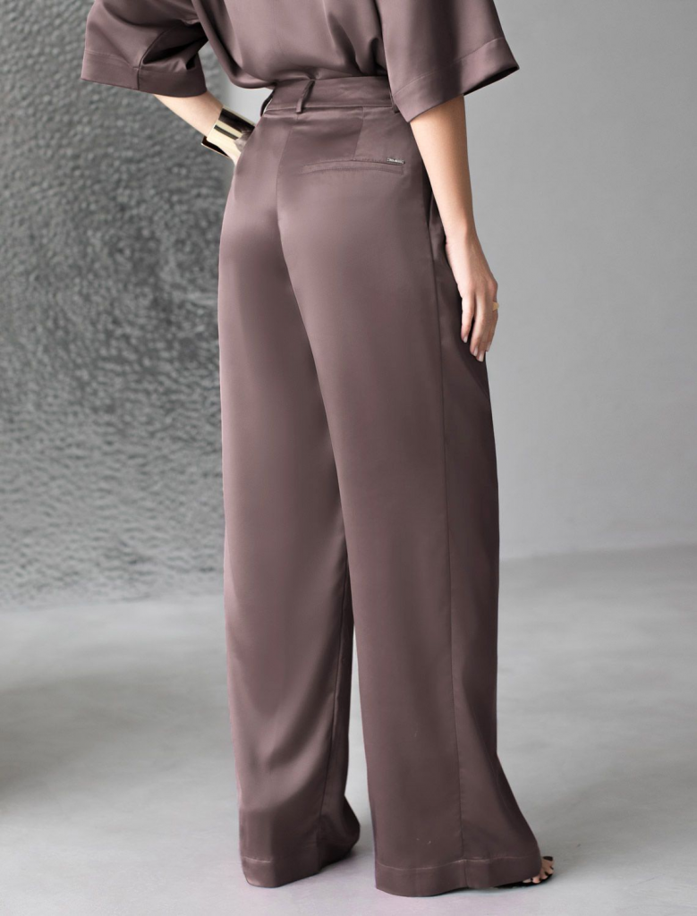 Брюки палаццо кофейного цвета из струящегося сатина, который придает образу эффектный и стильный вид. Мягкий сатин приятен к телу, в них комфортно на протяжении долгой носки. Брюки длиной в пол визуально вытягивают силуэт и подходят как для высоких, так и для женщин низкого роста. Модель идеально садится на большие размеры, не сковывая движений. Благородный материал обеспечивает не только привлекательный внешний вид, но и ощущение легкости в носке. Высокая посадка выгодно подчеркивает фигуру, добавляя изящества и современного шарма, они струятся при каждом движении.Нарядные широкие брюки сочетают в себе красоту и функциональность, созданы для женщин, которые ценят дорогой внешний вид без лишних усилий, идеально подходят для создания праздничного образа, сочетая комфорт и элегантность. Брюки универсальны: их легко сочетать с блузками, топами или жакетами для создания образа как на событие, так и для повседневных выходов. Такой фасон остается актуальным вне зависимости от сезона или модных тенденций.