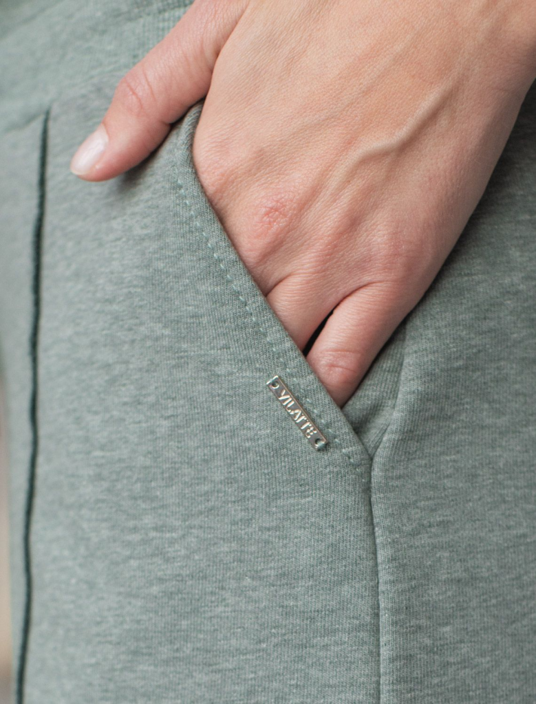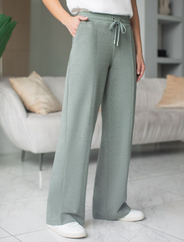 Брюки прямого кроя с удобным эластичным поясом на резинке и карманами по бокам выполнены из премиального футера-двухнитки. Наличие эластана в составе гарантирует комфорт и долговечность изделия, материал хорошо пропускает воздух, позволяя телу дышать.. Эти уютные брюки нежного оливкового цвета с эффектом меланж созданы для вашего комфорта. Свободный прямой крой обеспечивает свободу движений и максимальное удобство в любых ситуациях, поэтому они подойдут и на большие размеры, а так же на высокий или низкий рост. Фигура подчеркивается, а силуэт визуально вытягивается за счет кроя палаццо и застроченных декоративных стрелок. Вы можете создать стильный образ на каждый день в сочетании с джемпером D49.139 и бомбером D49.141. В повседневных трикотажных брюках вы будете чувствовать себя комфортно и уверенно, наслаждаясь каждым моментом дня.