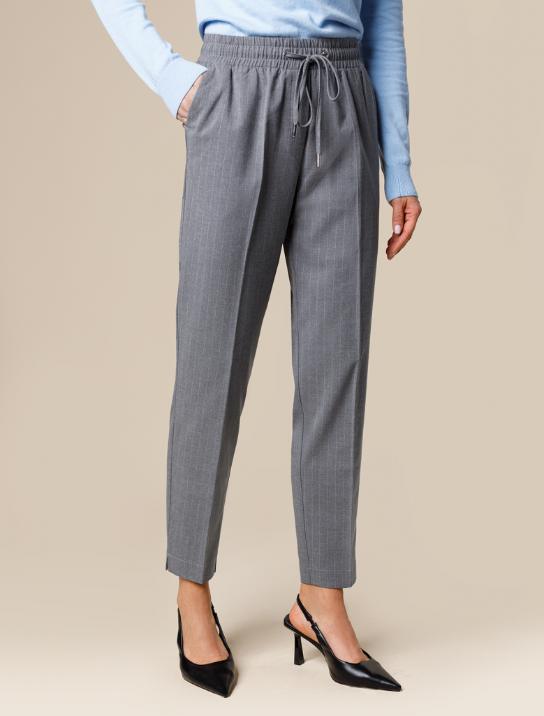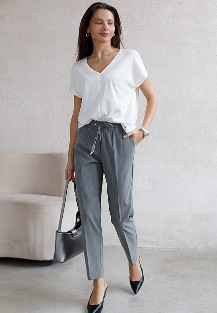 Брюки выполнены из премиальной поливискозы. Модель дополнена поясом на резинке с регулируемым шнурком. Изделие хорошо подойдет как для строгого делового образа с блузкой и жакетом, так и для более расслабленного с футболкой и водолазкой. Эластичный материал изделия поддерживает оптимальный микроклимат, формоустойчивость и комфорт в течение всего дня.
