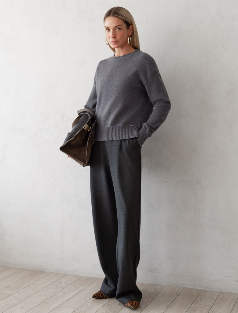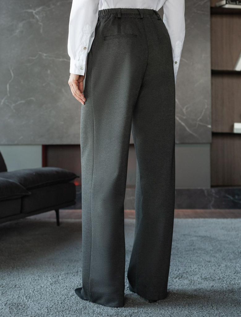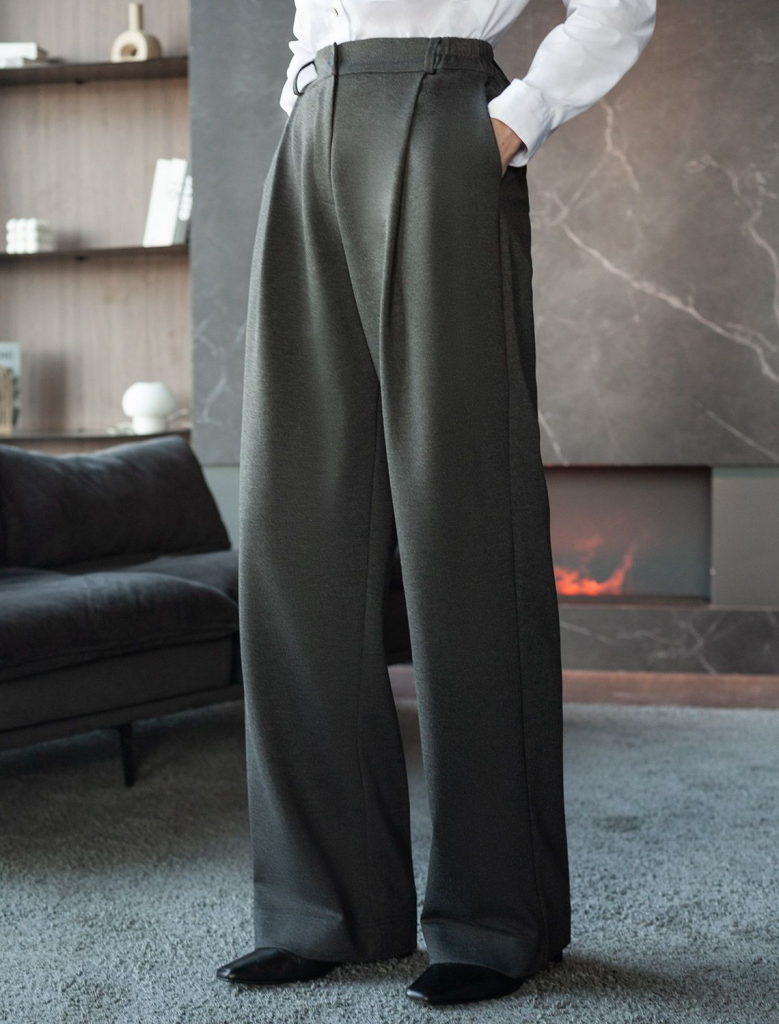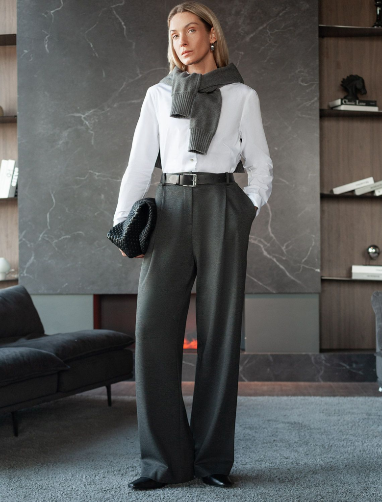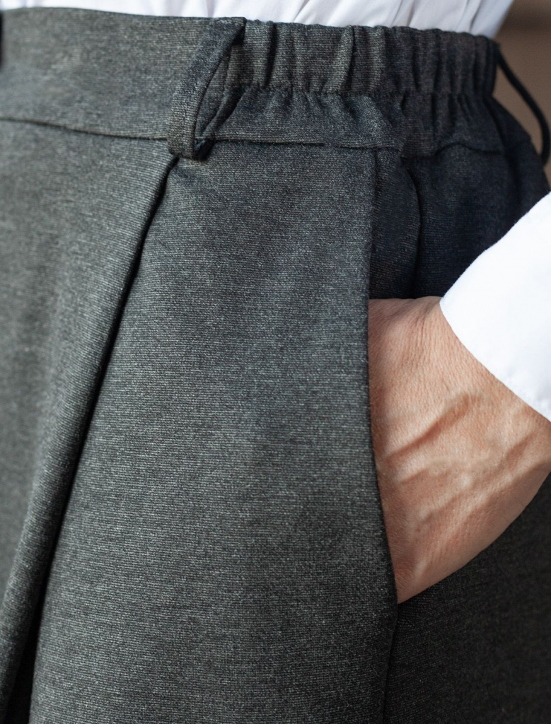 Брюки-палаццо выполнены из костюмной ткани. Свободная модель дополнена карманами и поясом на резинке сзади. Посадка на талии и заутюженные стрелки визуально удлиняют ноги и вытягивают силуэт. Идеальный вариант для офисного дресс кода или в повседневный классический стиль.
