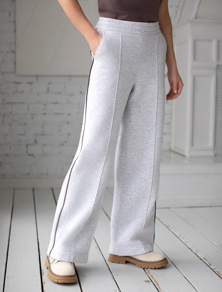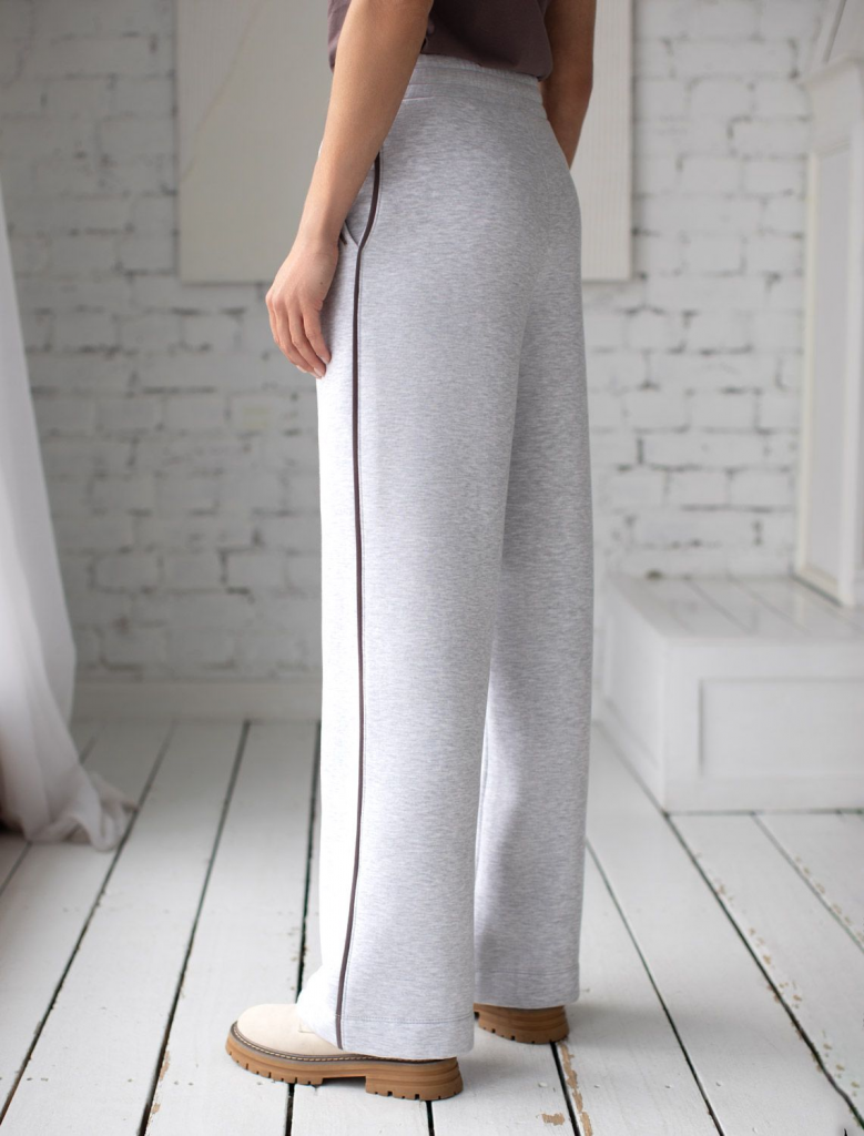 Теплые прямые брюки серого цвета с эффектом меланж из эластичного футера трехнитки с начесом созданы для максимального комфорта в холодную погоду. Мягкий материал приятный к телу, хорошо держит форму, не вытягивается и не теряет форму даже при активной носке. Благодаря дышащим свойствам премиального футера, брюки подходят на любую погоду, обеспечивая оптимальный микроклимат и уют. Свободный крой и эластичный широкий пояс делает посадку удобной для разных типов фигуры и размеров, включая большие и маленькие. Застроченные стрелки визуально вытягиват силуэт и подчеркивают эстетичнось повседневных брюк, а контрастные тонкие лампасы добавляют актуальности образу. Благодаря особенностям трехниточного плетения и внутреннему слою с начесом, эти брюки отлично сохраняют тепло в холодные осенние и зимние дни, при этом в них вы будете выглядеть модно и современно. Сочетайте в комплекте с худи D49.142.