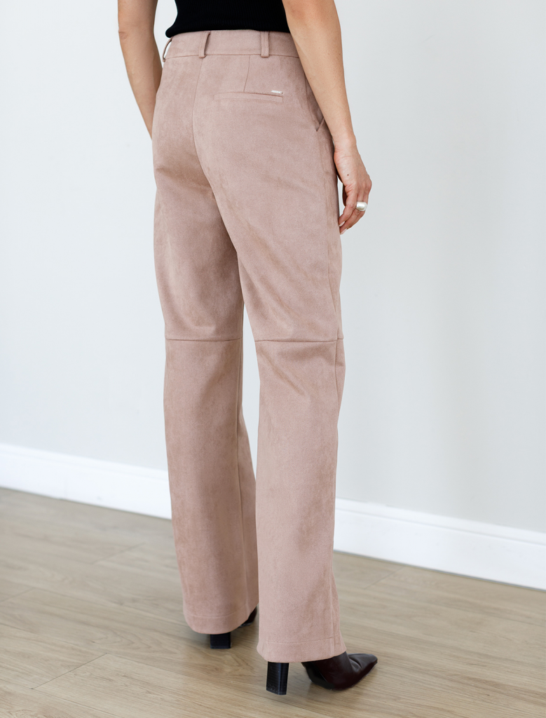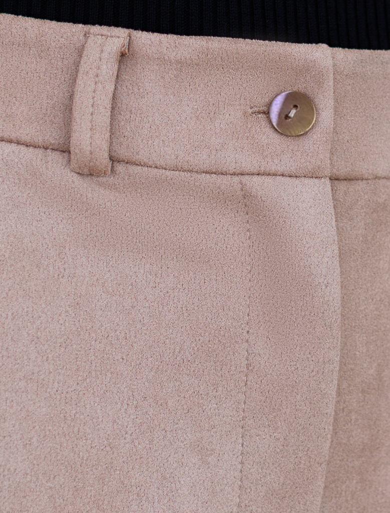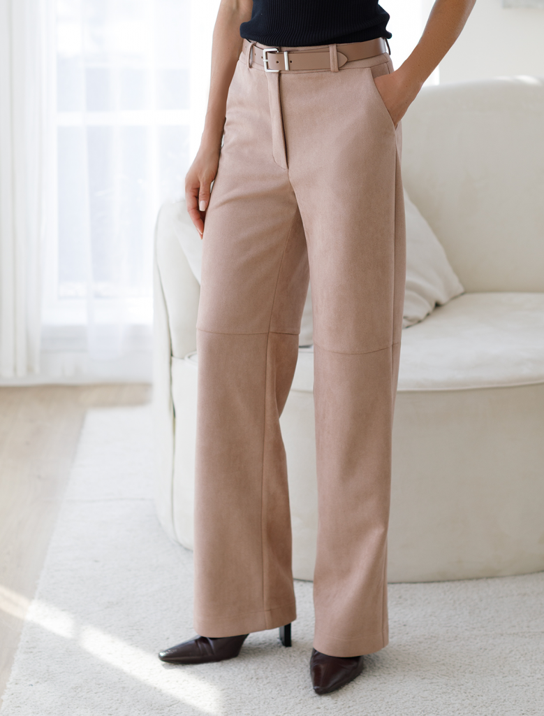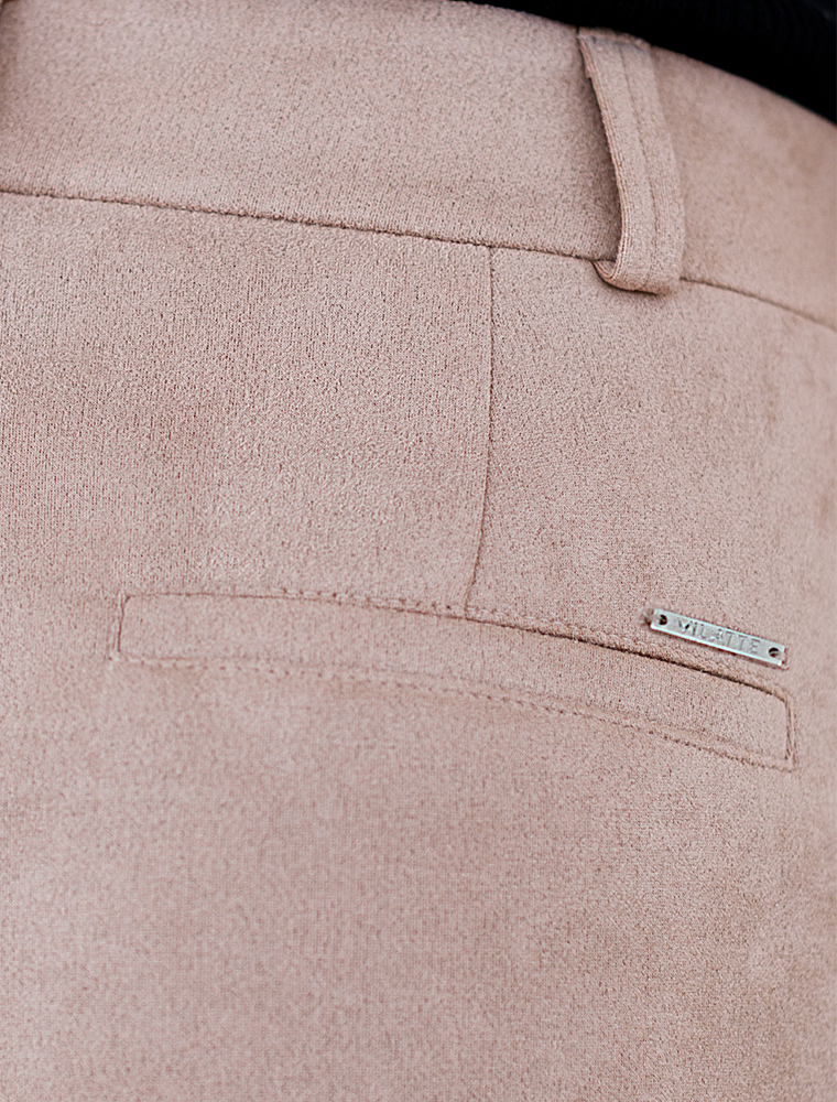 Брюки прямого кроя выполнены из мягкой искусственной замши. Модель с декоративными швами дополнена боковыми карманами и одним задним карманом. Мягкий материал в точности имитирует натуральную замшу, но в уходе и носке более практичный. Внутренняя сторона изделия без подклада, гладкая и приятная к телу. Брюки легко комбинируются с любыми блузками, лонгсливами, свитерами и водолазками.