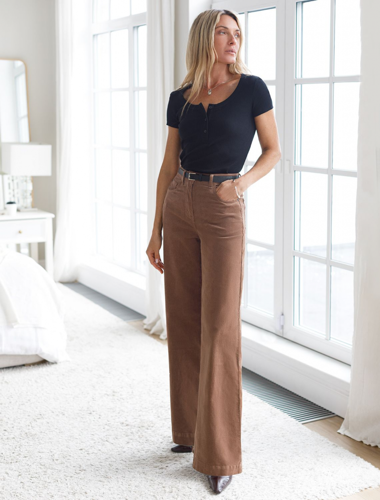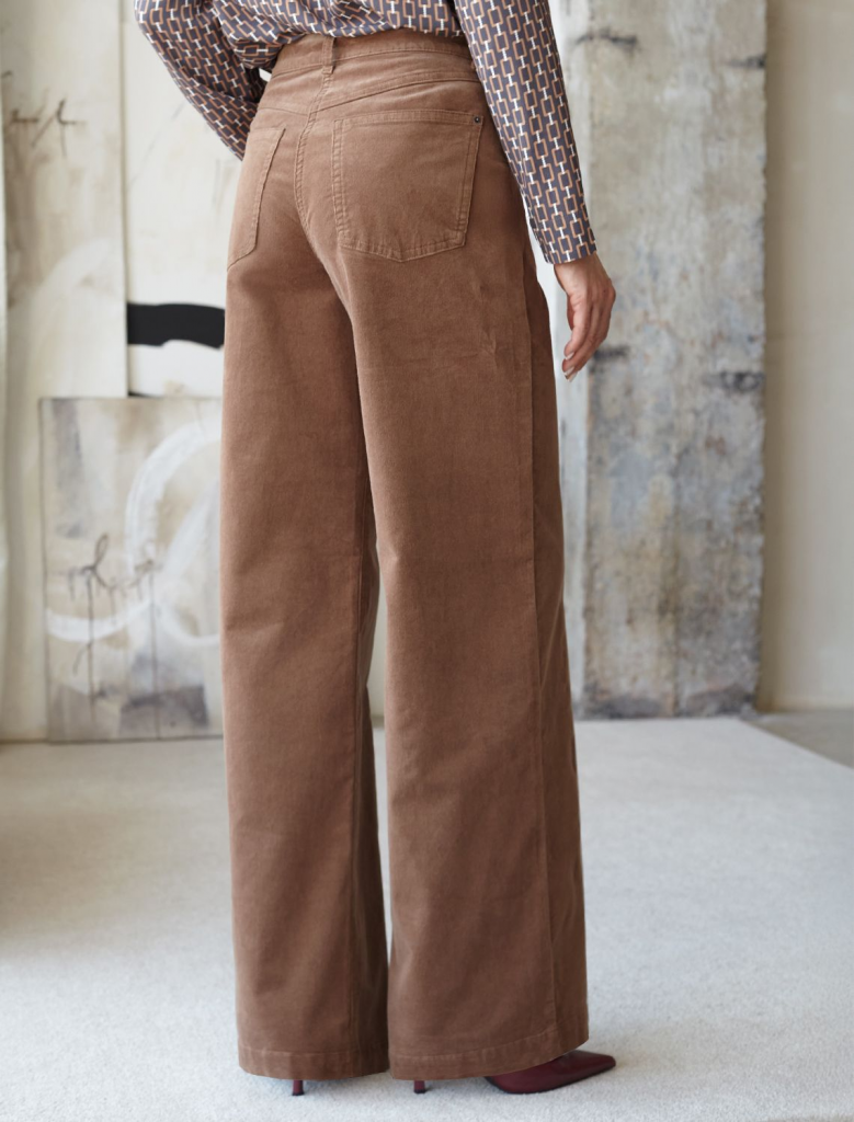 Брюки свободного кроя «трубы» выполнены из мягкого хлопкового микро-вельвета с добавлением эластана. Изделие комфортно садится по фигуре и не сковывает движения. Модель с пятью карманами, как у джинсов дополнена высококачественной фурнитурой с фирменным логотипом бренда. Идеально впишутся в повседневный образ, со свитером крупной вязки, курткой-косухой, ботинками на грубой подошве, челси и казаками.