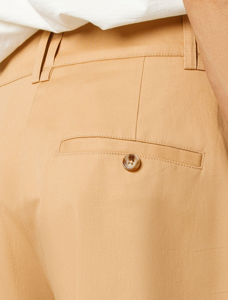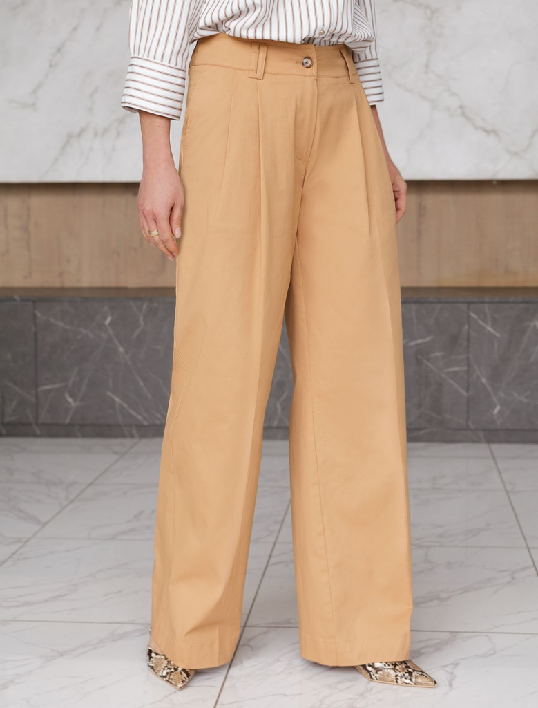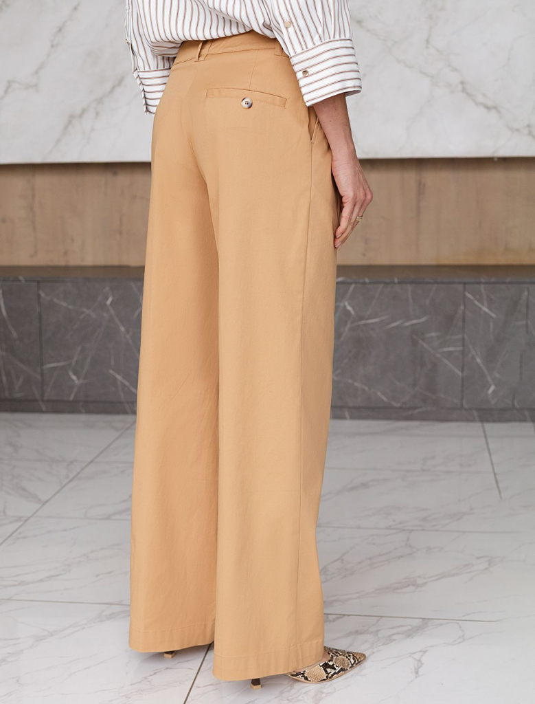 Брюки выполнены из хлопкового твила. Изделие дополнено двумя вариантами шлёвок, что позволяет использовать ремни разной ширины. Модель имеет два боковых и один задний карман. Защипы у пояса и стрелки вдоль брючины визуально вытягивают силуэт и подчеркивают талию. Благодаря наличию эластана в составе изделие сохранит свой безупречный внешний вид в течение долгого времени. Обладает высокой воздухопроницаемостью, в брюках будет комфортно даже в жаркое время года.