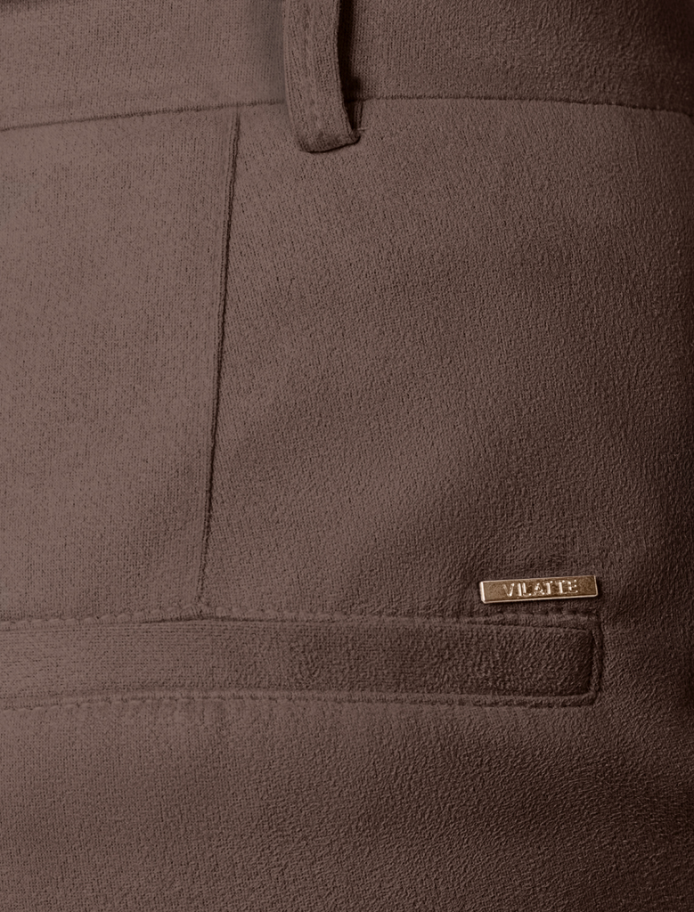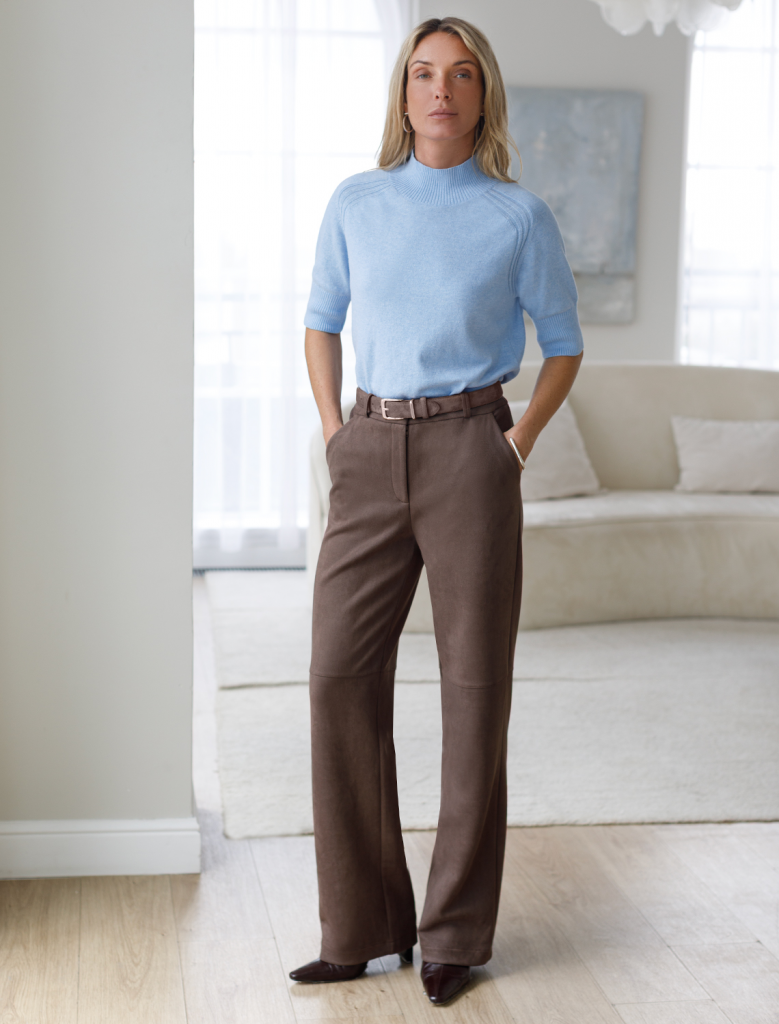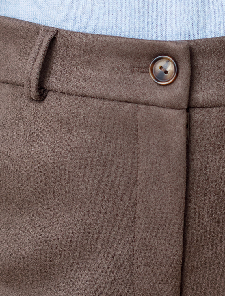 Брюки прямого кроя выполнены из мягкой искусственной замши. Модель с декоративными швами дополнена боковыми карманами и одним задним карманом. Мягкий материал в точности имитирует натуральную замшу, но в уходе и носке более практичный. Внутренняя сторона изделия без подклада, гладкая и приятная к телу. Брюки легко комбинируются с любыми блузками, лонгсливами, свитерами и водолазками.
