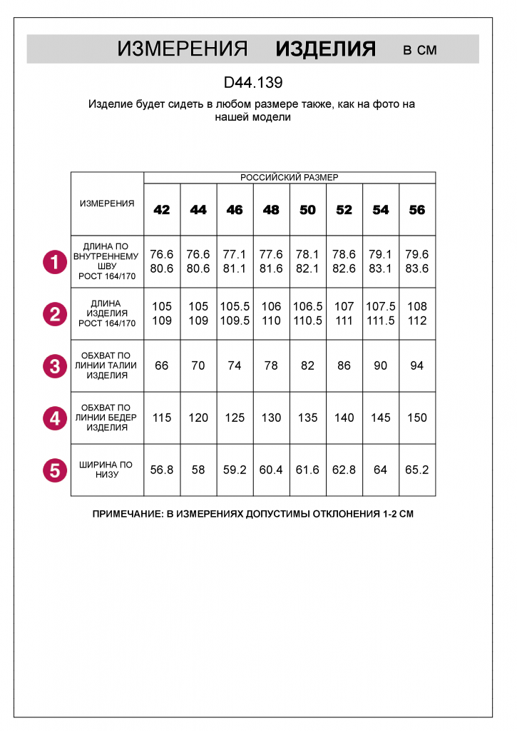 Брюки выполнены из футера двухнитки с эластаном. Модель прямого кроя дополнена боковыми карманами и одним задним карманом. Пояс выполнен из эластичного трикотажа в рубчик. В пояс вставлен плоский хлопковый шнур в тон изделия с золотистыми наконечниками. Изделие дополнено металлическим логотипом бренда. Сочетается в костюме с жакетом D49.078, джемпером D49.079, D49.080 и футболкой D49.081