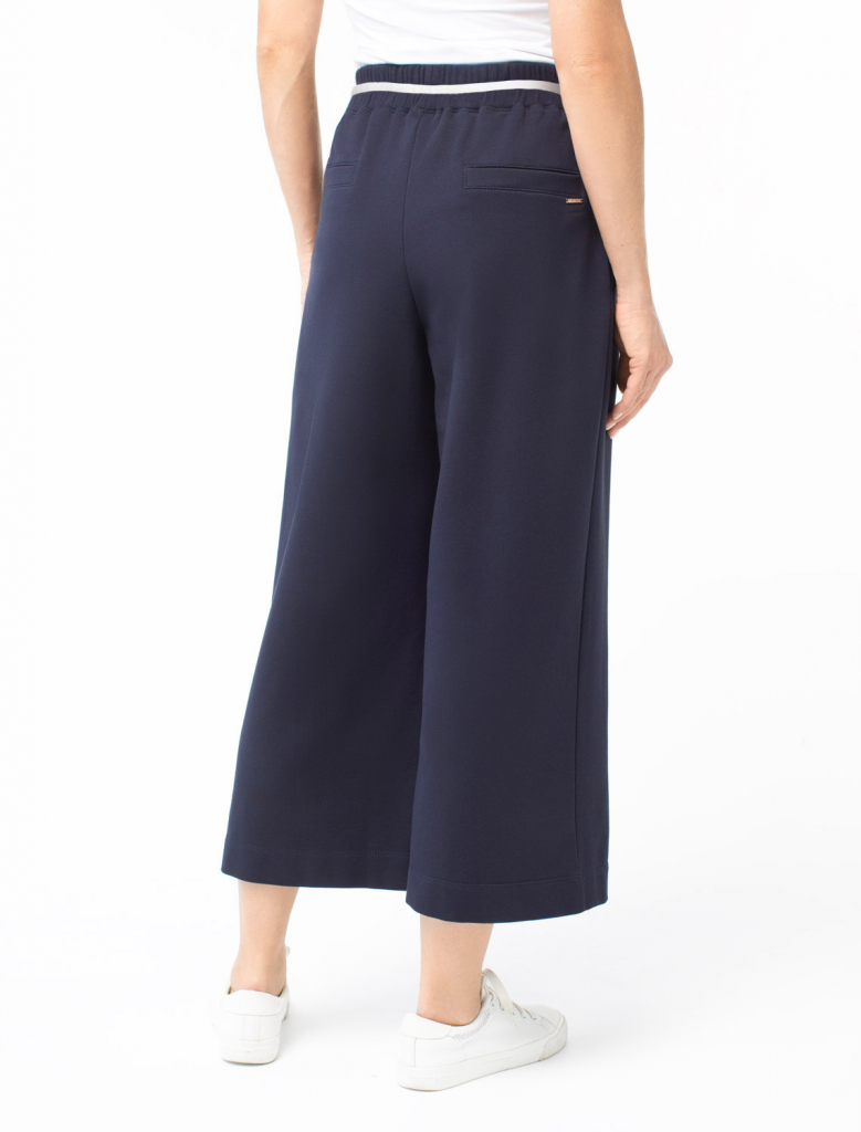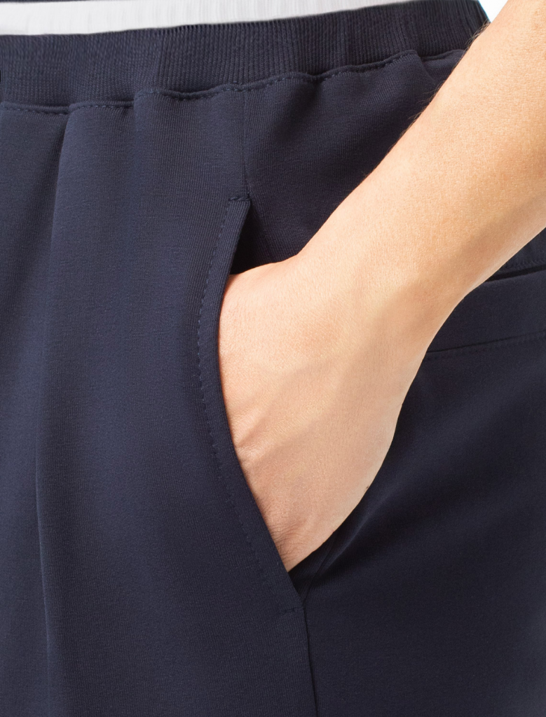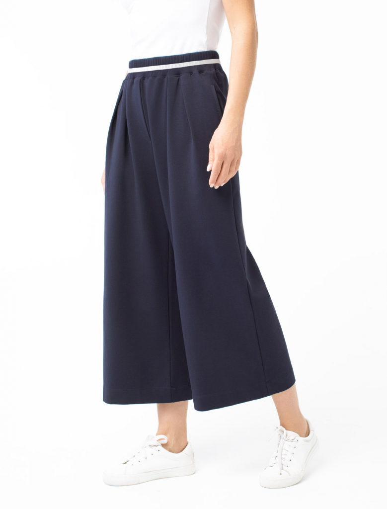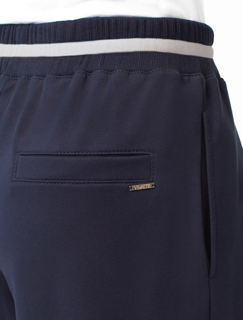 Свободные брюки прямого силуэта выполнены из эластичного футера двухнитки. Длина изделия до щиколотки. В боковых швах расположены карманы. Внутренняя часть кармана из тонкого хлопка в тон полотна. Модель дополнена эластичным поясом, с контрастной полосой и золотистым логотипом бренда. Сочетается в костюме с джемпером D49.083 и D49.086